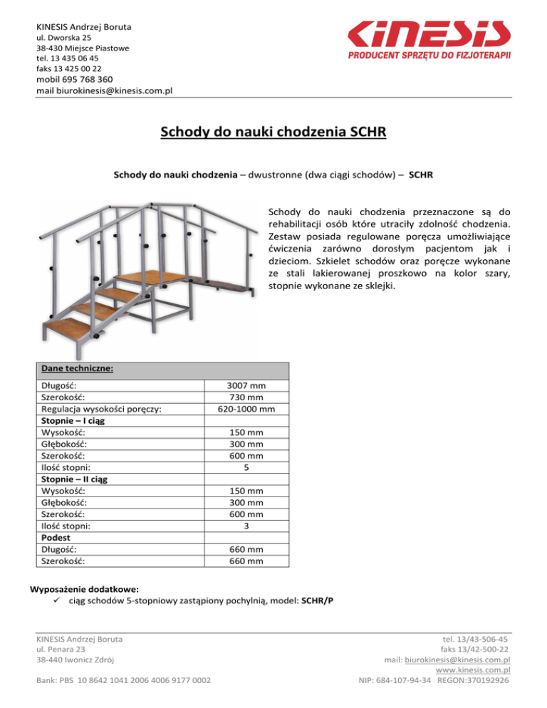 KINESIS Andrzej Boruta ul. Dworska 25 38-430 Miejsce Piastowe tel. 13 435 06 45 faks 13 425 00 22 mobil 695 768 360 mail [email protected] Schody do nauki chodzenia SCHR Schody do nauki chodzenia – dwustronne (dwa ciągi schodów) – SCHR Schody do nauki chodzenia przeznaczone są do rehabilitacji osób które utraciły zdolność chodzenia. Zestaw posiada regulowane poręcza umożliwiające ćwiczenia zarówno dorosłym pacjentom jak i dzieciom. Szkielet schodów oraz poręcze wykonane ze stali lakierowanej proszkowo na kolor szary, stopnie wykonane ze sklejki. Dane techniczne: Długość: Szerokość: Regulacja wysokości poręczy: Stopnie – I ciąg Wysokość: Głębokość: Szerokość: Ilość stopni: Stopnie – II ciąg Wysokość: Głębokość: Szerokość: Ilość stopni: Podest Długość: Szerokość: 3007 mm 730 mm 620-1000 mm 150 mm 300 mm 600 mm 5 150 mm 300 mm 600 mm 3 660 mm 660 mm Wyposażenie dodatkowe: ciąg schodów 5-stopniowy zastąpiony pochylnią, model: SCHR/P KINESIS Andrzej Boruta ul. Penara 23 38-440 Iwonicz Zdrój Bank: PBS 10 8642 1041 2006 4006 9177 0002 tel. 13/43-506-45 faks 13/42-500-22 mail: [email protected] www.kinesis.com.pl NIP: 684-107-94-34 REGON:370192926