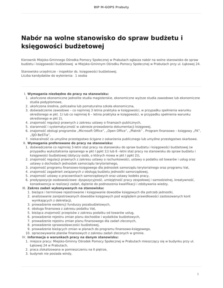 BIP M-GOPS Prabuty Nabór na wolne stanowisko do spraw budżetu i księgowości budżetowej Kierownik Miejsko-Gminnego Ośrodka Pomocy Społecznej w Prabutach ogłasza nabór na wolne stanowisko do spraw budżetu i księgowości budżetowej w Miejsko-Gminnym Ośrodku Pomocy Społecznej w Prabutach przy ul. Łąkowej 24. Stanowisko urzędnicze - inspektor ds. księgowości budżetowej. Liczba kandydatów do wyłonienia: 1 osoba I. Wymagania niezbędne do pracy na stanowisku: 1. ukończone ekonomiczne jednolite studia magisterskie, ekonomiczne wyższe studia zawodowe lub ekonomiczne studia podyplomowe, 2. ukończona średnia, policealna lub pomaturalna szkoła ekonomiczna, 3. doświadczenie zawodowe – co najmniej 3 letnia praktyka w księgowości, w przypadku spełnienia warunku określonego w pkt. 1) lub co najmniej 6 – letnia praktyka w księgowości, w przypadku spełnienia warunku określonego w pkt 2), 4. znajomość regulacji prawnych z zakresu ustawy o finansach publicznych, 5. staranność i systematyczność w zakresie prowadzenia dokumentacji księgowej, 6. znajomość obsługi programów „Microsoft Office”, „Open Office”, „Płatnik” , Program finansowo – księgowy „FK”, „SJO BeSTia”, 7. niekaralność za umyślne przestępstwo ścigane z oskarżenia publicznego lub umyślne przestępstwo skarbowe. II. Wymagania preferowane do pracy na stanowisku: 1. doświadczenie co najmniej 3-letni staż pracy na stanowisku do spraw budżetu i księgowości budżetowej (w przypadku wykształcenia opisanego w pkt I ppkt 1)) lub 6 –letni staż pracy na stanowisku do spraw budżetu i księgowości budżetowej (dotyczy osób, o których mowa w pkt I ppkt 2)), 2. znajomość regulacji prawnych z zakresu ustawy o rachunkowości, ustawy o podatku od towarów i usług oraz ustawy o dochodach jednostek samorządu terytorialnego, 3. znajomość programu finansowo-księgowego dla jednostek samorządu terytorialnego oraz programu Vat, 4. znajomość zagadnień związanych z obsługą budżetu jednostki samorządowej, 5. znajomość ustawy o pracownikach samorządowych oraz ustawy kodeks pracy, 6. predyspozycje osobowościowe: dyspozycyjność, umiejętność pracy zespołowej i samodzielnej, kreatywność, konsekwencja w realizacji zadań, dążenie do podnoszenia kwalifikacji i zdobywania wiedzy. III. Zakres zadań wykonywanych na stanowisku: 1. bieżące i terminowe rejestrowanie i księgowanie dowodów księgowych dla potrzeb jednostki, 2. analizowanie zarejestrowanych dowodów księgowych pod względem prawidłowości zastosowanych kont wynikających z dekretacji, 3. prowadzenie ewidencji funduszy pozabudżetowych, 4. obsługa finansowa z zakresu podatku Vat, 5. bieżąca znajomość przepisów z zakresu podatku od towarów usług, 6. prowadzenie rejestru zmian planu dochodów i wydatków budżetowych, 7. prowadzenie rejestru zmian planu finansowego dla zadań zleconych, 8. prowadzenie sprawozdawczości budżetowej, 9. prowadzenie bieżących zmian w planach do programu finansowo-księgowego, 10. opracowywanie planów finansowych z zakresu zadań zleconych w gminie. IV. Informacja o warunkach pracy na danym stanowisku: 1. miejsce pracy: Miejsko-Gminny Ośrodek Pomocy Społecznej w Prabutach mieszczący się w budynku przy ul. Łąkowej 24 w Prabutach, 2. praca zlokalizowana w pomieszczeniu na II piętrze, 3. budynek nie posiada windy, 1 BIP M-GOPS Prabuty 4. praca przy monitorze ekranowym co najmniej połowę dobowego wymiaru czasu pracy, 5. czas pracy: 40 godz. tygodniowo. V. Wskaźnik zatrudnienia osób niepełnosprawnych: W miesiącu poprzedzającym datę upublicznienia ogłoszenia, wskaźnik zatrudnienia osób niepełnosprawnych w Miejskim Ośrodku Pomocy Społecznej w Prabutach w rozumieniu przepisów o rehabilitacji zawodowej i społecznej oraz zatrudnieniu osób niepełnosprawnych jest niższy niż 6 %. VI. Wymagane dokumenty: 1. list motywacyjny własnoręcznie podpisany, 2. CV z informacją o wykształceniu oraz opisem dotychczasowego przebiegu pracy zawodowej własnoręcznie podpisany, 3. kserokopie dokumentów potwierdzających wykształcenie i kwalifikacje zawodowe, w tym posiadanie kwalifikacji praktycznych (poświadczone przez kandydata za zgodność z oryginałem), 4. kserokopie dokumentów poświadczających stopień niepełnosprawności (poświadczone przez kandydata za zgodność z oryginałem) – dotyczy kandydatów niepełnosprawnych, 5. oświadczenie, że kandydat nie był skazany prawomocnym wyrokiem za umyślne przestępstwo ścigane z oskarżenia publicznego lub umyślne przestępstwo skarbowe, 6. oświadczenie o pełnej zdolności do czynności prawnych i korzystaniu z pełni praw publicznych, 7. oświadczenie o posiadaniu obywatelstwa polskiego, 8. inne dokumenty o posiadanych kwalifikacjach i umiejętnościach. Dokumenty aplikacyjne: list motywacyjny, CV muszą być opatrzone klauzulą: „Wyrażam zgodę na przetwarzanie moich danych osobowych zawartych w ofercie pracy dla potrzeb niezbędnych do realizacji procesu rekrutacji zgodnie z ustawą z dnia 29 sierpnia 1997 r. o ochronie danych osobowych ( tekst jednolity: Dz.U. z 2016 poz.922). Przyjmuję do wiadomości fakt obowiązku publikacji w Biuletynie Informacji Publicznej moich danych osobowych zgodnie z wymogami ustawy z dnia 21 listopada 2008 r. o pracownikach samorządowych ( tekst jednolity: Dz.U. z 2016 r. poz. 902)”. VII. Miejsce i termin złożenia dokumentów: Wymienione wyżej dokumenty w zaklejonej kopercie z napisem: nabór na wolne stanowisko urzędnicze w Miejsko-Gminnym Ośrodku Pomocy Społecznej w Prabutach - inspektor ds. księgowości budżetowej, można składać osobiście w sekretariacie Miejsko-Gminnego Ośrodka Pomocy Społecznej w Prabutach, ul. Łąkowa 24 , pok. Nr 11 w godzinach tj. 8.00 - 15.00 lub doręczone listownie na adres: Miejsko-Gminny Ośrodek Pomocy Społecznej w Prabutach ul. Łąkowa 24, 82-550 Prabuty. w terminie do dnia 10 lutego 2017 r. Aplikacje, 