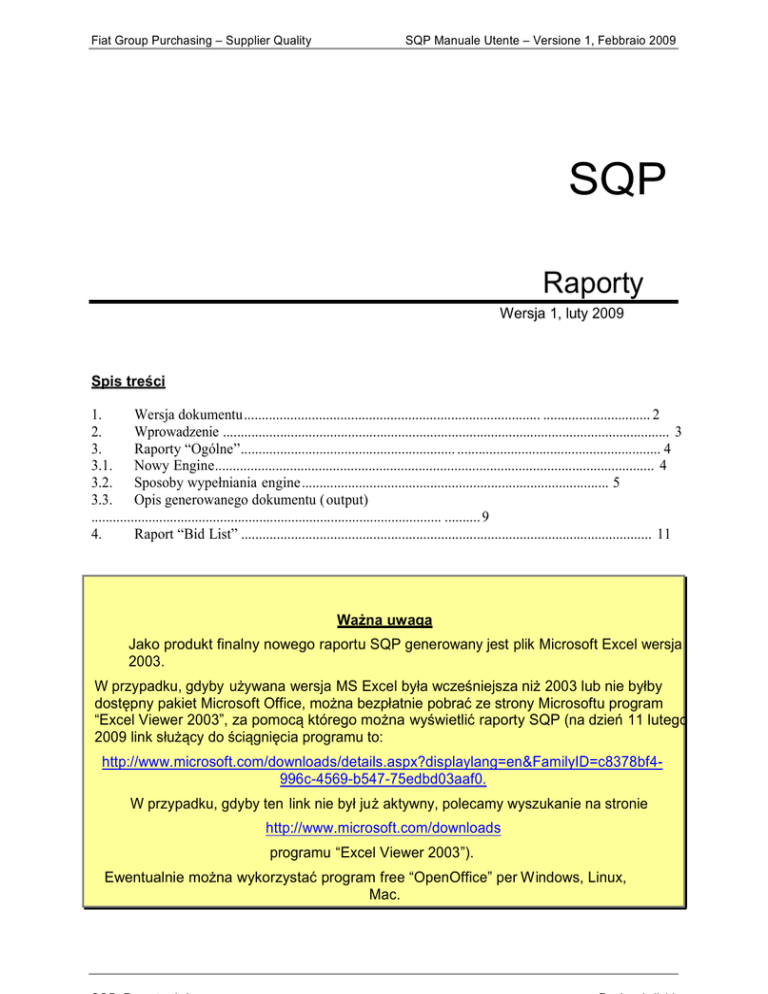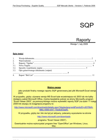 Fiat Group Purchasing – Supplier Quality SQP Manuale Utente – Versione 1, Febbraio 2009 SQP Raporty Wersja 1, luty 2009 Spis treści 1. Wersja dokumentu................................................................................... .............................. 2 2. Wprowadzenie ............................................................................................................................. 3 3. Raporty “Ogólne”............................................................ ......................................................... 4 3.1. Nowy Engine........................................................................................................................... 4 3.2. Sposoby wypełniania engine...................................................................................... 5 3.3. Opis generowanego dokumentu ( output) .................................................................................................. .......... 9 4. Raport “Bid List” ................................................................................................................... 11 Ważna uwaga Jako produkt finalny nowego raportu SQP generowany jest plik Microsoft Excel wersja 2003. W przypadku, gdyby używana wersja MS Excel była wcześniejsza niż 2003 lub nie byłby dostępny pakiet Microsoft Office, można bezpłatnie pobrać ze strony Microsoftu program “Excel Viewer 2003”, za pomocą którego można wyświetlić raporty SQP (na dzień 11 lutego 2009 link służący do ściągnięcia programu to: http://www.microsoft.com/downloads/details.aspx?displaylang=en&FamilyID=c8378bf4996c-4569-b547-75edbd03aaf0. W przypadku, gdyby ten link nie był już aktywny, polecamy wyszukanie na stronie http://www.microsoft.com/downloads programu “Excel Viewer 2003”). Ewentualnie można wykorzystać program free “OpenOffice” per Windows, Linux, Mac. Fiat Group Purchasing – Supplier Quality SQP Manuale Utente – Versione 1, Febbraio 2009 1. Wersja dokumentu Wersja dokumentu documento Wersja 1 SQP_Report_v1.doc Zmiana wzgledem poprzedniej wersji ° Sporządzenie dokument u (luty 2009) Pagina 2 di 11 Fiat Group Purchasing – Supplier Quality SQP Manuale Utente – Versione 1, Febbraio 2009 2. Wprowadzenie W związku z wprowadzonymi niedawno funkcjami oraz wymogami analizy danych powiązanymi z Sektorami Fiat Group, dla kt órych zo st ało rozszerzone zast osowanie s yst em u SQP, kon i ec z n a st a ł a si ę r e o r g a n i za cj a r a p or t ó w s yst em u p o pr z e z zm o d yf i k o wa n i e p r oc e d u r i nf o rm at yc zn y ch o p r ac o w ywa n i a d a n yc h , e k r a n ó w i p r o d u kt u f i n a l n e g o ( o ut p u t ) . Menu Report zostało uproszczone poprzez zgrupowanie w pozycji “Generali”/Ogólne/ wszystkich raportów operacyjnych, które teraz wykorzystują jeden “Engine”. Jako produkt finalny generowany jest plik MS Excel składający się z różnych arkuszy odpowiadających opracowanym wskaźnikom. Na poniższym obrazie przedstawiono nowe menu raportów dla profilu Fiat Group “Administrator”. Obraz 1 – Nowe menu “Report” W zależności od profilu użytkownika, który łączy się z systemem, menu raportów może zawierać wszystkie lub tylko niektóre przewidziane funkcje. W poniższej tabeli zaznaczono raporty dostępne dla głównych profili SQP. Obraz 2 – Raporty dostępne w zależności od profilu użytkownika Fiat Group Purchasing – Supplier Quality SQP Manuale Utente – Versione 1, Febbraio 2009 W oparciu o specjalne potrzeby, konfiguracja ta będzie mogła być modyfikowana przez użytkownika wewnętrznego z profilem “Amministratore Root” /Główny Administrator/. 3. Raporty “Ogólne” Nowa funkcja Raportów “Ogólnych” zawiera raporty operacyjne, które w poprzedniej wer sji były wybierane pojedynczo, z koniecznością powtarzania operacji wprowadzania parametrów dla każdego raportu. W oparciu o kryteria wprowadzone do nowego “Engine”, funkcja Raportów “Ogólnych” opracowuje jeden plik MS Excel podzielony na poszczególne arkusze, każdy poświęcony jednemu raportowi operacyjnemu. Są również 2 arkusze zawierające odpowiednio kryteria wprowadzone do wyszukiwarki oraz tabelę analityczną opracowanych danych. 3.1. Nowy Engine Poniższy obraz przedstawia nowy engine dla raportów “Ogólnych.” Obraz 3 – Nowy Engine raportów “Ogólnych” W kwadracie < 1 > podane są kryteria służące do opracowania rapo rtu. W zależności od profilu użytkownika łączącego się z systemem, niektóre pola mogą być wypełnione automatycznie przez system (na przykład: sektor, polo i dostawca są narzucane z góry i nie mogą być zmieniane przez użytkownika „Dostawca”). W kolejnym paragrafie 3.2 zostały przedstawione podstawowe informacje dotyczące sposobów operacyjnych zarządzania kryteriami engine . Fiat Group Purchasing – Supplier Quality SQP Manuale Utente – Versione 1, Febbraio 2009 Kwadrat < 2 > dotyczy kryteriów porządkowania danych zawartych w raportach “Top Worst Supplier” /Lista Najgorszych Dostawców/ i “Top Worst Part Number” /Lista Najgorszych Numerów Rysunku/. Więcej informacji podano w kolejnym paragrafie 3.3. Kwadrat < 3 > dotyczy statusu bolli i pokazuje ustawienie domyślne dla statusu “Ważna” i “Zamknięta” (w ten sposób nie trzeba wybierać za każdym razem statusów bolli do uwzględnienia w obliczaniu wskaźników). Użytkownik, w razie konieczności , może wybrać i/lub anulow ać wcześniej wprowadzone wartości. Informacja zawarta w kwadracie < 4 > pokazuje datę ostatniej aktualizacji danych dla których opracowywane są raporty. Przyciski w kwadracie < 5 > umożliwiają odpowiednio anulowanie danych wprowadzonych do engine i wygenerowanie pliku MS Excel zawierającego raporty. W kolejnym paragrafie 3.2 zostały opisane pola znajdujące się w engine i sposoby ich wypełniania. 3.2. Sposoby wypełniania engine Aby ułatwić wp