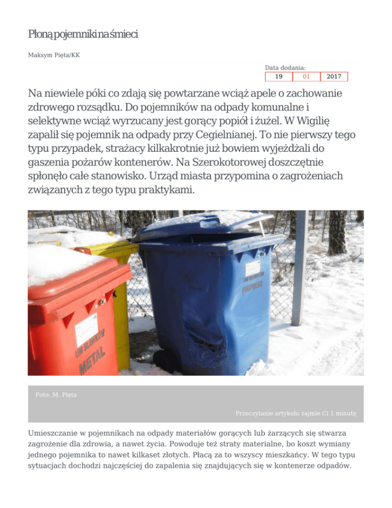 Płonąpojemnikinaśmieci Maksym Pięta/KK Data dodania: 19 01 2017 Na niewiele póki co zdają się powtarzane wciąż apele o zachowanie zdrowego rozsądku. Do pojemników na odpady komunalne i selektywne wciąż wyrzucany jest gorący popiół i żużel. W Wigilię zapalił się pojemnik na odpady przy Cegielnianej. To nie pierwszy tego typu przypadek, strażacy kilkakrotnie już bowiem wyjeżdżali do gaszenia pożarów kontenerów. Na Szerokotorowej doszczętnie spłonęło całe stanowisko. Urząd miasta przypomina o zagrożeniach związanych z tego typu praktykami. Foto: M. Pięta Przeczytanie artykułu zajmie Ci 1 minutę Umieszczanie w pojemnikach na odpady materiałów gorących lub żarzących się stwarza zagrożenie dla zdrowia, a nawet życia. Powoduje też straty materialne, bo koszt wymiany jednego pojemnika to nawet kilkaset złotych. Płacą za to wszyscy mieszkańcy. W tego typu sytuacjach dochodzi najczęściej do zapalenia się znajdujących się w kontenerze odpadów. Poza groźbą przeniesienia się pożaru, są one też źródłem niezwykle toksycznego dymu. Aby uniknąć tego typu sytuacji, do pojemników należy wrzucać zawsze zimny (schłodzony) popiół. Pamiętać trzeba, by nie studzić go wodą, ponieważ przy ujemnych temperaturach mokry popiół może przymarzać do pojemnika, uniemożliwiając jego skuteczne opróżnienie. Popiół wrzucać można tylko do pojemnika na odpady zmieszane! fot. Maksym Pięta Tagi: pojemniki na odpadygorący popiółpożarospstraż pożarna Sławków D R U KUJ D RUKUJ DO PDF http://www.slawkow.pl/print.php?pdf=true&unique=plona-pojemniki-na-smieci&lang=pl