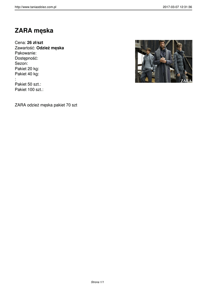 http://www.taniaodziez.com.pl 2017-03-07 12:31:36 ZARA męska Cena: 26 zł/szt Zawartość: Odzież męska Pakowanie: Dostępność: Sezon: Pakiet 20 kg: Pakiet 40 kg: : Pakiet 50 szt.: Pakiet 100 szt.: ZARA odzież męska pakiet 70 szt Strona 1/1