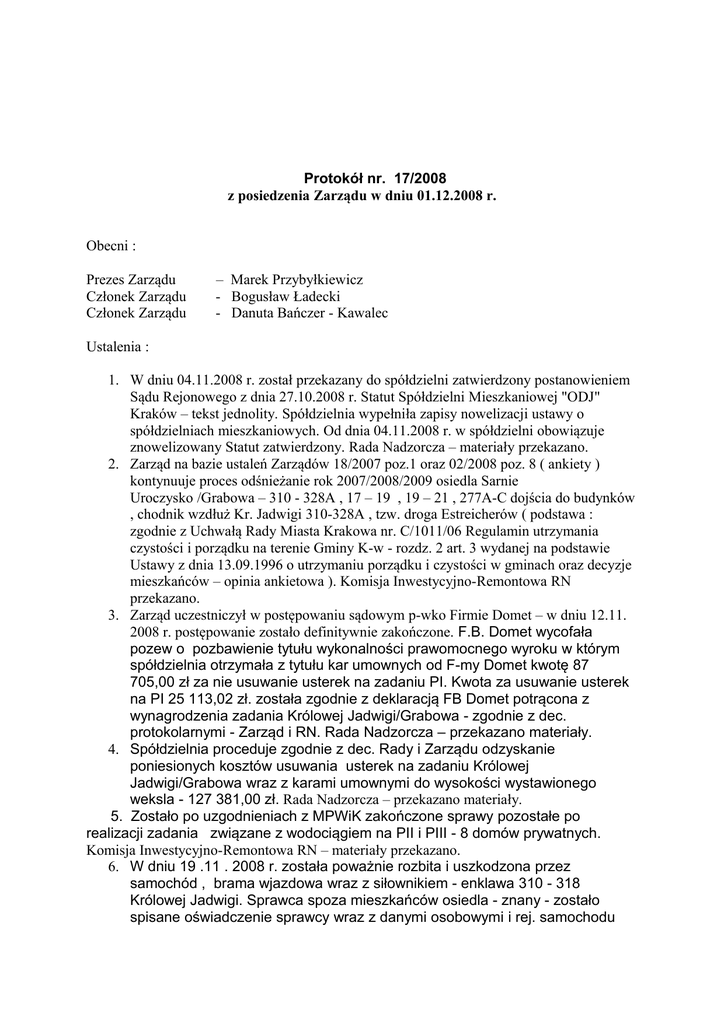 Protokół nr. 17/2008 z posiedzenia Zarządu w dniu 01.12.2008 r. Obecni : Prezes Zarządu Członek Zarządu Członek Zarządu – Marek Przybyłkiewicz - Bogusław Ładecki - Danuta Bańczer - Kawalec Ustalenia : 1. W dniu 04.11.2008 r. został przekazany do spółdzielni zatwierdzony postanowieniem Sądu Rejonowego z dnia 27.10.2008 r. Statut Spółdzielni Mieszkaniowej "ODJ" Kraków – tekst jednolity. Spółdzielnia wypełniła zapisy nowelizacji ustawy o spółdzielniach mieszkaniowych. Od dnia 04.11.2008 r. w spółdzielni obowiązuje znowelizowany Statut zatwierdzony. Rada Nadzorcza – materiały przekazano. 2. Zarząd na bazie ustaleń Zarządów 18/2007 poz.1 oraz 02/2008 poz. 8 ( ankiety ) kontynuuje proces odśnieżanie rok 2007/2008/2009 osiedla Sarnie Uroczysko /Grabowa – 310 - 328A , 17 – 19 , 19 – 21 , 277A-C dojścia do budynków , chodnik wzdłuż Kr. Jadwigi 310-328A , tzw. droga Estreicherów ( podstawa : zgodnie z Uchwałą Rady Miasta Krakowa nr. C/1011/06 Regulamin utrzymania czystości i porządku na terenie Gminy K-w - rozdz. 2 art. 3 wydanej na podstawie Ustawy z dnia 13.09.1996 o utrzymaniu porządku i czystości w gminach oraz decyzje mieszkańców – opinia ankietowa ). Komisja Inwestycyjno-Remontowa RN przekazano. 3. Zarząd uczestniczył w postępowaniu sądowym p-wko Firmie Domet – w dniu 12.11. 2008 r. postępowanie zostało definitywnie zakończone. F.B. Domet wycofała pozew o pozbawienie tytułu wykonalności prawomocnego wyroku w którym spółdzielnia otrzymała z tytułu kar umownych od F-my Domet kwotę 87 705,00 zł za nie usuwanie usterek na zadaniu PI. Kwota za usuwanie usterek na PI 25 113,02 zł. została zgodnie z deklaracją FB Domet potrącona z wynagrodzenia zadania Królowej Jadwigi/Grabowa - zgodnie z dec. protokolarnymi - Zarząd i RN. Rada Nadzorcza – przekazano materiały. 4. Spółdzielnia proceduje zgodnie z dec. Rady i Zarządu odzyskanie poniesionych kosztów usuwania usterek na zadaniu Królowej Jadwigi/Grabowa wraz z karami umownymi do wysokości wystawionego weksla - 127 381,00 zł. Rada Nadzorcza – przekazano materiały. 5. Zostało po uzgodnieniach z MPWiK zakończone sprawy pozostałe po realizacji zadania związane z wodociągiem na PII i PIII - 8 domów prywatnych. Komisja Inwestycyjno-Remontowa RN – materiały przekazano. 6. W dniu 19 .11 . 2008 r. została poważnie rozbita i uszkodzona przez samochód , brama wjazdowa wraz z siłownikiem - enklawa 310 - 318 Królowej Jadwigi. Sprawca spoza mieszkańców osiedla - znany - zostało spisane oświadczenie sprawcy wraz z danymi osobowymi i rej. samochodu oraz polisą OC . Zostało zgłoszone do ubezpieczyciela bramy tj. Uniqua oraz PZU – polisa OC sprawcy. Spisano protokoły szkodowe . Koszt wymiany bramy i siłownika - 12 810,00 zł brutto wg. kosztorysu Wykonawcy . Działanie – pilna wymiana bramy z siłownikiem – koszty refakturowane na ubezpieczyciela , który zwraca koszty z ubezpieczenia - dochodzenie należności od sprawcy z ubezpieczenia OC samochodu . Do wykonania działań proceduralnych - Zarząd udziela upoważnienia dla Jan Dzioba ( Statut par. 84 ust. 4 ). Wykonawca określa termin wymiany bramy na ok. do 3-ch tygodni - z uwagi na konieczność ocynkowania konstrukcji nowej bramy. Komisja Inwestycyjno-Remontowa RN – materiały przekazano. 7. Administracja: 7.1. Przedłużono umowę na zabezpieczenia antywirus NOD32 systemów komputerowych spółdzielni. 7.2. 7.2. Dla potrzeb administracji zakup niszczarki do kwoty 300 zł. 8. Spółdzielnia zgodnie z procedurami ubezpiecza na 2009 rok : budynki administrowane – Kr.Jadw. 310-328A , Nitscha 1 , Estreicherów 17-19 , Grabowa 19-21 , Raciborskiego 9-13 wraz z bramami ( siłowniki ) i ogrodzeniami , Kr.Jadw. 277A-C wraz z bramą ( siłownik ) , lokal 108 – Łobzowska 57. 9. Rozliczenie ubezpieczenia – Uchwała nr. 1/17/2008 w treści „ Rozliczenie ubezpieczenia a/ obiekty – Kr.Jadw. 310-328A , Estreicherów 17-19 , Nitscha 1 , Kr.Jadw. 277A-C , Grabowa 19-21 , Raciborskiego 9-13 – na 1 m2 p.u. lokali. b/ ogrodzenia i bramy – odpowiednio na przynależne obiekty Kr. Jadw. 310-318 , 320-324 , 326-328A , Nitscha 1, Grabowa 19-21 , Estreicherów 17-19. c/ brama - odpowiednio na przynależne budynki Kr.Jadw. 277,277A-C , 275 , 275A-D. 10. Zgodnie z Statutem par. 55 ust. 2e Zarząd wnioskuje do Rady Nadzorczej o wykreślenie z rej. członków p. Irena Gogulska – permanentne uchylanie się od zobowiązań wobec spółdzielni – zapłata należności określonych statutem. 11. Zarząd podejmuje Uchwałę 2/17/2008 w treści „ Przyznanie nagrody rocznej za 2008 r. dla pracowników : Halina Giza – 800 zł brutto , Jolanta Kucała – 400 zł brutto.” 12. W związku z szkoleniem ( bezpłatne ) pracowników spółdzielni mieszkaniowych w sprawie przygotowania i opracowania dokumentacji dla likwidacji szkód przez CLS Uniqua – Zarząd kieruje na szkolenie Administrator Jan Dzioba. Na tym protokół zakończono i podpisano