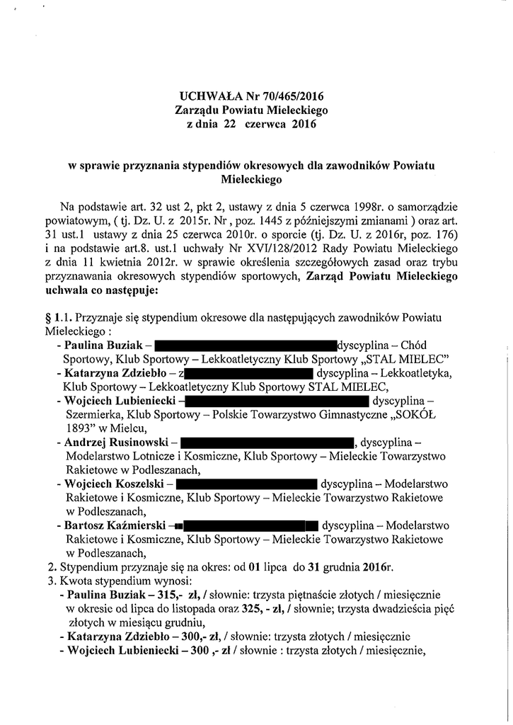 UCHWAŁA Nr 70/465/2016 Zarządu Powiatu Mieleckiego z dnia 22 czerwca 2016 w sprawie przyznania stypendiów okresowych dla zawodników Powiatu Mieleckiego Na podstawie art. 32 ust 2, pkt 2, ustawy z dnia 5 czerwca 1998r. o samorządzie powiatowym, ( tj. Dz. U. z 2015r. N r, poz. 1445 z późniejszymi zmianami) oraz art. 31 ust.l ustawy z dnia 25 czerwca 2010r. o sporcie (tj. Dz. U. z 2016r, poz. 176) i na podstawie art.8. ust.l uchwały Nr XVI/128/2012 Rady Powiatu Mieleckiego z dnia 11 kwietnia 2012r. w sprawie określenia szczegółowych zasad oraz trybu przyznawania okresowych stypendiów sportowych, Zarząd Powiatu Mieleckiego uchwala co następuje: §1.1. Przyznaje się stypendium okresowe dla następujących zawodników Powiatu Mieleckiego : - Paulina Buziak - ...........................................................dyscyplina - Chód Sportowy, Klub Sportowy - Lekkoatletyczny Klub Sportowy „STAL MIELEC” - Katarzyna Zdzieblo - z.......................................... dyscyplina - Lekkoatletyka, Klub Sportowy - Lekkoatletyczny Klub Sportowy STAL MIELEC, - Wojciech Lubieniecki - ............................................................ dyscyplina Szermierka, Klub Sportowy - Polskie Towarzystwo Gimnastyczne „SOKÓŁ 1893” w Mielcu, - Andrzej Rusinowski - ........................................................, dyscyplina Modelarstwo Lotnicze i Kosmiczne, Klub Sportowy - Mieleckie Towarzystwo Rakietowe w Podleszanach, - Wojciech Koszelski - .............................................. dyscyplina - Modelarstwo Rakietowe i Kosmiczne, Klub Sportowy - Mieleckie Towarzystwo Rakietowe w Podleszanach, - Bartosz Kaźmierski - .. ............................................... dyscyplina - Modelarstwo Rakietowe i Kosmiczne, Klub Sportowy - Mieleckie Towarzystwo Rakietowe w Podleszanach, 2. Stypendium przyznaje się na okres: od 01 lipca do 31 grudnia 2016r. 3. Kwota stypendium wynosi: - Paulina Buziak - 315,- zł, / słownie: trzysta piętnaście złotych / miesięcznie w okresie od lipca do listopada oraz 325, - zł, / słownie; trzysta dwadzieścia pięć złotych w miesiącu grudniu, - Katarzyna Zdziebło - 300,- zł, / słownie: trzysta złotych / miesięcznie - Wojciech Lubieniecki - 300 ,- zl / słownie : trzysta złotych / miesięcznie, - Andrzej Rusinowski - 250 zł / słownie : dwieście pięćdziesiąt złotych / miesięcznie /, - Wojciech Koszelski - 250,- zł / słownie : dwieście pięćdziesiąt złotych / miesięcznie /, - Bartosz Kaźmierski - 250 zł / słownie : dwieście pięćdziesiąt złotych / miesięcznie /, § 2. Wykonanie uchwały powierza się Skarbnikowi Powiatu Mieleckiego. § 3. Uchwała wchodzi w życie z dniem podjęcia. 1. Przewodniczący Zarządu Zbigniew Tymuła - ....... 2. Wicestarosta Maria Napieracz 3. Członek Zarządu Waldemar Barnaś 4. Członek Zarządu Andrzej Bryła 5. Członek Zarządu Joanna Rębisz -..