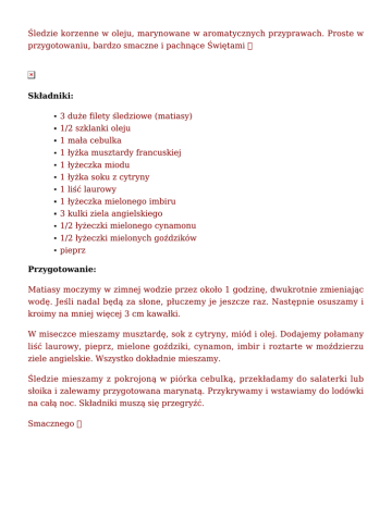 Śledzie korzenne w oleju, marynowane w aromatycznych przyprawach. Proste w przygotowaniu, bardzo smaczne i pachnące Świętami Składniki: 3 duże filety śledziowe (matiasy) 1/2 szklanki oleju 1 mała cebulka 1 łyżka musztardy francuskiej 1 łyżeczka miodu 1 łyżka soku z cytryny 1 liść laurowy 1 łyżeczka mielonego imbiru 3 kulki ziela angielskiego 1/2 łyżeczki mielonego cynamonu 1/2 łyżeczki mielonych goździków pieprz Przygotowanie: Matiasy moczymy w zimnej wodzie przez około 1 godzinę, dwukrotnie zmieniając wodę. Jeśli nadal będą za słone, płuczemy je jeszcze raz. Następnie osuszamy i kroimy na mniej więcej 3 cm kawałki. W miseczce mieszamy musztardę, sok z cytryny, miód i olej. Dodajemy połamany liść laurowy, pieprz, mielone goździki, cynamon, imbir i roztarte w moździerzu ziele angielskie. Wszystko dokładnie mieszamy. Śledzie mieszamy z pokrojoną w piórka cebulką, przekładamy do salaterki lub słoika i zalewamy przygotowana marynatą. Przykrywamy i wstawiamy do lodówki na całą noc. Składniki muszą się przegryźć. Smacznego