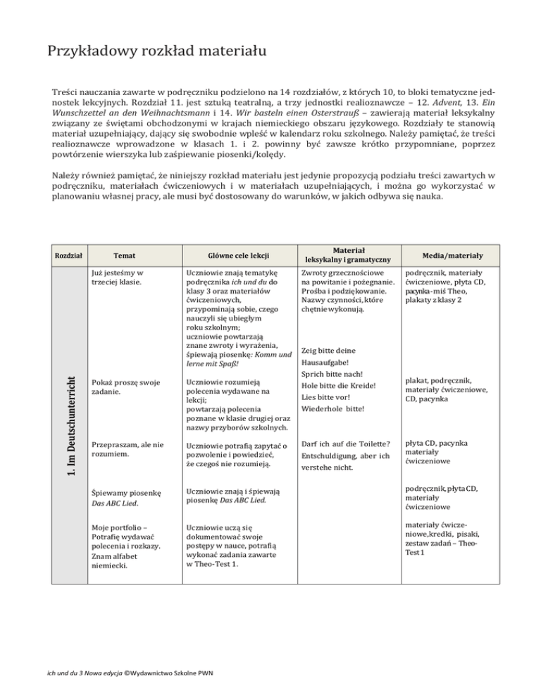 Przykładowy rozkład materiału Treści nauczania zawarte w podręczniku podzielono na 14 rozdziałów, z których 10, to bloki tematyczne jednostek lekcyjnych. Rozdział 11. jest sztuką teatralną, a trzy jednostki realioznawcze – 12. Advent, 13. Ein Wunschzettel an den Weihnachtsmann i 14. Wir basteln einen Osterstrauß – zawierają materiał leksykalny związany ze świętami obchodzonymi w krajach niemieckiego obszaru językowego. Rozdziały te stanowią materiał uzupełniający, dający się swobodnie wpleść w kalendarz roku szkolnego. Należy pamiętać, że treści realioznawcze wprowadzone w klasach 1. i 2. powinny być zawsze krótko przypomniane, poprzez powtórzenie wierszyka lub zaśpiewanie piosenki/kolędy. Należy również pamiętać, że niniejszy rozkład materiału jest jedynie propozycją podziału treści zawartych w podręczniku, materiałach ćwiczeniowych i w materiałach uzupełniających, i można go wykorzystać w planowaniu własnej pracy, ale musi być dostosowany do warunków, w jakich odbywa się nauka. Rozdział Temat 1. Im Deutschunterricht Już jesteśmy w trzeciej klasie. Glówne cele lekcji Uczniowie znają tematykę podręcznika ich und du do klasy 3 oraz materiałów ćwiczeniowych, przypominają sobie, czego nauczyli się ubiegłym roku szkolnym; uczniowie powtarzają znane zwroty i wyrażenia, śpiewają piosenkę: Komm und lerne mit Spaß! Materiał leksykalny i gramatyczny Zwroty grzecznościowe na powitanie i pożegnanie. Prośba i podziękowanie. Nazwy czynności, które chętnie wykonują. Przepraszam, ale nie rozumiem. podręcznik, materiały ćwiczeniowe, płyta CD, pacynka - miś Theo, plakaty z klasy 2 Zeig bitte deine Hausaufgabe! Sprich bitte nach! Pokaż proszę swoje zadanie. Media/materiały Uczniowie rozumieją polecenia wydawane na lekcji; powtarzają polecenia poznane w klasie drugiej oraz nazwy przyborów szkolnych. Hole bitte die Kreide! Uczniowie potrafią zapytać o pozwolenie i powiedzieć, że czegoś nie rozumieją. Darf ich auf die Toilette? Lies bitte vor! plakat, podręcznik, materiały ćwiczeniowe, CD, pacynka Wiederhole bitte! Entschuldigung, aber ich verstehe nicht. płyta CD, pacynka materiały ćwiczeniowe Śpiewamy piosenkę Das ABC Lied. Uczniowie znają i śpiewają piosenkę Das ABC Lied. podręcznik, płyta CD, materiały ćwiczeniowe Moje portfolio – Potrafię wydawać polecenia i rozkazy. Znam alfabet niemiecki. Uczniowie uczą się dokumentować swoje postępy w nauce, potrafią wykonać zadania zawarte w Theo-Test 1. materiały ćwiczeniowe, kredki, pisaki, zestaw zadań – TheoTest 1 ich und du 3 Nowa edycja ©Wydawnictwo Szkolne PWN Rozdział Temat Jeżdżę na deskorolce. Co robią dzieci w wolnym czasie? Glówne cele lekcji Uczniowie potrafią rozpoznać nazwy czynności wykonywanych w wolnym czasie. Uczniowie potrafią reagować na pytanie: Was machst du in der Freizeit? Materiał leksykalny i gramatyczny Ich spiele Gummitwist. Ich spiele Gameboy. Ich hüpfe Himmel und Hölle. Ich fahre Skateboard. Ich fahre Roller. Ich fahre Schi. 2. Meine Freizeit Ich laufe Schlittschuh. Monika, a co ty tu robisz? Śpiewamy piosenkę: Lach und mach Krach! Moje portfolio – Potrafię nazwać czynności, które wykonuję w czasie wolnym. Wiosną i latem jest ciepło. Uczniowie potrafią nazwać czynności, które chętnie wykonują w wolnym czasie oraz powiedzieć, że wygrali grę lub przegrali. Ich rodle. Ich pflanze Blumen. Ich habe gewonnen. 3. Vier Jahreszeiten Zimą jeżdżę na nartach. plakat, podręcznik, materiały ćwiczeniowe, płyta CD, pacynka, tablice podręcznik, płyta CD, materiały ćwiczeniowe, pacynka, tablice podręcznik, płyta CD, materiały ćwiczeniowe, pacynka, tablice Ich habe verloren. Uczniowie znają i śpiewają piosenkę: Lach und mach Krach! podręcznik, materiały ćwiczeniowe płyta CD, tablice Uczniowie uczą się dokumentować swoje postępy w nauce, potrafią wykonać zadania zawarte w Theo-Test 2. materiały ćwiczeniowe, kredki, pisaki, zestaw zadań Theo-Test 2 Uczniowie znają nazw pór roku. im Frühling im Sommer Es ist warm. Jesienią wieje wiatr. Media/materiały Uczniowie potrafią nazwać zjawiska atmosferyczne. Uczniowie potrafią powiedzieć, jakie sporty uprawiają latem, a jakie zimą. Es ist heiß. Die Blumen blühen. Die Sonne scheint. im Herbst im Winter Es regnet. Es ist kalt. Śpiewamy piosenkę Vier Jahreszeiten. Uczniowie znają i śpiewają piosenkę Vier Jahreszeiten. Moje portfolio – Znam nazwy pór roku i potrafię nazwać zjawiska atmosferyczne. Uczniowie uczą się dokumentować swoje postępy w nauce, potrafią wykonać zadania zawarte w Theo-Test 3. ich und du 3 Nowa edycja ©Wydawnictwo Szkolne PWN Der Wind weht. Es schneit. plakat, podręcznik, materiały ćwiczeniowe, płyta CD, miś Theo plakat, płyta CD, miś Theo, materiały ćwiczeniowe, tablice plakat, płyta CD, miś Theo, materiały ćwiczeniowe, tablice podręcznik, płyta CD, materiały ćwiczeniowe, kredki, kolorowa wełna, klej materiały ćwiczeniowe, kredki pisaki, zestaw zadań – Theo-Test 3 Rozdział Temat Bawimy się w piratów. Glówne cele lekcji Uczniowie rozpoznają nazwy rekwizytów potrzebnych do zabawy w piratów. Materiał leksykalny i gramatyczny die Augenklappe der Piratenhut das Piratentuch Media/materiały plakat, podręcznik, materiały ćwiczeniowe, płyta CD, pacynka , tablice 5. Theo hat Geburtstag 4. Wir basteln für das Piratenfest das Schiff Przygotowujemy się na święto piratów. Uczniowie znają nazwy rekwizytów potrzebnych do zabawy w piratów i samodzielnie je wykonują. die Schatzkiste die Pistole das Messer die Piratenfahne Hilfst du mir? Was soll ich tun? Nein, jetzt nicht. Du bist gemein. podręcznik, płyta CD, materiały ćwiczeniowe, tablice, papier, pudełko, klej, nożyczki, farby, zszywacz, gumka bieliźniana, rekwizyty i duży kawałek materiału (np. obrus) Marcin, pomożesz mi? Uczniowie potrafią twierdząco i przecząco zarea