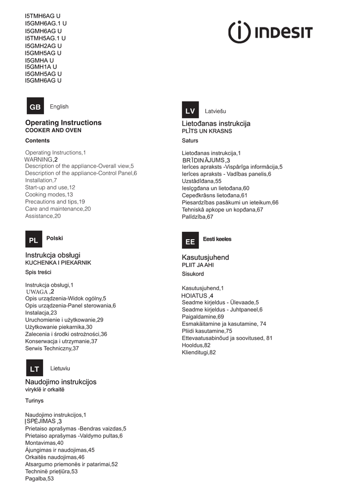 I5TMH6AG U I5GMH6AG.1 U I5GMH6AG U I5TMH5AG.1 U I5GMH2AG U I5GMH5AG U I5GMHA U I5GMH1A U I5GMH5AG U I5GMH6AG U English GB Latviešu LV Operating Instructions Lietođanas instrukcija COOKER AND OVEN PLÎTS UN KRASNS Contents Saturs Operating Instructions,1 Lietođanas instrukcija,1 WARNING ,2 Description of the appliance-Overall view,5 Description of the appliance-Control Panel,6 Installation,7 Start-up and use,12 Cooking modes,13 Precautions and tips,19 Care and maintenance,20 Assistance,20 PL Polski Instrukcja obsługi BR ĪDIN ĀJUMS ,3 Ierîces apraksts -Vispârîga informâcija,5 Ierîces apraksts - Vadîbas panelis,6 Uzstâdîđana,55 Ieslçgđana un lietođana,60 Cepeđkrâsns lietođana,61 Piesardzîbas pasâkumi un ieteikum,66 Tehniskâ apkope un kopđana,67 Palîdzîba,67 EE Eesti keeles Kasutusjuhend KUCHENKA I PIEKARNIK PLIIT JA AHI Spis treści Sisukord Instrukcja obsługi,1 UWAGA ,2 Opis urządzenia-Widok ogólny,5 Opis urządzenia-Panel sterowania,6 Instalacja,23 Uruchomienie i użytkowanie,29 Użytkowanie piekarnika,30 Zalecenia i środki ostrożności,36 Konserwacja i utrzymanie,37 Serwis Techniczny,37 LT Lietuviu Naudojimo instrukcijos viryklë ir orkaitë Turinys Naudojimo instrukcijos,1 ĮSPĖJIMAS ,3 Prietaiso aprašymas -Bendras vaizdas,5 Prietaiso aprašymas -Valdymo pultas,6 Montavimas,40 Ájungimas ir naudojimas,45 Orkaitës naudojimas,46 Atsargumo priemonës ir patarimai,52 Techninë prieţiűra,53 Pagalba,53 Kasutusjuhend,1 HOIATUS ,4 Seadme kirjeldus - Ülevaade,5 Seadme kirjeldus - Juhtpaneel,6 Paigaldamine,69 Esmakäitamine ja kasutamine, 74 Pliidi kasutamine,75 Ettevaatusabinőud ja soovitused, 81 Hooldus,82 Klienditugi,82 GB WARNING WARNING: The appliance and its accessible parts become hot during use. Care should be taken to avoid touching heating elements. Children less than 8 years of age shall be kept away unless continuously supervised. This appliance can be used by children aged from 8 years and above and persons with reduced physical, sensory or mental capabilities or lack of experience and knowledge if they have been given supervision or instruction concerning use of the appliance in a safe way and understand the hazards involved. Children shall not play with the appliance. Cleaning and user maintenance shall not be made by children without supervision. Remove any liquid from the lid before opening it. Do not close the glass cover (if present) when the gas burners or electric hotplates are still hot. WARNING: Ensure that the appliance is switched off before replacing the lamp to avoid the possibility of electric shock. ! When you place the rack inside, make sure that the stop is directed upwards and in the back of the cavity. PL UWAGA UWAGA: To urządzenie oraz jego dostępne części silnie się rozgrzewają podczas użytkowania. Należy uważać, aby nie dotknąć elementów grzejnych. Nie pozwalać, aby dzieci poniżej 8 roku życia zbliżały się do urządzenia, jeśli nie są pod stałym nadzorem dorosłych. Do not use harsh abrasive cleaners or sharp metal scrapers to clean the oven door glass since they can scratch the surface, which may result in shattering of the glass. Z niniejszego urządzenia mogą korzystać dzieci powyżej 8 roku życia i osoby o ograniczonych zdolnościach fizycznych, zmysłowych bądź umysłowych, jak również osoby nieposiadające doświadczenia lub znajomości urządzenia, jeśli znajdują się one pod nadzorem innych osób lub jeśli zostały pouczone na temat bezpiecznego sposobu użycia urządzenia oraz zdają sobie sprawę ze związanych z nim zagrożeń. Dzieci nie powinny bawić się urządzeniem. Prace związane z czyszczeniem i konserwacją nie mogą być wykonywane przez dzieci, jeśli nie są one nadzorowane. The internal surfaces of the compartment (where present) may become hot. UWAGA: Pozostawienie bez nadzoru na kuchence tłuszczów i olejów może być niebezpieczne i może spowodować pożar. WARNING: Unattended cooking on a hob with fat or oil can be dangerous and may result in fire. NEVER try to extinguish a fire with water, but switch off the appliance and then cover flame e.g. with a lid or a fire blanket. CAUTION: the use of inappropriate hob guards can cause accidents. Never use steam cleaners or pressure cleaners on the appliance. 2 Nie należy NIGDY próbować ugasić płomieni/pożaru wodą; należy wyłączyć urządzenie i przykryć płomień np. pokrywką lub ognioodpornym kocem. Nie stosować środków ściernych ani ostrych łopatek metalowych do czyszczenia szklanych drzwiczek piekarnika, ponieważ mogłyby porysować powierzchnię i spowodować pęknięcie szyby. Wewnętrzne powierzchnie szuflady (jeśli jest w danym modelu) mogą się nagrzewać. Nie stosować nigdy oczyszczaczy parowych lub ciśnieniowych do czyszczenia urządzenia. Usunąć ewentualne płyny na pokrywie przed jej otwarciem. Nie zamykać szklanej pokrywy (jeśli jest częścią wyposażenia), jeśli palniki gazowe lub płyta elektryczna są jeszcze rozgrzane. UWAGA: Przed wymianą żarówki, należy się upewnić, że urządzenie jest wyłączone, aby uniknąć ryzyka porażenia prądem. UWAGA: użycie niewłaściwych zabezpieczeń płyty może być przyczyną wypadków. ! Wsuwając ruszt, naleĪy siĊ upewniü, Īe ogranicznik jest skierowany ku górze i znajduje siĊ on w tylnej czĊĞci komory. LT ĮSPĖJIMAS ĮSPĖJIMAS! Naudojamo prietaiso paviršiai ir pasiekiamos dalys įkaista. Būkite atsargūs ir neprisilieskite prie įkaitusių prietaiso dalių. Jaunesni nei 8 metų vaikai gali būti prileidžiami prie prietaiso tik prižiūrimi suaugusiųjų. Vyresni nei 8 metų vaikai ir asmenys, turintys fizinių, jutimo ar psichinių sutrikimų arba nepakankamai žinių ar patirties, šiuo prietaisu gali naudotis tik tuo atveju, jei jie yra prižiūrimi arba instruktuojami, kaip saugiai naudoti prietaisą, taip pat supranta kylančias grėsmes. Vaikams turi būti draudžiama žaisti su prietaisu. Neprižiūrimi va