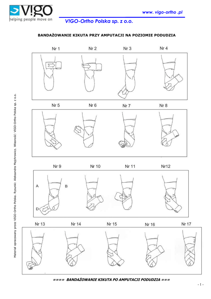 www. vigo-ortho .pl V!GO-Ortho Polska sp. z o.o. Materiał opracowany przez VIGO-Ortho Polska. Rysunki: Aleksandra Majchrowicz. Własność: VIGO-Ortho Polska sp. z o.o. BANDAŻOWANIE KIKUTA PRZY AMPUTACJI NA POZIOMIE PODUDZIA ==== BANDAŻOWANIE KIKUTA PO AMPUTACJI PODUDZIA === -1- www. vigo-ortho .pl V!GO-Ortho Polska sp. z o.o. Ćwiczenia w pozycji leżenia tyłem 1. Skłon głowy z oderwaniem barków od podłoża (bez odrywania łopatek). Materiał opracowany przez VIGO-Ortho Polska. Rysunki: Aleksandra Majchrowicz. Własność: VIGO-Ortho Polska sp. z o.o. a 2. Zginanie podudzia z oporem. a b a 3. Próba zgięcia kolana (izometryczne napinanie mięśni uda). Ćwiczenia w pozycji leżenia przodem 1. Unoszenie ramion i nóg - tzw. foczki. 2. Przenoszenie rąk - tzw. pływanie; (rzut z góry). a a b b c -2- www. vigo-ortho .pl V!GO-Ortho Polska sp. z o.o. Materiał opracowany przez VIGO-Ortho Polska. Rysunki: Aleksandra Majchrowicz. Własność: VIGO-Ortho Polska sp. z o.o. 3. Dłonie splecione na karku (unoszenie i opuszczanie łokci). 4. Wyprost kolana z oporem. a a b b Ćwiczenia w pozycji leżenia na boku 5. Próba odwiedzenia kikuta z równoczesnym uniesieniem bioder a b 6. Próba przywiedzenia kikuta z uniesieniem bioder a b 7. Obniżanie kończyny górnej wzdłuż tułowia. -3- www. vigo-ortho .pl V!GO-Ortho Polska sp. z o.o. Materiał opracowany przez VIGO-Ortho Polska. Rysunki: Aleksandra Majchrowicz. Własność: VIGO-Ortho Polska sp. z o.o. Terapia ułożeniowa 1. Zapobieganie odwiedzeniu stawu biodrowego 2. Wyprost stawu kolanowego i biodrowego w leżeniu przodem. 3. Wyprost stawu kolanowego w leżeniu tyłem. 4.Wyprost stawu kolanowego w pozycji siedzącej 5. Przesiadanie się z wózka do łóżka w przód przykład. -4- www. vigo-ortho .pl V!GO-Ortho Polska sp. z o.o. NAUKA CHODZENIA Ćwiczenia bez asekuracji terapeuty Materiał opracowany przez VIGO-Ortho Polska. Rysunki: Aleksandra Majchrowicz. Własność: VIGO-Ortho Polska sp. z o.o. 1. Przenoszenie ciężaru ciała na lewą i prawą nogę. 2. Przenoszenie ciężaru ciała w tył i w przód. 3. Stanie na protezie. Przenoszenie ciężaru ciała z wykrokiem w przód i w tył. -5- www. vigo-ortho .pl V!GO-Ortho Polska sp. z o.o. Materiał opracowany przez VIGO-Ortho Polska. Rysunki: Aleksandra Majchrowicz. Własność: VIGO-Ortho Polska sp. z o.o. 4.Przywiedzenie kończyny dolnej amputowanej ( stanie na kończynie dolnej zdrowej, skrzyżowanie kończyn);przywiedzenie kończyny dolnej zdrowej (stanie na protezie, skrzyżowanie kończyn). 5. Przenoszenie kończyny dolnej zdrowej na podwyższenie i stopniowe uwalnianie kończyn górnych, (przejście do stania na protezie bez asekuracji). 6. Stanie na protezie. Przenoszenie ciężaru ciała z wykrokiem w przód i w tył, ( bez asekuracji poręczy). -6- www. vigo-ortho .pl V!GO-Ortho Polska sp. z o.o. Ćwiczenia z asekuracją terapeuty Materiał opracowany przez VIGO-Ortho Polska. Rysunki: Aleksandra Majchrowicz. Własność: VIGO-Ortho Polska sp. z o.o. 7. Neuromięśniowe torowanie ruchu kikuta dla usprawnienia prawidłowego wzorca chodu. 8. Rytmiczne torowanie ruchu biodra dla wspomagania rotacji miednicy w płaszczyźnie poprzecznej. 9. Neuromięśniowe torowanie ruchu kikuta dla usprawnienia prawidłowego wzorca chodu z asekuracją a 10. Bierna kontrrotacja barków dla poprawy równowagi i koordynacji. b -7-
