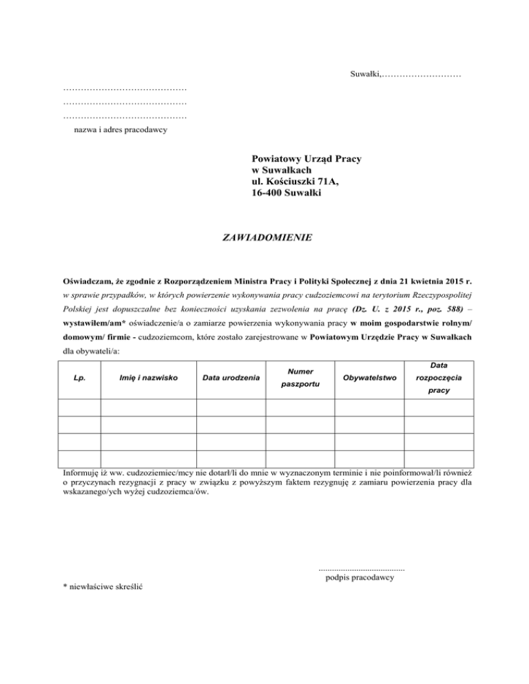 Suwałki,……………………… …………………………………… …………………………………… …………………………………… nazwa i adres pracodawcy Powiatowy Urząd Pracy w Suwałkach ul. Kościuszki 71A, 16-400 Suwałki ZAWIADOMIENIE Oświadczam, że zgodnie z Rozporządzeniem Ministra Pracy i Polityki Społecznej z dnia 21 kwietnia 2015 r. w sprawie przypadków, w których powierzenie wykonywania pracy cudzoziemcowi na terytorium Rzeczypospolitej Polskiej jest dopuszczalne bez konieczności uzyskania zezwolenia na pracę (Dz. U. z 2015 r., poz. 588) – wystawiłem/am* oświadczenie/a o zamiarze powierzenia wykonywania pracy w moim gospodarstwie rolnym/ domowym/ firmie - cudzoziemcom, które zostało zarejestrowane w Powiatowym Urzędzie Pracy w Suwałkach dla obywateli/a: Lp. Imię i nazwisko Data urodzenia Data Numer paszportu Obywatelstwo rozpoczęcia pracy Informuję iż ww. cudzoziemiec/mcy nie dotarł/li do mnie w wyznaczonym terminie i nie poinformował/li również o przyczynach rezygnacji z pracy w związku z powyższym faktem rezygnuję z zamiaru powierzenia pracy dla wskazanego/ych wyżej cudzoziemca/ów. ....................................... podpis pracodawcy * niewłaściwe skreślić