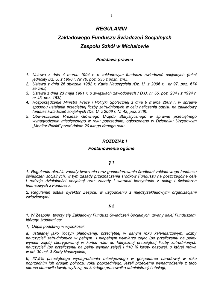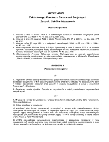 1 REGULAMIN Zakładowego Funduszu Świadczeń Socjalnych Zespołu Szkół w Michalowie Podstawa prawna 1. Ustawa z dnia 4 marca 1994 r. o zakładowym funduszu świadczeń socjalnych (tekst jednolity Dz. U. z 1996 r. Nr 70, poz. 335 z późn. zm.), 2. Ustawa z dnia 26 stycznia 1982 r. Karta Nauczyciela /Dz. U. z 2006 r. nr 97, poz. 674 ze zm./, 3. Ustawa z dnia 23 maja 1991 r. o związkach zawodowych / D.U. nr 55, poz. 234 i z 1994 r. nr 43, poz. 163/, 4. Rozporządzenie Ministra Pracy i Polityki Społecznej z dnia 9 marca 2009 r. w sprawie sposobu ustalania przeciętnej liczby zatrudnionych w celu naliczania odpisu na zakładowy fundusz świadczeń socjalnych (Dz. U. z 2009 r. Nr 43, poz. 349). 5. Obwieszczenie Prezesa Głównego Urzędu Statystycznego w sprawie przeciętnego wynagrodzenia miesięcznego w roku poprzednim, ogłoszonego w Dzienniku Urzędowym „Monitor Polski” przed dniem 20 lutego danego roku. ROZDZIAŁ I Postanowienia ogólne §1 1. Regulamin określa zasady tworzenia oraz gospodarowania środkami zakładowego funduszu świadczeń socjalnych, w tym zasady przeznaczania środków Funduszu na poszczególne cele i rodzaje działalności socjalnej oraz zasady i warunki korzystania z usług i świadczeń finansowych z Funduszu. 2. Regulamin ustala dyrektor Zespołu w uzgodnieniu z międzyzakładowymi organizacjami związkowymi. §2 1. W Zespole tworzy się Zakładowy Fundusz Świadczeń Socjalnych, zwany dalej Funduszem, którego źródłami są: 1) Odpis podstawy w wysokości: a) ustalanej jako iloczyn planowanej, przeciętnej w danym roku kalendarzowym, liczby nauczycieli zatrudnionych w pełnym i niepełnym wymiarze zajęć (po przeliczeniu na pełny wymiar zajęć) skorygowanej w końcu roku do faktycznej przeciętnej liczby zatrudnionych nauczycieli (po przeliczeniu na pełny wymiar zajęć) i 110 % kwoty bazowej, o której mowa w art. 30 ust. 3 Karty Nauczyciela, b) 37,5% przeciętnego wynagrodzenia miesięcznego w gospodarce narodowej w roku poprzednim lub drugim półroczu roku poprzedniego, jeżeli przeciętne wynagrodzenie z tego okresu stanowiło kwotę wyższą, na każdego pracownika administracji i obsługi, 2 c) 5 % emerytur, rent oraz nauczycielskich świadczeń kompensacyjnych pobieranych przez nauczycieli, byłych pracowników szkoły, d) 6,25% przeciętnego wynagrodzenia miesięcznego w gospodarce narodowej w roku poprzednim lub drugim półroczu roku poprzedniego, jeżeli przeciętne wynagrodzenie z tego okresu stanowiło kwotę wyższa, na każdego emeryta i rencistę, byłego pracownika administracji i obsługi. 2) Zwiększenia, których źródłami są: a) b) c) d) darowizny oraz zapisy osób fizycznych i prawnych, odsetki od środków Funduszu, wpływy z oprocentowania pożyczek udzielonych na cele mieszkaniowe, inne środki określone w odrębnych przepisach. §3 1. Kwota odpisu podstawowego naliczonego na dany rok kalendarzowy podlega podziałowi, z przeznaczeniem na: 1) 75% odpisu na cele socjalne, 2) 25% odpisu na cele mieszkaniowe. 2. Spłaty pożyczek mieszkaniowych wraz z oprocentowaniem zasilają część funduszu przeznaczonego na pomoc mieszkaniową. 3. Środki Funduszu gromadzone są na odrębnych rachunkach bankowych. 4. Środki Funduszu niewykorzystane w danym roku kalendarzowym przechodzą na rok następny. 5. Podstawę gospodarowania Załącznik Nr 1. środkami Funduszu stanowi roczny plan finansowy. 6. Środki Funduszu na poszczególne formy pomocy socjalnej są przyznawane w formie pieniężnej lub rzeczowej. ROZDZIAŁ II Osoby uprawnione do korzystania z Funduszu §4 1. Do korzystania ze świadczeń Funduszu uprawnieni są: 1) pracownicy szkoły i przedszkola zatrudnieni na czas nieokreślony i określony, w pełnym i niepełnym wymiarze czasu pracy, 2) pracownicy przebywający na urlopach wychowawczych, nauczyciele przebywający na urlopach zdrowotnych oraz nauczyciele przeniesieni w stan nieczynny, 3) emeryci i renciści - byli pracownicy, dla których szkoła była ostatnim miejscem pracy poprzedzającym pobranie świadczenia emerytalnego lub rentowego, 4) członkowie rodzin pracowników oraz emerytów i rencistów wymienieni w ust. 2. 2. Do uprawnionych członków rodzin, o których mowa w ust. 1, pkt 4 zalicza się: 1) współmałżonków, 2) pozostające na utrzymaniu i wychowaniu dzieci własne, dzieci przysposobione oraz przyjęte na wychowanie w ramach rodziny zastępczej, dzieci współmałżonków w wieku do lat 18, 3 a jeżeli kształcą się w szkole, do czasu ukończenia nauki, nie dłużej jednak niż do ukończenia 25 lat, 3) osoby wymienione w punkcie 2 będące inwalidami I i II grupy - bez względu na wiek. 3. Wykaz osób uprawnionych do korzystania z Funduszu stanowi Załącznik Nr 2. ROZDZIAŁ III Przeznaczenie Funduszu §5 1. Środki Funduszu przeznacza się na: 1) Wypłatę świadczeń urlopowych dla nauczycieli zgodnie z art. 53. ust. 1a Nauczyciela, Karty 2) Dofinansowanie różnych form wypoczynku: a) wypoczynku organizowanego we własnym zakresie /tzw. „wczasy pod gruszą”/ - przez pracowników administracji i obsługi, emerytów i rencistów oraz nauczycieli pobierających świadczenia kompensacyjne, b) wypoczynku zorganizowanego przez podmioty prowadzące działalność w tym zakresie, dla dzieci osób uprawnionych, które nie ukończyły 18 lat - w formie kolonii, obozów, sanatoriów, zielonych szkół, c) wczasów profilaktycznych, pobytu w sanatorium na leczeniu lub rekonwalescencji. 3) Dofinansowanie i finansowanie różnych form działalności socjalnej organizowanej przez szkołę na rzecz osób uprawnionych do korzystania z Funduszu, zwłaszcza: a) dofinansowanie działalności kulturalno – oświatowej, sportowo - rekreacyjnej i turystycznej osób uprawnionych, w formie: - dopłat do wypoczynku w dni wolne od pracy, organizowanego przez pracodawcę w formie grupowej - wycieczek turystyczno – krajoznawczych, rajdów, biwaków, itp.; - dopłat do zakupionych przez pracodawcę biletów wst