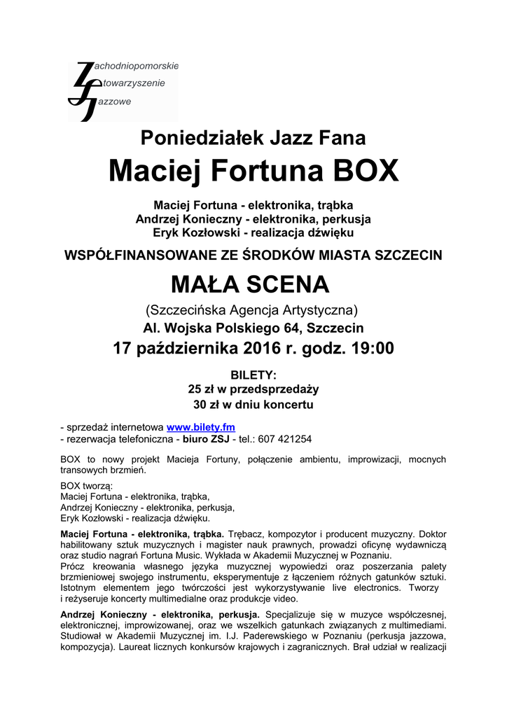 Poniedziałek Jazz Fana Maciej Fortuna BOX Maciej Fortuna - elektronika, trąbka Andrzej Konieczny - elektronika, perkusja Eryk Kozłowski - realizacja dźwięku WSPÓŁFINANSOWANE ZE ŚRODKÓW MIASTA SZCZECIN MAŁA SCENA (Szczecińska Agencja Artystyczna) Al. Wojska Polskiego 64, Szczecin 17 października 2016 r. godz. 19:00 BILETY: 25 zł w przedsprzedaży 30 zł w dniu koncertu - sprzedaż internetowa www.bilety.fm - rezerwacja telefoniczna - biuro ZSJ - tel.: 607 421254 BOX to nowy projekt Macieja Fortuny, połączenie ambientu, improwizacji, mocnych transowych brzmień. BOX tworzą: Maciej Fortuna - elektronika, trąbka, Andrzej Konieczny - elektronika, perkusja, Eryk Kozłowski - realizacja dźwięku. Maciej Fortuna - elektronika, trąbka. Trębacz, kompozytor i producent muzyczny. Doktor habilitowany sztuk muzycznych i magister nauk prawnych, prowadzi oficynę wydawniczą oraz studio nagrań Fortuna Music. Wykłada w Akademii Muzycznej w Poznaniu. Prócz kreowania własnego języka muzycznej wypowiedzi oraz poszerzania palety brzmieniowej swojego instrumentu, eksperymentuje z łączeniem różnych gatunków sztuki. Istotnym elementem jego twórczości jest wykorzystywanie live electronics. Tworzy i reżyseruje koncerty multimedialne oraz produkcje video. Andrzej Konieczny - elektronika, perkusja. Specjalizuje się w muzyce współczesnej, elektronicznej, improwizowanej, oraz we wszelkich gatunkach związanych z multimediami. Studiował w Akademii Muzycznej im. I.J. Paderewskiego w Poznaniu (perkusja jazzowa, kompozycja). Laureat licznych konkursów krajowych i zagranicznych. Brał udział w realizacji kilkudziesięciu płyt zarówno jako perkusista, kompozytor jak i producent. Poszukuje nowych środków wyrazu, inspirując się współczesną architekturą, grafiką i reklamą. Jest zorientowany na związane z neuronauką dziedziny zaprzęgnięte w służbę muzyki – takie jak kognitywistyka i psychologia. Eryk Kozłowski - realizacja dźwięku. Absolwent Reżyserii Dźwięku i Akustyki Wydziału Fizyki UAM, dziennikarz poznańskiego Radia Afera, realizator dźwięku Radia Afera i Radia Merkury Poznań, autor licznych rejestracji dźwiękowych koncertów i płyt. Od 2008 r. producent Festiwalu ANIMATOR, od 2011 r. producent Festiwalu Poznań Baroque. Od 2013 r. Dyrektor Artystyczny Międzynarodowego Festiwalu Jazzowego Made In Chicago. www.maciejfortuna.pl www.fortuna-music.com/ https://www.facebook.com/maciej.fortuna https://www.youtube.com/user/wwwMACIEJFORTUNApl Więcej na: www.zsj.com.pl www.saa.pl www.facebook.com/PoniedziałekJazzFana2016 Organizator: Zachodniopomorskie Stowarzyszenie Jazzowe Al. Wojska Polskiego 90, 70-482 Szczecin www.zsj.com.pl Partner: Szczecińska Agencja Artystyczna Al. Wojska Polskiego 64, 70-479 Szczecin www.saa.pl WSPÓŁFINANSOWANE ZE ŚRODKÓW MIASTA SZCZECIN