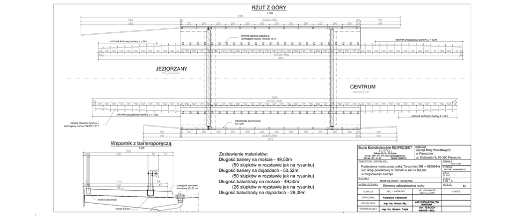 RZUT Z GÓRY 1:100 bariera stalowa zgodna z wymogami normy PN-EN 1317 odcinek końcowy bariery L = 8m odcinek początkowy bariery L = 12m JEZIORZANY CENTRUM odcinek początkowy bariery L = 12m odcinek końcowy bariery L = 8m balustrada aluminiowa h=1,2m bariera stalowa zgodna z wymogami normy PN-EN 1317 Wspornik z barieroporęczą 1:25 krawęŜnik mostowy kamienny 20x20 cm marka balustrady marka bariery Zestawienie materiałów: Długość bariery na moście - 49,50m (50 słupków w rozstawie jak na rysunku) Długość bariery na dojazdach - 50,52m (50 słupków w rozstawie jak na rysunku) Długość balustrady na moście - 49,50m (26 słupków w rozstawie jak na rysunku) Długość balustrady na dojazdach - 29,09m Zarząd Dróg Powiatowych w Piasecznie ul. Kościuszki 9, 05-500 Piaseczno MOSTOWA Przebudowa mostu przez rzekę Tarczynkę (JNI = 0109684) w/c drogi powiatowej nr 2855W w km 0+161,00, w miejscowości Tarczyn Most na rzece Tarczynka Elementy zabezpieczenia ruchu PROJEKT WYKONAWCZY 12.2010 1:100 1:25 16