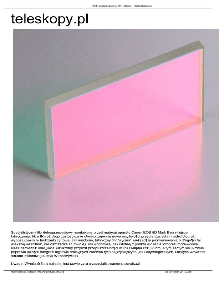Filtr IR do Canon EOS 5D MK II (Baader) - oferta teleskopy.pl teleskopy.pl Specjalistyczny filtr dolnoprzepustowy montowany przed matryc± aparatu Canon EOS 5D Mark II na miejsce fabrycznego filtru IR-cut. Jego zastosowanie otwiera zupe³nie nowe mo¿liwo¶ci przed entuzjastami astrofotografii wyposa¿onymi w lustrzanki cyfrowe. Jak wiadomo, fabryczny filtr "wycina" wiêkszo¶æ promieniowania o d³ugo¶ci fali wiêkszej od 650nm, nie oszczêdzaj±c równie¿ linii wodorowej, tak istotnej z punktu widzenia fotografii mg³awicowej. Nasz zamiennik umo¿liwia kilkukrotny przyrost przepuszczalno¶ci w linii H-alpha 656,28 nm, a tym samym kilkukrotnie poprawia jako¶æ fotografii mg³awic emisyjnych zarówno tych najja¶niejszych, jak i najodleglejszych, ukrytych wewn±trz struktur milionów galaktyk Wszech¶wiata. Uwaga! Wymianê filtra najlepiej jest powierzyæ wyspecjalizowanemu serwisowi! http://teleskopy.pl/product_info.php?products_id=3318 20 November, 2014, 02:58 Filtr IR do Canon EOS 5D MK II (Baader) - oferta teleskopy.pl • przeznaczenie: Canon EOS 5D • wymiary: 36x24 mm http://teleskopy.pl/product_info.php?products_id=3318 20 November, 2014, 02:58