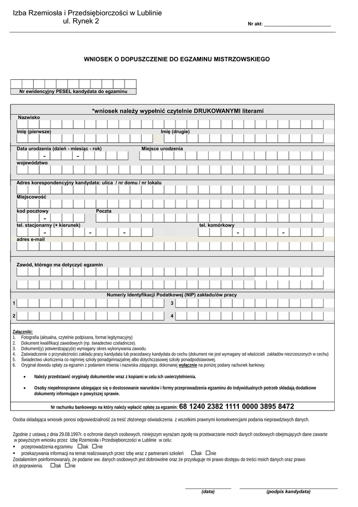 Izba Rzemiosła i Przedsiębiorczości w Lublinie ul. Rynek 2 Nr akt: _________________________ WNIOSEK O DOPUSZCZENIE DO EGZAMINU MISTRZOWSKIEGO Nr ewidencyjny PESEL kandydata do egzaminu *wniosek należy wypełnić czytelnie DRUKOWANYMI literami Nazwisko Imię (pierwsze) Imię (drugie) Data urodzenia (dzień - miesiąc - rok) - Miejsce urodzenia - województwo Adres korespondencyjny kandydata: ulica / nr domu / nr lokalu Miejscowość kod pocztowy Poczta tel. stacjonarny (+ kierunek) - tel. komórkowy - - - - adres e-mail Zawód, którego ma dotyczyć egzamin Numer/y Identyfikacji Podatkowej (NIP) zakładu/ów pracy 1 3 2 4 Załączniki: 1. Fotografia (aktualna, czytelnie podpisana, format legitymacyjny) 2. Dokument kwalifikacji zawodowych (np. świadectwo czeladnicze). 3. Dokument(y) potwierdzający(e) wymagany okres wykonywania zawodu. 4. Zaświadczenie o przynależności zakładu pracy kandydata lub pracodawcy kandydata do cechu (dokument nie jest wymagany od właścicieli zakładów niezrzeszonych w cechu) 5. Świadectwo ukończenia co najmniej szkoły ponadgimnazjalnej albo dotychczasowej szkoły ponadpodstawowej. 6. Oryginał dowodu opłaty za egzamin z podaniem imienia i nazwiska zdającego, dokonanej wyłącznie na poniżej podany rachunek bankowy. Należy przedstawić oryginały dokumentów wraz z kopiami w celu ich uwierzytelnienia. Osoby niepełnosprawne ubiegające się o dostosowanie warunków i formy przeprowadzenia egzaminu do indywidualnych potrzeb składają dodatkowe dokumenty informujące o powyższej sprawie. Nr rachunku bankowego na który należy wpłacić opłatę za egzamin: 68 1240 2382 1111 0000 3895 8472 Osoba składająca wniosek ponosi odpowiedzialność za treść złożonego oświadczenia z wszelkimi prawnymi konsekwencjami podania nieprawdziwych danych. Zgodnie z ustawą z dnia 29.08.1997r. o ochronie danych osobowych, niniejszym wyrażam zgodę na przetwarzanie moich danych osobowych obejmujących dane zawarte w powyższym wniosku przez Izbę Rzemiosła i Przedsiębiorczości w Lublinie w celu: przeprowadzenia egzaminu tak nie przekazywania informacji na temat realizowanych przez Izbę wraz z partnerami szkoleń tak nie Zostałam/em poinformowana/y, że podanie ww. danych osobowych jest dobrowolne oraz że przysługuje mi prawo dostępu do treści moich danych oraz prawo ich poprawienia. tak nie (data) (podpis kandydata) Wypełnia Izba Na podstawie złożonych dokumentów Izba stwierdza, iż w/w osoba spełnia poniższy warunek dopuszczający do egzaminu mistrzowskiego (rozporządzenie MEN w sprawie egz. czeladniczego, egz. mistrzowskiego oraz egz. sprawdzającego, przeprowadzanych przez komisje egzaminacyjne izb rzemieślniczych (Dz.U. z 2012 r., poz. 1117, § 7): posiada świadectwo ukończenia szkoły ponadgimnazjalnej albo dotychczasowej szkoły ponadpodstawowej oraz tytuł czeladnika lub równorzędny w zawodzie, w którym zdaje egzamin, a także: co najmniej trzyletni okres wykonywania zawodu, w którym zdaje egzamin, po uzyskaniu tytułu zawodowego, albo co najmniej sześcioletni okres wykonywania zawodu, w którym zdaje egzamin, łącznie przed i po uzyskaniu tytułu zawodowego; posiada świadectwo ukończenia szkoły ponadgimnazjalnej albo dotychczasowej szkoły ponadpodstawowej oraz co najmniej sześcioletni okres wykonywania zawodu, w którym zdaje egzamin, w ramach samodzielnie prowadzonej działalności gospodarczej; posiada świadectwo ukończenia szkoły ponadgimnazjalnej albo dotychczasowej szkoły ponadpodstawowej oraz tytuł czeladnika lub równorzędny w zawodzie wchodzącym w zakres zawodu, w którym zdaje egzamin, a także co najmniej trzyletni okres wykonywania zawodu, w którym zdaje egzamin, po uzyskaniu tytułu zawodowego; posiada świadectwo ukończenia szkoły ponadgimnazjalnej albo dotychczasowej szkoły ponadpodstawowej oraz tytuł mistrza w zawodzie wchodzącym w zakres zawodu, w którym zdaje egzamin, a także co najmniej roczny okres wykonywania zawodu, w którym zdaje egzamin, po uzyskaniu tytułu mistrza; posiada świadectwo ukończenia szkoły ponadgimnazjalnej albo dotychczasowej szkoły ponadpodstawowej, dających wykształcenie średnie i kształcących w zawodzie wchodzącym w zakres zawodu, w którym zdaje egzamin, oraz tytuł zawodowy w zawodzie wchodzącym w zakres zawodu, w którym zdaje egzamin, a także co najmniej dwuletni okres wykonywania zawodu, w którym zdaje egzamin, po uzyskaniu tytułu zawodowego; posiada dyplom ukończenia szkoły wyższej na kierunku lub w specjalności w zakresie wchodzącym w zakres zawodu, w którym zdaje egzamin, oraz co najmniej roczny okres wykonywania zawodu, w którym zdaje egzamin, po uzyskaniu tytułu zawodowego. (data) (podpis osoby przyjmującej wniosek)