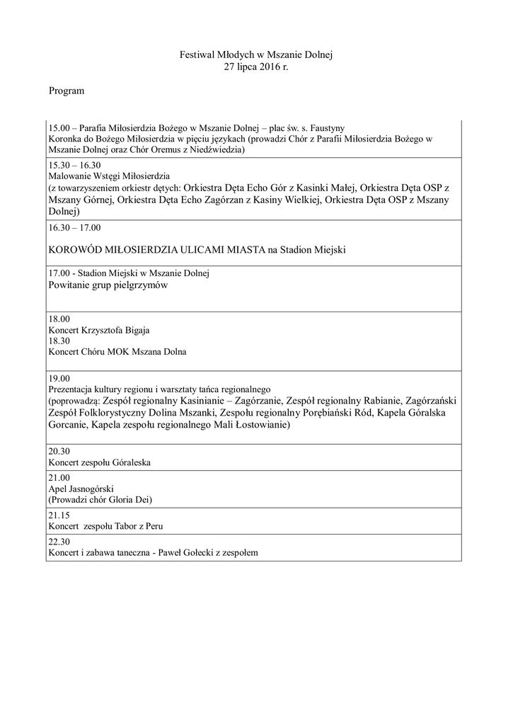 Festiwal Młodych w Mszanie Dolnej 27 lipca 2016 r. Program 15.00 – Parafia Miłosierdzia Bożego w Mszanie Dolnej – plac św. s. Faustyny Koronka do Bożego Miłosierdzia w pięciu językach (prowadzi Chór z Parafii Miłosierdzia Bożego w Mszanie Dolnej oraz Chór Oremus z Niedźwiedzia) 15.30 – 16.30 Malowanie Wstęgi Miłosierdzia (z towarzyszeniem orkiestr dętych: Orkiestra Dęta Echo Gór z Kasinki Małej, Orkiestra Dęta OSP z Mszany Górnej, Orkiestra Dęta Echo Zagórzan z Kasiny Wielkiej, Orkiestra Dęta OSP z Mszany Dolnej) 16.30 – 17.00 KOROWÓD MIŁOSIERDZIA ULICAMI MIASTA na Stadion Miejski 17.00 - Stadion Miejski w Mszanie Dolnej Powitanie grup pielgrzymów 18.00 Koncert Krzysztofa Bigaja 18.30 Koncert Chóru MOK Mszana Dolna 19.00 Prezentacja kultury regionu i warsztaty tańca regionalnego (poprowadzą: Zespół regionalny Kasinianie – Zagórzanie, Zespół regionalny Rabianie, Zagórzański Zespół Folklorystyczny Dolina Mszanki, Zespołu regionalny Porębiański Ród, Kapela Góralska Gorcanie, Kapela zespołu regionalnego Mali Łostowianie) 20.30 Koncert zespołu Góraleska 21.00 Apel Jasnogórski (Prowadzi chór Gloria Dei) 21.15 Koncert zespołu Tabor z Peru 22.30 Koncert i zabawa taneczna - Paweł Gołecki z zespołem