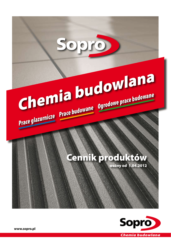 a n a l w do u e n a b w o d u a i e b c a r p e m w e do o r g h O e C ze Prace budowan c i n r u z a l Prace g Cennik produktów ważny od 1.04.2012 www.sopro.pl Chemia budowlana Wyciąg z „Ogólnych warunków sprzedaży i dostaw Sopro Polska” Cenyproduktów i towarów handlowych rozumiane są jako ceny netto w PLN (bez podatku VAT) na bazie ex magazyn w Nowinach, Warszawie i Poznaniu. Fakturywystawiane są przez Sopro Polska Sp. z o.o. w Warszawie. Wysokość podatku VAT jest wyodrębniona na każdej wystawionej fakturze. Warunki płatności w terminach zgodnych z ustaleniami zawartymi w indywidualnych umowach kupna-sprzedaży, na niżej wymienione konto bankowe: Bank PEKAO S.A. IX Oddział w Warszawie ul. Dereniowa 9 02-776 Warszawa Nr konta: 48 1240 1125 1111 0010 0044 2760 Prawa zabezpieczająceDo momentu uregulowania należności, towar pobrany przez Kupującego pozostaje własnością Sopro Polska Sp. z o.o.. W przypadku zamówień poniżej 1.500,00 zł netto Sopro Polska Sp. z o.o. zastrzega sobie prawo obniżenia rabatu tytułem pokrycia kosztów manipulacyjnych. Wszelkie pozostałe sprawy związane z naszym cennikiem regulują „Ogólne warunki sprzedaży i dostaw Sopro Polska Sp. z o.o.” w załączeniu. Niniejszy cennik anuluje wszystkie poprzednie. www.sopro.pl Chemia budowlana Prace glazurnicze Zaprawy klejowe i kleje Dyspersje uelastyczniające Zaprawy fugowe Saphir®, Brillant® i DF 10 Fugi epoksydowe i preparaty do fug epoksydowych Fugi dylatacyjne Sznur dylatacyjny Fugi silikonowe Preparaty do silikonu Zaprawy fugowe specjalne Zaprawy przyczepne Podkłady przyczepne i gruntujące Szpachle Szpachle samopoziomujące Środki do napraw Narzędzia do Soproduru® Uszczelnienia Uszczelnienia / wyposażenie Płyty ocieplająco-wygłuszające Środki do czyszczenia i pielęgnacji Impregnaty Narzędzia Okapniki balkonowo-tarasowe Profile tarasowo-balkonowe Prace budowlane Ogrodowe prace budowlane Spoiwa i zaprawy do jastrychów Dodatki do zapraw i jastrychów Uszczelnienia Zaprawy montażowe Szpachle samopoziomujące Szpachle Zaprawy do murowania Epoksydowy lakier do betonu – wysokowytrzymały Materiały do renowacji betonu Farby ochronne do betonu Fugi do kostki brukowej Bitumy Tynki naprawcze i renowacyjne Ogólne warunki sprzedaży i dostaw Skorowidz produktów Tablica kolorów fug Organizacja sieci sprzedaży Dane adresowe Strona 2 2 3 4 4 4 5 5 6 6 6 7 7 7 7 8 8 8 9 9 9 10 10 Strona 11 11 11 11 12 12 12 12 13 13 14 14 15 15 - 17 18 - 19 20 III okładka IV okładka Zaprawy klejowe Nr kat. 264 372 372e 400 404 413 414 419 444 450 450e 451 455 457 665 666 669 885 888 996 997 Nazwa SoproDur® HF 264 /PXPžŗ Wielofunkcyjna zaprawa klejowa - wysokowytrzymała Sopro FBK 372 Nowe właściwości Standardowa zaprawa klejowa (odbiór pełnopaletowy) Sopro FBK 372 extra Zaprawa klejowa wzmocniona (odbiór pełnopaletowy) Sopro No.1 Wysokoelastyczna zaprawa klejowa (S1) Sopro No.1 ● Wysokoelastyczna, wielofunkcyjna zaprawa klejowa szybkowiążąca Sopro VF 413 XL Elastyczna zaprawa klejowa do płyt wielkoformatowych (S1) /PXPžŗ Sopro TR 414 Zaprawa klejowa elastyczna z trasem Sopro VF 419 Elastyczna zaprawa klejowa do podłóg szybkowiążąca Sopro FKM XL Wysokoelastyczna superlekka zaprawa klejowa Sopro FF 450 Elastyczna zaprawa klejowa (odbiór pełnopaletowy) Sopro FF 450 extra /PXPžŗ Elastyczna zaprawa klejowa S1 Sopro FF 451 Zaprawa klejowa szybkowiążąca Sopro FF 455 Elastyczna zaprawa klejowa biała Sopro FF 457 Elastyczna zaprawa klejowa z trasem megaFlex S2 ● ● A – 25 kg Wysokoelastyczna dwuskładnikowa zaprawa klejowa S2 B – 8,25 kg megaFlex S2 turbo ● ● A – 25 kg Wysokoelastyczna dwuskładnikowa zaprawa klejowa S2 B – 8,25 kg szybkowiążąca Sopro MG-Flex MicroGum S2 ● Wysokoelastyczna jednoskładnikowa zaprawa klejowa Sopro MDM 885 ● Zaprawa średnio- i grubowarstwowa biała Sopro MDM 888 ● Zaprawa średnio- i grubowarstwowa z trasem Sopro No.1 Nowe właściwości Wysokoelastyczna zaprawa klejowa biała (S1) Sopro No.1 biała, szybka ● Wysokoelastyczna, szybkowiążąca zaprawa klejowa biała Cena netto loco magazyn PLN worek 25 kg kg torba 5 kg 85,00 3,40 — kg Opakowanie zbiorcze Zużycie paleta 1000 kg ok. 1,4 kg/m2 na 1 mm grub. warstwy ok. 1,2 kg/m2 na 1 mm grub. warstwy ok. 1,2 kg/m2 na 1 mm grub. warstwy ok. 1,1 kg/m2 na 1 mm grub. warstwy ok. 1,2 kg/m2 na 1 mm grub. warstwy ok. 1,1 kg/m2 na 1 mm grub. warstwy ok. 1,3 kg/m2 na 1 mm grub. warstwy ok. 1,2 kg/m2 na 1 mm grub. warstwy ok. 0,7 kg/m2 na 1 mm grub. warstwy ok. 1,2 kg/m2 na 1 mm grub. warstwy ok. 1,2 kg/m2 na 1 mm grub. warstwy ok. 1,3 kg/m2 na 1 mm grub. warstwy ok. 1,3 kg/m2 na 1 mm grub. warstwy ok. 1,2 kg/m2 na 1 mm grub. warstwy 27,00 1,08 — paleta 1000 kg 38,00 1,52 — paleta 1000 kg 92,50 3,70 31,00 140,00 5,60 — paleta 1000 kg 83,00 3,32 — paleta 1000 kg 63,25 2,53 — paleta 1000 kg 93,50 3,74 — paleta 1000 kg 102,90 (worek 15 kg) 61,50 6,86 — paleta 600 kg 2, 46 22,25 72,00 2,88 — paleta 1000 kg 68,00 2,72 — paleta 1000 kg 66,00 2,64 24,25 67,00 2,68 — paleta 1000 kg 140,00 206,25 194,00 247,50 5,60 25,00 7,76 30,00 — — — — paleta 40 szt. paleta 60 szt. paleta 40 szt. paleta 60 szt. 150,00 (worek 15 kg) 145,00 10,00 — paleta 750 kg 5,80 — paleta 1000 kg 132,50 5,30 — paleta 1000 kg 103,25 4,13 — paleta 1000 kg 183,00 7,32 — paleta 1000 kg 6,20 4,45 4,85 paleta 1000 kg paleta 1000 kg paleta 1000 kg ok. 1,5 kg/m2 (A) + ok. 0,495 kg/m2 (B) na 1 mm grub. warstwy ok. 0,9 kg/m2 na 1 mm grub. warstwy ok. 1,4 kg/m2 na 1 mm grub. warstwy ok. 1,4 kg/m2 na 1 mm grub. warstwy ok. 1,1 kg/m2 na 1 mm grub. warstwy ok. 1,2 kg/m2 na 1 mm grub. warstwy Kleje Nr kat. 500 503 818 Cena netto loco magazyn PLN Nazwa opakowanie Sopro DBE 500 Klej epoksydowy (składnik A+B) Sopro PUK 503 Klej poliuretanowy Sopro Racofix® Klej montażowy Opakowanie zbiorcze Zużycie kg ok. 1,6 kg/m2 na 1 mm grub. warstwy ok. 1,5 kg/m2 na 1 mm grub. warstwy 100-1