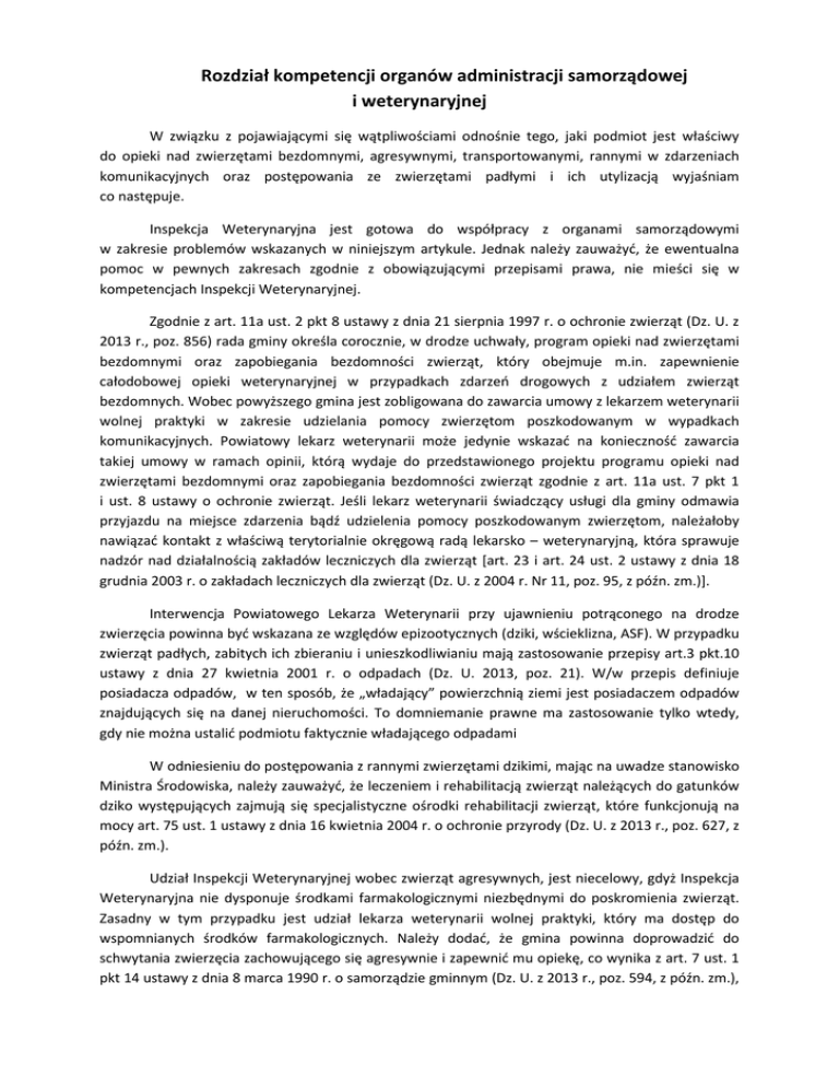 Rozdział kompetencji organów administracji samorządowej i weterynaryjnej W związku z pojawiającymi się wątpliwościami odnośnie tego, jaki podmiot jest właściwy do opieki nad zwierzętami bezdomnymi, agresywnymi, transportowanymi, rannymi w zdarzeniach komunikacyjnych oraz postępowania ze zwierzętami padłymi i ich utylizacją wyjaśniam co następuje. Inspekcja Weterynaryjna jest gotowa do współpracy z organami samorządowymi w zakresie problemów wskazanych w niniejszym artykule. Jednak należy zauważyć, że ewentualna pomoc w pewnych zakresach zgodnie z obowiązującymi przepisami prawa, nie mieści się w kompetencjach Inspekcji Weterynaryjnej. Zgodnie z art. 11a ust. 2 pkt 8 ustawy z dnia 21 sierpnia 1997 r. o ochronie zwierząt (Dz. U. z 2013 r., poz. 856) rada gminy określa corocznie, w drodze uchwały, program opieki nad zwierzętami bezdomnymi oraz zapobiegania bezdomności zwierząt, który obejmuje m.in. zapewnienie całodobowej opieki weterynaryjnej w przypadkach zdarzeń drogowych z udziałem zwierząt bezdomnych. Wobec powyższego gmina jest zobligowana do zawarcia umowy z lekarzem weterynarii wolnej praktyki w zakresie udzielania pomocy zwierzętom poszkodowanym w wypadkach komunikacyjnych. Powiatowy lekarz weterynarii może jedynie wskazać na konieczność zawarcia takiej umowy w ramach opinii, którą wydaje do przedstawionego projektu programu opieki nad zwierzętami bezdomnymi oraz zapobiegania bezdomności zwierząt zgodnie z art. 11a ust. 7 pkt 1 i ust. 8 ustawy o ochronie zwierząt. Jeśli lekarz weterynarii świadczący usługi dla gminy odmawia przyjazdu na miejsce zdarzenia bądź udzielenia pomocy poszkodowanym zwierzętom, należałoby nawiązać kontakt z właściwą terytorialnie okręgową radą lekarsko – weterynaryjną, która sprawuje nadzór nad działalnością zakładów leczniczych dla zwierząt [art. 23 i art. 24 ust. 2 ustawy z dnia 18 grudnia 2003 r. o zakładach leczniczych dla zwierząt (Dz. U. z 2004 r. Nr 11, poz. 95, z późn. zm.)]. Interwencja Powiatowego Lekarza Weterynarii przy ujawnieniu potrąconego na drodze zwierzęcia powinna być wskazana ze względów epizootycznych (dziki, wścieklizna, ASF). W przypadku zwierząt padłych, zabitych ich zbieraniu i unieszkodliwianiu mają zastosowanie przepisy art.3 pkt.10 ustawy z dnia 27 kwietnia 2001 r. o odpadach (Dz. U. 2013, poz. 21). W/w przepis definiuje posiadacza odpadów, w ten sposób, że „władający” powierzchnią ziemi jest posiadaczem odpadów znajdujących się na danej nieruchomości. To domniemanie prawne ma zastosowanie tylko wtedy, gdy nie można ustalić podmiotu faktycznie władającego odpadami W odniesieniu do postępowania z rannymi zwierzętami dzikimi, mając na uwadze stanowisko Ministra Środowiska, należy zauważyć, że leczeniem i rehabilitacją zwierząt należących do gatunków dziko występujących zajmują się specjalistyczne ośrodki rehabilitacji zwierząt, które funkcjonują na mocy art. 75 ust. 1 ustawy z dnia 16 kwietnia 2004 r. o ochronie przyrody (Dz. U. z 2013 r., poz. 627, z późn. zm.). Udział Inspekcji Weterynaryjnej wobec zwierząt agresywnych, jest niecelowy, gdyż Inspekcja Weterynaryjna nie dysponuje środkami farmakologicznymi niezbędnymi do poskromienia zwierząt. Zasadny w tym przypadku jest udział lekarza weterynarii wolnej praktyki, który ma dostęp do wspomnianych środków farmakologicznych. Należy dodać, że gmina powinna doprowadzić do schwytania zwierzęcia zachowującego się agresywnie i zapewnić mu opiekę, co wynika z art. 7 ust. 1 pkt 14 ustawy z dnia 8 marca 1990 r. o samorządzie gminnym (Dz. U. z 2013 r., poz. 594, z późn. zm.), gdzie zapisano, że zadania własne gminy obejmują w szczególności sprawy porządku publicznego i bezpieczeństwa obywateli. W związku z tym gmina powinna posiadać umowę z podmiotem wyłapującym zwierzęta, przy czym podmiot ten powinien być zaopatrzony w odpowiedni sprzęt do odłowienia zwierząt agresywnych. Zabezpieczenie miejsca zdarzenia i zapewnienie dalszego transportu zwierząt przewożonych pojazdami, które uległy unieruchomieniu w wyniku zdarzeń drogowych, nie należy do kompetencji Inspekcji Weterynaryjnej, ponieważ Inspekcja Weterynaryjna jest odpowiedzialna za sprawowanie nadzoru nad przestrzeganiem przepisów o ochronie zwierząt w transporcie, a nie za ich bezpośrednią realizację. W świetle rozporządzenia Rady (WE) nr 1/2005 z dnia 22 grudnia 2004 r. w sprawie ochrony zwierząt podczas transportu i związanych z tym działań oraz zmieniającego dyrektywy 64/432/EWG i 93/119/WE oraz rozporządzenie (WE) nr 1255/97 (Dz. Urz. UE L 3 z 5.1.2005, str. 1) obowiązek zapewnienia dalszego transportu zwierząt spoczywa na przewoźniku. Powiatowy Lekarz Weterynarii może jedynie udzielić informacji o miejscach, do których można przetransportować zwierzęta biorące udział w zdarzeniu do czasu zorganizowania zastępczego środka transportu. W razie długotrwałego transportu zwierząt, tj. podróży przekraczającej 8 godzin, przewoźnik ma obowiązek posiadać plan kryzysowy w nagłych przypadkach, co wynika z art. 11 ust. 1 lit. b ppkt iv) rozporządzenia Rady (WE) nr 1/2005. W przypadku ujawnienia hodowli i obrotu zwierzętami gatunków chronionych przewóz, obserwacja i poddanie kwarantannie wskazanych zwierząt są poza kompetencjami Inspekcji Weterynaryjnej. Właściwym rozwiązaniem jest nawiązanie współpracy z organami ochrony przyrody, w szczególności z właściwą regionalną dyrekcją ochrony środowiska. Powiatowi Lekarze Weterynarii nie mogą organizować miejsc czasowego przetrzymywania bezdomnych zwierząt z uwagi na brak podstaw prawnych do takiego działania. Jak już wcześniej wskazano, zapewnianie opieki bezdomnym zwierzętom oraz ich wyłapywanie należy do zadań własnych gmin, co wynika z art. 11 ust. 1 ustawy o ochronie zwierząt. Dalej, art. 11a ust. 2 pkt 1 i 7 tej ustawy stanowi, że gmina zapewnia bezdomn