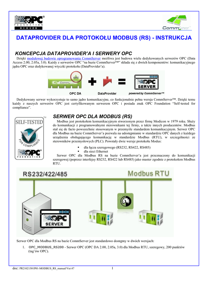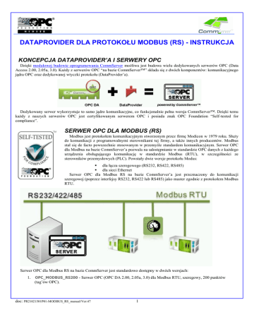 DATAPROVIDER DLA PROTOKOŁU MODBUS (RS) - INSTRUKCJA KONCEPCJA DATAPROVIDER’A I SERWERY OPC Dzięki modułowej budowie oprogramowania CommServer możliwa jest budowa wielu dedykowanych serwerów OPC (Data Access 2.00, 2.05a, 3.0). Każdy z serwerów OPC “na bazie CommServer™” składa się z dwóch komponentów: komunikacyjnego jądra OPC oraz dedykowanej wtyczki protokołu (DataProvider’a). Dedykowany serwer wykorzystuje to samo jądro komunikacyjne, co funkcjonalnie pełna wersja CommServer™. Dzięki temu każdy z naszych serwerów OPC jest certyfikowanym serwerem OPC i posiada znak OPC Foundation “Self-tested for compliance”. SERWER OPC DLA MODBUS (RS) Modbus jest protokołem komunikacyjnym stworzonym przez firmę Modicon w 1979 roku. Służy do komunikacji z programowalnymi sterownikami tej firmy, a także innych producentów. Modbus stał się de facto powszechnie stosowanym w przemyśle standardem komunikacyjnym. Serwer OPC dla Modbus na bazie CommServer’a pozwala na udostępnianie w standardzie OPC danych z każdego urządzenia obsługującego komunikację w standardzie Modbus (RTU), w szczególności ze sterowników przemysłowych (PLC). Powstały dwie wersje protokołu Modus: dla łącza szeregowego (RS232, RS422, RS485) dla sieci Ethernet Serwer OPC dla Modbus RS na bazie CommServer’a jest przeznaczony do komunikacji szeregowej (poprzez interfejsy RS232, RS422 lub RS485) jako master zgodnie z protokołem Modbus RTU. Serwer OPC dla Modbus RS na bazie CommServer jest standardowo dostępny w dwóch wersjach: 1. OPC_MODBUS_RS200 - Serwer OPC (OPC DA 2.00, 2.05a, 3.0) dla Modbus RTU, szeregowy, 200 punktów (tag’ów OPC). doc: PR21021501P01-MODBUS_RS_manual/Ver:47 1 2. OPC_MODBUS_RS1K - Serwer OPC (OPC DA 2.00, 2.05a, 3.0) dla Modbus RTU, szeregowy, 1000 punktów (tag'ów OPC). Jeżeli potrzebna jest inna wersja produktu prosimy o kontakt. Serwer OPC dla Modbus na bazie CommServer jest certyfikowanym serwerem OPC i posiada znak OPC Foundation “Self-tested for compliance”. Serwer umożliwia komunikację z dowolnym urządzeniem zgodnym ze standardem Modbus, między innymi ze sterownikami PLC i systemami DCS następujących producentów: ABB Emerson Saia-Burgess Allen-Bradley GE Fanuc Schneider (Modicon) Beckhoff Honeywell Yokogawa Control Koyo DGH Mitsubishi SZCZEGÓŁY TECHNICZNE W celu wykorzystania protokołu MODBUS RTU należy uruchomić oprogramowanie Network Configuration i wybrać DP.MODBUS.RS (CAS.CommSvrPlugin_MODBUS) dla komunikacji z wykorzystaniem łącz szeregowych. W tym przypadku należy wybrać typ transmisji RS lub TCP/UDP1. Ustawienie interfejsu komunikacyjnego Łącze szeregowe (port RS) należy skonfigurować tak samo, jak interfejs sterownika, do którego się podłączamy. Standardowe ustawienia portu COM dla CommServer’a: Baud rate: 9600 bps Parity: None Data bits: 8 Stop bit: 1 Możliwe jest wykorzystanie TCP/UDP do przesyłania ramek Modbus RTU. Jeżeli chcemy wykorzystać ten typ komunikacji należy wybrać TCP lub UDP w ustawieniach. Ustawienie SocketNumber jest ignorowane i wartość domyślna może zostać ustawiona na -1 (ustawienie to jest potrzebne przy wykorzystywaniu protokołu po stronie slave). Ustawienia protokołu Modbus CommServer umożliwia ustawianie parametrów transmisji i timeout’ów dla DataProvider’a Modbus. W większości przypadków zalecane są ustawienia standardowe, jednak w przypadku potrzeby zmian do dyspozycji są następujące parametry: InterframeGap – czas w milisekundach, jaki musi upłynąć przed transmisją kolejnej ramki. MaxNumberOfRetries – maksymalna ilość powtórzeń, jaką należy wykonać przed uznaniem, że komunikacja ze zdalną stacją nie jest możliwa; nastąpi 1 Nie jest to ustawienie standardowe, ale wiele rozwiązań (np. niektóre zdalne serwery portów lub urządzenia firmy Control Sp. z o.o.) wykorzystuje protokół TCP/UDP do przesyłu ramek Modbus RTU. doc: PR21021501P01-MODBUS_RS_manual/Ver:47 2 wtedy przełączenie na kolejny interfejs, jeżeli został on skonfigurowany. Interfejs, po którym komunikacja nie jest możliwa, zostanie oznaczony jako uszkodzony i pozostanie w tym stanie do momentu, aż upłynie zdefiniowany czas („czas bezczynności po uszkodzeniu”). ResponseTimeOut – maksymalny czas, jaki może upłynąć w oczekiwaniu na ramkę odpowiedzi. Timeout15 - maksymalny czas w mikrosekundach, jaki może upłynąć podczas odczytywania ramki odpowiedzi do czasu otrzymania kolejnego znaku odpowiedzi. Zalecane jest, by był on równy czasowi transmisji półtora znaku w łączu szeregowym (przy ustalonej wcześniej prędkości transmisji), ze względu na ograniczenia systemu Windows nie zalecane jest ustawianie czasu krótszego niż 11 milisekund. Timeout35 - maksymalny czas w po jakim Modbus DataProvider uznaje, że żaden nowy znak się nie pojawi i ramka została zakończona. Zalecane jest, by był on równy czasowi transmisji trzech i pół znaków w łączu szeregowym (przy ustalonej wcześniej prędkości transmisji) Uwaga: Ustawienia domyśle są optymalnymi dla komunikacji z wykorzystaniem łącza szeregowego; w przypadku wykorzystana komunikacja TCP/UDP zalecane jest „podkręcenie” ustawień. Uwaga: Przy korzystaniu z warstwy transportowej TCP/UDP do przesyłania ramek Modbus RTU należy odpowiednio skonfigurować adres segmentu. Trybu TCP/UDP można użyć na przykład, gdy łączymy się poprzez zdalny serwer portów (np. PortServer One TS firm DIGI). W tym przypadku należy ustawić typu protokołu na TCP: Istotne jest też ustawienie właściwego adresu segmentu. W tym przypadku wpisujemy adres w postaci: adres_IP_serwera:port_na_który_się_łączymy Na poniższym rysunku pokazano przykład połączenia z serwerem PortServer One TS, który znajduje się pod adresem 192.168.0.8 i wykorzystuje port 2101 do komunikacji: Konfiguracja i interpretacja odczytywanych danych DataProvider dla protokołu ModBUS odczytuje dane blokowo. Zapytania wysy