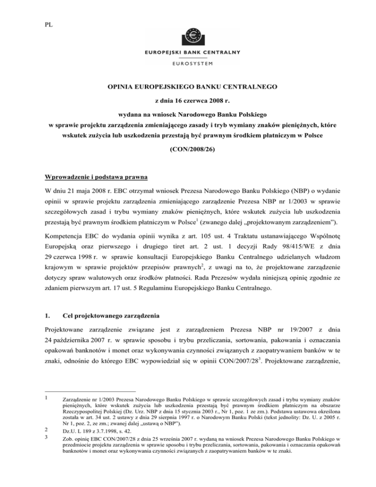 PL OPINIA EUROPEJSKIEGO BANKU CENTRALNEGO z dnia 16 czerwca 2008 r. wydana na wniosek Narodowego Banku Polskiego w sprawie projektu zarządzenia zmieniającego zasady i tryb wymiany znaków pieniężnych, które wskutek zużycia lub uszkodzenia przestają być prawnym środkiem płatniczym w Polsce (CON/2008/26) Wprowadzenie i podstawa prawna W dniu 21 maja 2008 r. EBC otrzymał wniosek Prezesa Narodowego Banku Polskiego (NBP) o wydanie opinii w sprawie projektu zarządzenia zmieniającego zarządzenie Prezesa NBP nr 1/2003 w sprawie szczegółowych zasad i trybu wymiany znaków pieniężnych, które wskutek zużycia lub uszkodzenia przestają być prawnym środkiem płatniczym w Polsce1 (zwanego dalej „projektowanym zarządzeniem”). Kompetencja EBC do wydania opinii wynika z art. 105 ust. 4 Traktatu ustanawiającego Wspólnotę Europejską oraz pierwszego i drugiego tiret art. 2 ust. 1 decyzji Rady 98/415/WE z dnia 29 czerwca 1998 r. w sprawie konsultacji Europejskiego Banku Centralnego udzielanych władzom krajowym w sprawie projektów przepisów prawnych2, z uwagi na to, że projektowane zarządzenie dotyczy spraw walutowych oraz środków płatności. Rada Prezesów wydała niniejszą opinię zgodnie ze zdaniem pierwszym art. 17 ust. 5 Regulaminu Europejskiego Banku Centralnego. 1. Cel projektowanego zarządzenia Projektowane zarządzenie związane jest z zarządzeniem Prezesa NBP nr 19/2007 z dnia 24 października 2007 r. w sprawie sposobu i trybu przeliczania, sortowania, pakowania i oznaczania opakowań banknotów i monet oraz wykonywania czynności związanych z zaopatrywaniem banków w te znaki, odnośnie do którego EBC wypowiedział się w opinii CON/2007/283. Projektowane zarządzenie, 1 2 3 Zarządzenie nr 1/2003 Prezesa Narodowego Banku Polskiego w sprawie szczegółowych zasad i trybu wymiany znaków pieniężnych, które wskutek zużycia lub uszkodzenia przestają być prawnym środkiem płatniczym na obszarze Rzeczypospolitej Polskiej (Dz. Urz. NBP z dnia 15 stycznia 2003 r., Nr 1, poz. 1 ze zm.). Podstawa ustawowa określona została w art. 34 ust. 2 ustawy z dnia 29 sierpnia 1997 r. o Narodowym Banku Polski (tekst jednolity: Dz. U. z 2005 r. Nr 1, poz. 2, ze zm.; zwanej dalej „ustawą o NBP”). Dz.U. L 189 z 3.7.1998, s. 42. Zob. opinię EBC CON/2007/28 z dnia 25 września 2007 r. wydaną na wniosek Prezesa Narodowego Banku Polskiego w przedmiocie projektu zarządzenia w sprawie sposobu i trybu przeliczania, sortowania, pakowania i oznaczania opakowań banknotów i monet oraz wykonywania czynności związanych z zaopatrywaniem banków w te znaki. które reguluje tylko obieg waluty polskiej4, ma za główny cel zapewnienie zgodności zasad wymiany monet z zasadami kwalifikacji monet jako nienadających się do obiegu zawartymi w zarządzeniu Prezesa NBP nr 19/20075. W następstwie proponowanych zmian kryteria wymiany uszkodzonych monet będą określone w sposób bardziej ogólny, bez wskazywania określonych sposobów uszkodzeń, które mogą wystąpić w elementach monet6. 2. Uwagi ogólne 2.1 Projektowane zarządzenie wprowadza do zarządzenia Prezesa NBP nr 1/2003 szereg szczegółowych zmian o charakterze technicznym związanych głównie z obiegiem oraz wycofywaniem z obiegu monet, do których EBC nie zgłasza żadnych szczególnych uwag. 2.2 Jednocześnie EBC pragnie ponowić niektóre ze swoich bardziej ogólnych uwag zawartych w opinii CON/2007/28, które zachowują ważność również w odniesieniu do zarządzenia Prezesa NBP nr 1/2003, w brzmieniu zmienionym przez projektowane zarządzenie7. Podczas gdy wymogi EBC dotyczące wymiany i wycofywania banknotów euro w państwach członkowskich, które wprowadziły euro, nie mają obecnie zastosowania do Polski, jako kraju objętego derogacją, jednak wymogi te zaczną obowiązywać z chwilą, gdy Polska wprowadzi euro, a NBP stanie się w pełni zintegrowaną częścią Eurosystemu. EBC zauważa, że przepisy NBP dotyczące zasad i procedur wymiany banknotów różnią się znacznie od zasad Eurosystemu, a zatem przepisy takie będą musiały zostać dostosowane do standardów Eurosystemu przed wprowadzeniem przez Polskę euro. W chwili obecnej istniejąca nadal rozbieżność pomiędzy przepisami NBP a zasadami Eurosystemu daje podstawy do pewnego zaniepokojenia, zgodnie z poniższymi wskazaniami. 3. Dostosowanie prawa polskiego do ram prawnych EBC 3.1 Z ogólnej zasady prawnej stanowiącej podstawę przyjęcia zarządzenia Prezesa NBP nr 1/2003 wynika, że banknoty i monety, które nie spełniają wymogów NBP wskutek zużycia lub uszkodzenia, przestają być prawnym środkiem płatniczym w Polsce i podlegają wymianie8. Jednakże, zgodnie z zasadami EBC dotyczącymi banknotów euro, na status oryginalnych banknotów euro nie ma wpływu ich stan fizyczny, włączając w to takie elementy jak rozdarcie lub uszkodzenie9. 4 5 6 7 8 9 Pomimo że projektowane zarządzenie nie odnosi się do żadnej konkretnej waluty, art. 32 do 34 ustawy o NBP, stanowiące podstawę prawną dla przyjęcia zarządzenia nr 1/2003, w wersji zmienionej przez obecne projektowane zarządzenie, ograniczają zakres przyjmowanej regulacji do waluty polskiej emitowanej przez NBP. Zob. uzasadnienie do projektowanego zarządzenia, str. 1. Zob. np. paragraf 1 ust. 2 projektowanego zarządzenia, zmieniający paragraf 2 ust. 1 pkt 2 zarządzenia Prezesa NBP nr 1/2003. Zob. ust. 2.1 oraz 2.3 opinii EBC CON/2007/28. Zob. art. 34 ust. 1 ustawy o NBP, który został uszczegółowiony przez zarządzenie Prezesa NBP nr 1/2003. Zob. art. 3 ust. 1 decyzji EBC/2003/4 z dnia 20 marca 2003 r. w sprawie nominałów, parametrów, reprodukcji, wymiany i wycofania banknotów euro (Dz.U. L 78 z 25.3.2003, s. 16). 2 3.2 EBC zwraca dalej uwagę na wymóg zawarty w paragrafie 3 ust. 1 pkt 1 zarządzenia Prezesa NBP nr 1/2003, w brzmieniu nadanym przez projektowane zarządzenie10, oraz w paragrafie 7 zarządzenia Prezesa NBP nr 1/2003, zgodnie z którym bankn