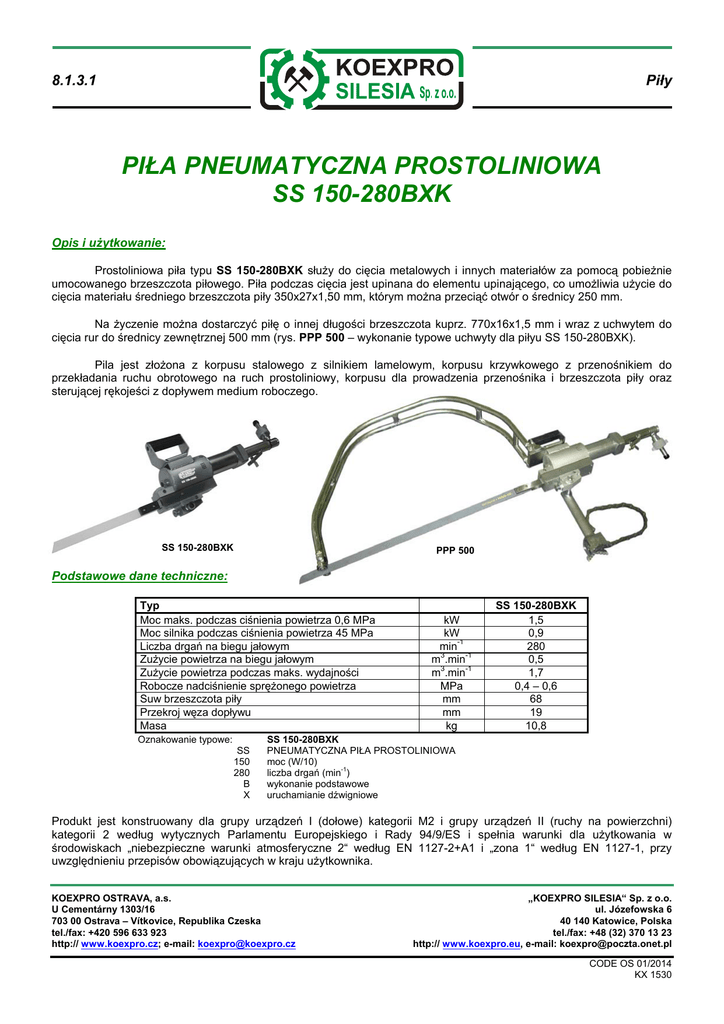 8.1.3.1 Piły PIŁA PNEUMATYCZNA PROSTOLINIOWA SS 150-280BXK Opis i użytkowanie: Prostoliniowa piła typu SS 150-280BXK służy do cięcia metalowych i innych materiałów za pomocą pobieżnie umocowanego brzeszczota piłowego. Piła podczas cięcia jest upinana do elementu upinającego, co umożliwia użycie do cięcia materiału średniego brzeszczota piły 350x27x1,50 mm, którym można przeciąć otwór o średnicy 250 mm. Na życzenie można dostarczyć piłę o innej długości brzeszczota kuprz. 770x16x1,5 mm i wraz z uchwytem do cięcia rur do średnicy zewnętrznej 500 mm (rys. PPP 500 – wykonanie typowe uchwyty dla piłyu SS 150-280BXK). Pila jest złożona z korpusu stalowego z silnikiem lamelowym, korpusu krzywkowego z przenośnikiem do przekładania ruchu obrotowego na ruch prostoliniowy, korpusu dla prowadzenia przenośnika i brzeszczota piły oraz sterującej rękojeści z dopływem medium roboczego. SS 150-280BXK PPP 500 Podstawowe dane techniczne: Typ Moc maks. podczas ciśnienia powietrza 0,6 MPa Moc silnika podczas ciśnienia powietrza 45 MPa Liczba drgań na biegu jałowym Zużycie powietrza na biegu jałowym Zużycie powietrza podczas maks. wydajności Robocze nadciśnienie sprężonego powietrza Suw brzeszczota piły Przekroj węza dopływu Masa Oznakowanie typowe: SS 150 280 B X kW kW min-1 m3.min-1 m3.min-1 MPa mm mm kg SS 150-280BXK 1,5 0,9 280 0,5 1,7 0,4 – 0,6 68 19 10,8 SS 150-280BXK PNEUMATYCZNA PIŁA PROSTOLINIOWA moc (W/10) -1 liczba drgań (min ) wykonanie podstawowe uruchamianie dźwigniowe Produkt jest konstruowany dla grupy urządzeń I (dołowe) kategorii M2 i grupy urządzeń II (ruchy na powierzchni) kategorii 2 według wytycznych Parlamentu Europejskiego i Rady 94/9/ES i spełnia warunki dla użytkowania w środowiskach „niebezpieczne warunki atmosferyczne 2“ według EN 1127-2+A1 i „zona 1“ według EN 1127-1, przy uwzględnieniu przepisów obowiązujących w kraju użytkownika. KOEXPRO OSTRAVA, a.s. U Cementárny 1303/16 703 00 Ostrava – Vítkovice, Republika Czeska tel./fax: +420 596 633 923 http:// www.koexpro.cz; e-mail: [email protected] „KOEXPRO SILESIA“ Sp. z o.o. ul. Józefowska 6 40 140 Katowice, Polska tel./fax: +48 (32) 370 13 23 http:// www.koexpro.eu, e-mail: [email protected] CODE OS 01/2014 KX 1530