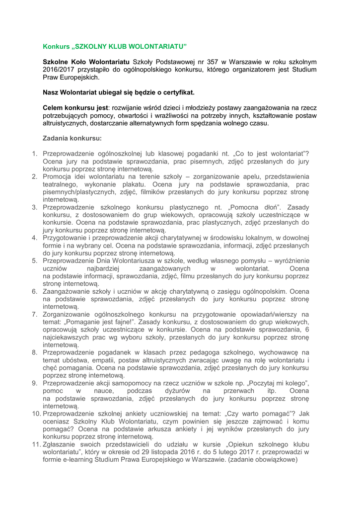 Konkurs „SZKOLNY KLUB WOLONTARIATU” Szkolne Koło Wolontariatu Szkoły Podstawowej nr 357 w Warszawie w roku szkolnym 2016/2017 przystąpiło do ogólnopolskiego konkursu, którego organizatorem jest Studium Praw Europejskich. Nasz Wolontariat ubiegał się będzie o certyfikat. Celem konkursu jest: rozwijanie wśród dzieci i młodzieży postawy zaangażowania na rzecz potrzebujących pomocy, otwartości i wrażliwości na potrzeby innych, kształtowanie postaw altruistycznych, dostarczanie alternatywnych form spędzania wolnego czasu. Zadania konkursu: 1. Przeprowadzenie ogólnoszkolnej lub klasowej pogadanki nt. „Co to jest wolontariat”? Ocena jury na podstawie sprawozdania, prac pisemnych, zdjęć przesłanych do jury konkursu poprzez stronę internetową. 2. Promocja idei wolontariatu na terenie szkoły – zorganizowanie apelu, przedstawienia teatralnego, wykonanie plakatu. Ocena jury na podstawie sprawozdania, prac pisemnych/plastycznych, zdjęć, filmików przesłanych do jury konkursu poprzez stronę internetową. 3. Przeprowadzenie szkolnego konkursu plastycznego nt. „Pomocna dłoń”. Zasady konkursu, z dostosowaniem do grup wiekowych, opracowują szkoły uczestniczące w konkursie. Ocena na podstawie sprawozdania, prac plastycznych, zdjęć przesłanych do jury konkursu poprzez stronę internetową. 4. Przygotowanie i przeprowadzenie akcji charytatywnej w środowisku lokalnym, w dowolnej formie i na wybrany cel. Ocena na podstawie sprawozdania, informacji, zdjęć przesłanych do jury konkursu poprzez stronę internetową. 5. Przeprowadzenie Dnia Wolontariusza w szkole, według własnego pomysłu – wyróżnienie uczniów najbardziej zaangażowanych w wolontariat. Ocena na podstawie informacji, sprawozdania, zdjęć, filmu przesłanych do jury konkursu poprzez stronę internetową. 6. Zaangażowanie szkoły i uczniów w akcję charytatywną o zasięgu ogólnopolskim. Ocena na podstawie sprawozdania, zdjęć przesłanych do jury konkursu poprzez stronę internetową. 7. Zorganizowanie ogólnoszkolnego konkursu na przygotowanie opowiadań/wierszy na temat: „Pomaganie jest fajne!”. Zasady konkursu, z dostosowaniem do grup wiekowych, opracowują szkoły uczestniczące w konkursie. Ocena na podstawie sprawozdania, 6 najciekawszych prac wg wyboru szkoły, przesłanych do jury konkursu poprzez stronę internetową. 8. Przeprowadzenie pogadanek w klasach przez pedagoga szkolnego, wychowawcę na temat ubóstwa, empatii, postaw altruistycznych zwracając uwagę na rolę wolontariatu i chęć pomagania. Ocena na podstawie sprawozdania, zdjęć przesłanych do jury konkursu poprzez stronę internetową. 9. Przeprowadzenie akcji samopomocy na rzecz uczniów w szkole np. „Poczytaj mi kolego”, pomoc w nauce, podczas dyżurów na przerwach itp. Ocena na podstawie sprawozdania, zdjęć przesłanych do jury konkursu poprzez stronę internetową. 10. Przeprowadzenie szkolnej ankiety uczniowskiej na temat: „Czy warto pomagać”? Jak oceniasz Szkolny Klub Wolontariatu, czym powinien się jeszcze zajmować i komu pomagać? Ocena na podstawie arkusza ankiety i jej wyników przesłanych do jury konkursu poprzez stronę internetową. 11. Zgłaszanie swoich przedstawicieli do udziału w kursie „Opiekun szkolnego klubu wolontariatu”, który w okresie od 29 listopada 2016 r. do 5 lutego 2017 r. przeprowadzi w formie e-learning Studium Prawa Europejskiego w Warszawie. (zadanie obowiązkowe) Bardzo serdecznie zachęcamy wszystkich ludzi dobrej woli, chętnych i otwartych do współpracy. Bądźcie z nami. Razem - damy radę i osiągniemy wspólny sukces Szczegóły znajdziecie: http://wolontariatwszkole.pl/?page_id=378 Opiekunowie SKW Aneta Kuch Anna Liszewska Monika Wilczyńska
