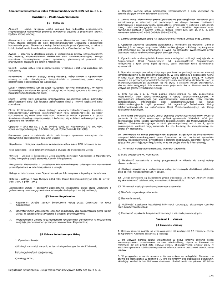 Regulamin Świadczenia Usług Telekomunikacyjnych GRS net sp. z o. o. 2. Operator oferuje usługi podmiotom zamierzającym z nich korzystać na terenie objętym swoim zakresem działania. Rozdział 1 – Postanowienia Ogólne §1 - Definicje Abonent – osoba fizyczna, osoba prawna lub jednostka organizacyjna nieposiadająca osobowości prawnej utworzona zgodnie z przepisami prawa, będąca stroną umowy; Abonament – stała opłata wnoszona przez Abonenta na rzecz Dostawcy z tytułu stałego dostępu do Sieci telekomunikacyjnej Operatora i możliwość korzystania przez Abonenta z usług świadczonych przez Operatora, a także z tytułu świadczenia innych usług przewidzianych w Cenniku lub w Ofercie. Awaria – przerwa w działaniu usługi, z wyłączeniem przerw spowodowanych siłą wyższą, nieprawidłowym działaniem sieci telekomunikacyjnej innego operatora niezarządzanej przez operatora, planowanymi pracami lub przyczynami leżącymi po stronie Abonenta; Cennik – wykaz usług wraz z zestawieniem wysokości opłat oraz zasadami ich naliczania; Konsument – Abonent będący osobą fizyczną, który zawarł z Operatorem umowę w celu niezwiązanym bezpośrednio z prowadzoną przez niego działalnością gospodarczą lub zawodową. Lokal – nieruchomość lub jej część (budynek lub lokal mieszkalny), w której Zamawiający zamierza korzystać z usługi lub w której zgodnie z Umową jest zlokalizowane Zakończenie Sieci; Łącze – część sieci operatora umożliwiająca świadczenie usługi pomiędzy zakończeniami sieci lub łącząca zakończenie sieci z innymi częściami sieci operatora; Okres Rozliczeniowy – okres jednego miesiąca kalendarzowego/ półrocza kalendarzowego/ roku dokonywane są rozliczenia należności Abonenta świadczonych usług, rozpoczynający i kończący się Operatora na fakturze VAT; kalendarzowego/ kwartału kalendarzowego, za który wobec Operatora z tytułu w dniach wskazanych przez Operator – GRS net sp. z o. o. 90-361 Łódź, ul. Piotrkowska 270 lok. 426, adres korespondencyjny: 93-590 Łódź, al. Politechniki 42 lok. GRS; Planowane prace – działania służb technicznych operatora niezbędne dla zapewnienia prawidłowego działania usługi; Regulamin – niniejszy regulamin świadczenia usług przez GRS net sp. z o. o.; 3. Zakres Usług oferowanych przez Operatora na poszczególnych obszarach jest zróżnicowany w zależności od posiadanych na danym terenie możliwości technicznych i organizacyjnych. Szczegółowe informacje w zakresie dostępnych Usług telekomunikacyjnych można uzyskać w siedzibie Operatora oraz nawiązując kontakt z Biurem Obsługi Klienta firmy GRS net sp. z o. o. pod numerem telefonu 42 6242 000 lub 502-433-175; 4. Zakres świadczonych usług na rzecz Abonenta określa umowa oraz Cennik; 5. Operator zapewnia bezpłatne połączenia z numerami alarmowymi. Dane o lokalizacji końcowego urządzenia telekomunikacyjnego, z którego wykonywane jest połączenie nie są gromadzone z uwagi na charakter świadczonych przez Operatora usług telekomunikacyjnych (usługa Voip). 6. Ograniczenia w dostępie lub korzystaniu z usług lub aplikacji znajdują się w Regulaminach Ofert Promocyjnych lub poszczególnych Regulaminach korzystania z tych usług bądź aplikacji, jeżeli Operator takie ograniczenia wprowadził. 7. Operator stosuje procedury dotyczące pomiaru i organizacji ruchu we własnej infrastrukturalnie Sieci telekomunikacyjnej. W celu pomiaru i organizacji ruchu w sieci Dział Techniczny firmy Dostawcy Usług zarządza Siecią, w którym prowadzi za pomocą odpowiednich narzędzi stały monitoring obciążenia sieci w charakterystycznych jej punktach lub na styku z sieciami innych Operatorów, aby zapobiec osiągnięciu lub przekroczeniu pojemności łącza. Monitorowanie nie wpływa na jakość świadczonej Usługi. 8. GRS net sp. z o. o. może podjąć środki mające na celu zapewnienie integralności sieci telekomunikacyjnej i usług telekomunikacyjnych, w szczególności polegających na: wyeliminowaniu komunikatu, który zagraża bezpieczeństwu integralności sieci telekomunikacyjnej lub usług telekomunikacyjnych bądź przerwać lub ograniczyć świadczenie Usług telekomunikacyjnych na zakończeniu Sieci Telekomunikacyjnej lub Usług Telekomunikacyjnych. 9. Minimalna oferowana jakość usługi głosowej odpowiada wskaźnikowi MOS na poziomie 3 dla 95% wzorcowych próbek głosowych. Wskaźnik MOS jest zdefiniowany przez Sektor Normalizacji Telekomunikacji ITU Międzynarodowego Związku Telekomunikacyjnego w skali pięciostopniowej od 1 do 5, gdzie poszczególne wartości mają znaczenie 1= zły, 2=słaby, 3= akceptowalny, 4= dobry, 5= doskonały. 10. Informacje na temat potencjalnych zagrożeń związanych ze świadczonymi usługami telekomunikacyjnymi przez Operatora, w tym na temat sposobów ochrony bezpieczeństwa, prywatności i danych osobowych, Operator zawarł w załączniku do niniejszego Regulaminu oraz na swojej stronie internetowej; 11. W ramach opłaty abonamentowej Operator zapewnia: Sieć operatora – sieć telekomunikacyjna służąca do świadczenia usług; Umowa – umowa o świadczenie usług zawarta pomiędzy Abonentem a Operatorem, której integralną część stanowią Cennik i Regulamin; Urządzenie Abonenckie – urządzenie telekomunikacyjne udostępniane Abonentowi przez Operatora w celu korzystania z usługi; Usługa – świadczona przez Operatora usługa lub związana z tą usługa dodatkowa; Ustawa – ustawa z dnia 16 lipca 2004 roku Prawo telekomunikacyjne (Dz. U. Nr 171 poz. 1800 z późn. Zm.) Zawieszenie Usługi – okresowe zaprzestanie świadczenia usług przez Operatora z jednoczesną rezerwacją zasobów sieciowych niezbędnych do jej realizacji; §2 Zakres Regulaminu a) Stały dostęp do sieci operatora; b) Możliwość korzystania z usług przypisanych w Ofercie do danej opłaty abonamentowej; c) Obsługę serwisową z wyłączeniem usług serwisowych d