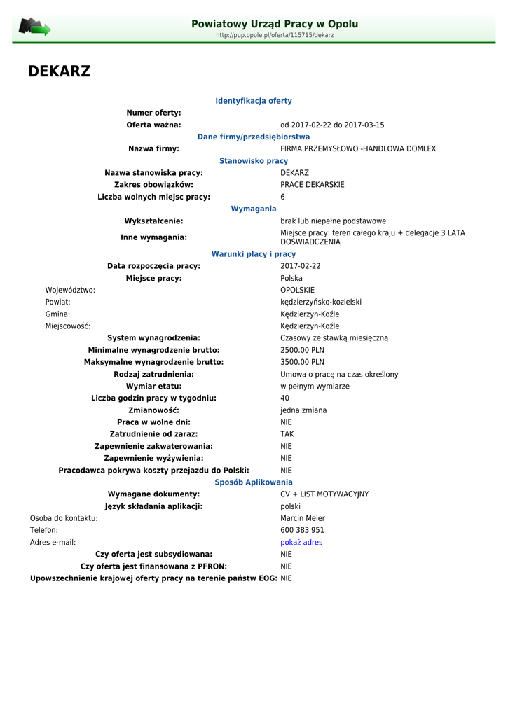 Powiatowy Urząd Pracy w Opolu http://pup.opole.pl/oferta/115715/dekarz DEKARZ Identyfikacja oferty Numer oferty: Oferta ważna: od 2017-02-22 do 2017-03-15 Dane firmy/przedsiębiorstwa Nazwa firmy: FIRMA PRZEMYSŁOWO -HANDLOWA DOMLEX Stanowisko pracy Nazwa stanowiska pracy: DEKARZ Zakres obowiązków: PRACE DEKARSKIE Liczba wolnych miejsc pracy: 6 Wymagania Wykształcenie: brak lub niepełne podstawowe Miejsce pracy: teren całego kraju + delegacje 3 LATA DOŚWIADCZENIA Inne wymagania: Warunki płacy i pracy Data rozpoczęcia pracy: 2017-02-22 Miejsce pracy: Polska Województwo: OPOLSKIE Powiat: kędzierzyńsko-kozielski Gmina: Kędzierzyn-Koźle Miejscowość: Kędzierzyn-Koźle System wynagrodzenia: Czasowy ze stawką miesięczną Minimalne wynagrodzenie brutto: 2500.00 PLN Maksymalne wynagrodzenie brutto: 3500.00 PLN Rodzaj zatrudnienia: Umowa o pracę na czas określony Wymiar etatu: w pełnym wymiarze Liczba godzin pracy w tygodniu: Zmianowość: 40 jedna zmiana Praca w wolne dni: NIE Zatrudnienie od zaraz: TAK Zapewnienie zakwaterowania: NIE Zapewnienie wyżywienia: NIE Pracodawca pokrywa koszty przejazdu do Polski: NIE Sposób Aplikowania Wymagane dokumenty: Język składania aplikacji: CV + LIST MOTYWACYJNY polski Osoba do kontaktu: Marcin Meier Telefon: 600 383 951 Adres e-mail: pokaż adres Czy oferta jest subsydiowana: NIE Czy oferta jest finansowana z PFRON: NIE Upowszechnienie krajowej oferty pracy na terenie państw EOG: NIE