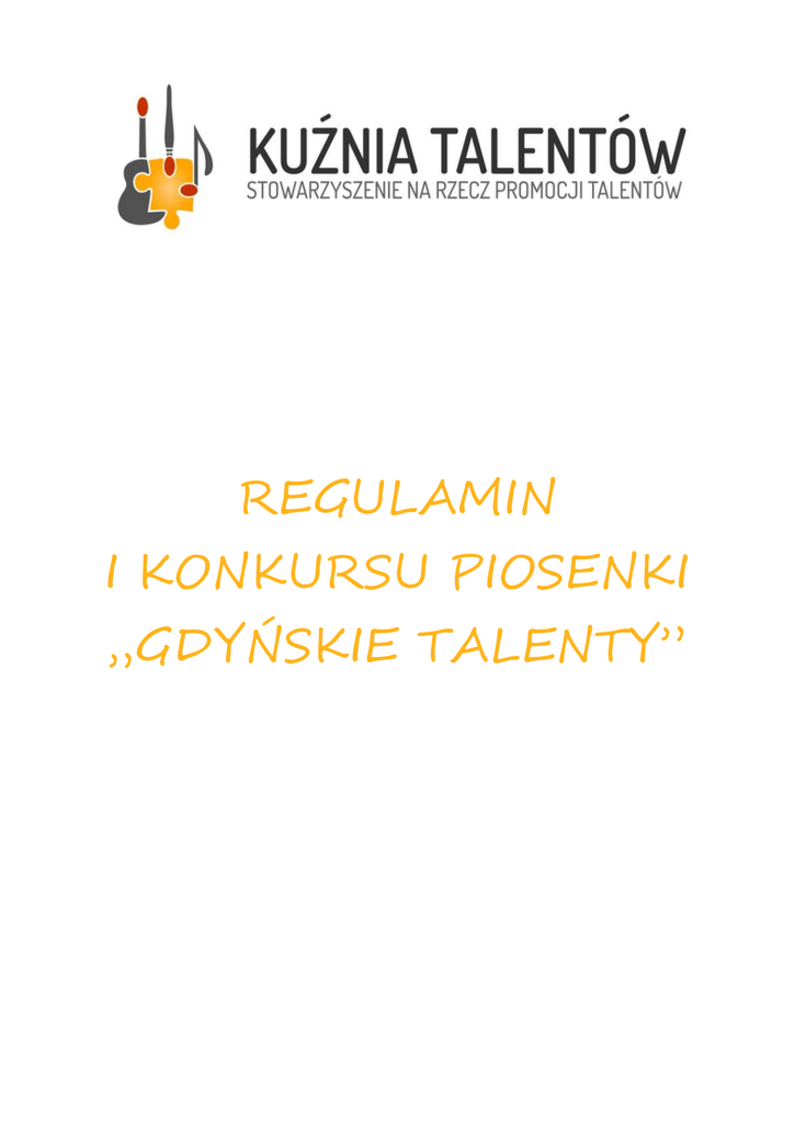 REGULAMIN I KONKURSU PIOSENKI „GDYŃSKIE TALENTY” §1 ORGANIZATOR 1. I Konkurs Piosenki „Gdyńskie Talenty” organizowany jest przez: Stowarzyszenie na rzecz promocji talentów „Kuźnia Talentów” 81-561 Gdynia, ul. Szyprów 24b NIP 5862295757, REGON 361058037 KRS 0000549088 e-mail: [email protected] 2. Współorganizatorem Konkursu jest: Szkoła Podstawowa nr 34 z Oddziałami Integracyjnymi w Gdyni im. Leonida Teligi ul. Cylkowskiego 5 81-465 Gdynia tel. (058) 622-14-34 fax. (058) 622-83-33 e-mail: [email protected] §2 CELE KONKURSU - stwarzanie warunków do rozwoju i czynnego uczestnictwa w kulturze, - popularyzacja polskiej piosenki dziecięcej oraz promowanie piosenki jako formy nauki, - doskonalenie umiejętności muzycznych i rozwijanie talentów estradowych, - wspieranie osób uzdolnionych wokalnie, - twórcza wymiana doświadczeń muzycznych wśród dzieci, - wyłonienie utalentowanych dzieci i młodzieży oraz zachęcenie ich do pracy twórczej w zakresie muzyki, - kształtowanie umiejętności współzawodnictwa. §3 UCZESTNICY KONKURSU 1. Uczestnikami Konkursu mogą być uczniowie szkół podstawowych lub wychowankowie placówek kulturalnych mieszczących się na terenie powiatu Gdynia. 2. Uczestnicy biorący udział w konkursie występują w następujących kategoriach: a) soliści i solistki – klasy I – III szkoły podstawowej b) soliści i solistki – klasy IV-VI szkoły podstawowej c) duety i zespoły wokalne – klasy I – III szkoły podstawowej d) duety i zespoły wokalne – klasy IV-VI szkoły podstawowej 3. W czasie Konkursu każdemu niepełnoletniemu uczestnikowi musi towarzyszyć opiekun (rodzic lub upoważniona przez niego osoba). §4 WARUNKI UCZESTNICTWA, ZASADY KONKURSU 1. Warunkiem uczestnictwa w Konkursie jest wypełnienie karty zgłoszenia (dostępnej na stronie internetowej www.kuzniatalentow.edu.pl w zakładce: Realizowane Projekty/Konkurs piosenki „Gdyńskie Talenty”) oraz wysłanie jej na adres [email protected] w nieprzekraczalnym terminie do dnia 5 maja 2016r.. (czwartek) włącznie. 2. Karta zgłoszenia musi zostać podpisana przez rodzica lub opiekuna prawnego Dostarczenie formularza zgłoszeniowego jest równoznaczne z akceptacją warunków przedmiotowego regulaminu oraz wyrażeniem zgody na przetwarzanie danych osobowych zgodnie z ustawą o ochronie danych osobowych z dn. 29.08.1997 r. (Dz. U. Nr 133, poz. 883). 3. Prezentacja uczestników zakwalifikowanych do udziału w Konkursie na podstawie złożonych formularzy zgłoszeniowych odbędzie się w dniu 12 maja 2016 r. (czwartek) w Szkole Podstawowej nr 34 z Oddziałami Integracyjnymi im. Leonida Teligi na ul. Cylkowskiego 5 w Gdyni. 4. Porządek występów w danej kategorii odbywać się będzie wg kolejności zgłoszeń. 5. Lista uczestników oraz szczegółowe informacje dotyczące przesłuchań dostępne będą na stronie internetowej www.kuzniatalentow.edu.pl w zakładce: Realizowane Projekty/Konkurs piosenki „Gdyńskie Talenty”. 6. Uczestnicy wszystkich kategorii prezentują jeden utwór muzyczny (przy czym prezentacja nie powinna być dłuższa niż 5 minut). 7. Piosenki mogą zostać wykonane zarówno przy akompaniamencie pianina/gitary, jak również z podkładem muzycznym (prosimy uprzednio zaznaczyć odpowiedni nośnik w karcie zgłoszenia). Obowiązkiem uczestnika Festiwalu jest dołączenie podkładów muzycznych (półplaybacków) w formacie mp3 WRAZ Z KARTĄ ZGŁOSZENIA bądź dostarczenie płyty CD z podkładem muzycznym do organizatora w dniu eliminacji. Organizator nie odpowiada za jakość dostarczonego podkładu muzycznego. 8. Z danej szkoły/placówki można zgłosić udział tylko dwóch solistów/solistek i jednego zespołu/duetu w danej kategorii wiekowej. 9. W kategorii zespoły wokalne i duety liczba wokalistów powinna mieścić się między dwiema, a czterema osobami. 10. W każdej kategorii wybór repertuaru powinien być dostosowany do wieku uczestnika. 11. Zmiana repertuaru po oddaniu karty będzie możliwa wyłącznie za zgodą organizatora. 12. Każdy uczestnik/zespół może złożyć darowiznę na rzecz festiwalu (tzw. Akredytacja festiwalowa), która wynosi: - 10 zł – soliści - 20 zł - duety, zespoły (dotyczy całego zespołu) Należy ją wpłacać na konto nie później niż do 5 maja 2016r.. (czwartek): STOWARZYSZENIE NA RZECZ PROMOCJI TALENTÓW „Kuźnia Talentów”, nr konta: mBank 89 1140 2004 0000 3802 7560 4081 z dopiskiem: darowizna na rzecz konkursu Wszystkie wpłaty wykorzystane zostaną na organizację Konkursu. §5 OCENA PREZENTACJI WOKALNYCH, NAGRODY 1. Jury zostanie powołane przez organizatora oraz współorganizatora konkursu. 2. Jury będzie oceniać prezentacje uczestników wg następujących kryteriów: - dykcja i poprawność językowa, - emisja głosu, - intonacja, czystość dźwięku, - dobór repertuaru do wieku uczestnika, - ogólny wyraz artystyczny. 3. Instruktorzy i opiekunowie uczestników Konkursu mogą uzyskać od jury uzasadnienie werdyktu ogólnego oraz ocen poszczególnych wykonawców. 4. Organizator przewiduje dyplomy dla wszystkich uczestników. 5. Laureaci Konkursu otrzymają nagrody rzeczowe. §6 INFORMACJE POZOSTAŁE 1. Uczestnicy Konkursu pokrywają koszty ewentualnego przejazdu oraz wyżywienia. 2. Werdykt Jury jest niepodważalny. 3. Wszelkie przesłuchania mogą być rejestrowane, transmitowane, nagrywane za zgodą Organizatora Konkursu, bez jakiejkolwiek odpłatności dla uczestników tego wydarzenia. 4. Organizator zapewnia: pianino cyfrowe, sprzęt nagłaśniający, mikrofony, możliwość odtworzenia płyt CD, oświetlenie. 5. Organizator zastrzega sobie prawo do zmiany przedmiotowego Regulaminu. Wszelkie zmiany oraz informacje dot. Konkursu publikowane będą na stronie internetowej Organizatora, tj. www.kuzniatalentow.edu.pl 6. Kwestie sporne, nieobjęte regulaminem lub wymagające dodatkowych interpretacji rozstrzyga Organizator.