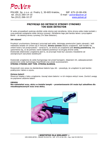 POLVER Sp. z o.o. ul. Fredry 2, 30-605 Kraków, NIP 675-10-08-436 tel. (012) 260-14-10 E-mail - [email protected] fax.(012) 266-10 27 www.polver.pl PRZYRZĄD DO DETEKCJI STRONY CYNOWEJ TIN SIDE DETECTOR W wielu przypadkach podczas obróbki szkła istotne jest określenie, która strona szkła miała kontakt z cyną podczas wytapiania szkła (strona cynowa). Określenie tego jest bardzo łatwe z przyrządem Bohle – do detekcji strony cynowej (Tin Side Detector). Jak używać Przyłożyć uruchomiony (świecący) przyrząd pod szkło, dotykając powierzchni (patrz obrazek). Jeśli niebieskie światło UV zmieni się w mleczne, strona cynowa dotyka urządzenia. Jeśli światło nie zmieni koloru lub przejrzystości - oznacza to, że strona od urządzenia jest stroną powietrzną. Dla upewnienia się, co do pomiaru warto badanie powtórzyć na drugiej stronie szkła. Doskonała właściwości urządzenia jest to, że przyrząd może być używany niezależnie od zewnętrznych warunków świetlnych! Doskonałe urządzenie do szkła fusingowego lub przed fusingiem, klejeniem UV, zabezpieczaniem powierzchni szkła technologią ClearShield oraz przed żywicowaniem. STRONA CYNOWA JEST TZW. STRONĄ SŁABSZĄ Poręczność oraz praca na standardowe baterie typu AA – powoduje, że urządzeni to jest bardzo praktyczne i łatwe w użyciu. Zmiana baterii Otworzyć klapkę z boku urządzenia. Usunąć stare baterie i w ich miejsce włożyć nowe. Zwrócić uwagę na poprawne ułożenie baterii UWAGA Nie naświetlać oczu, skóry w świetle lampki – promieniowanie UV może być szkodliwe dla niezabezpieczonych oczu oraz skóry. ::WSZYSTKO DLA SZKLARZY :: KRS 0000148782 ; REGON 351222734 ; NIP 675-10-08-436 ; Kap. Zakł 50 000 PLN