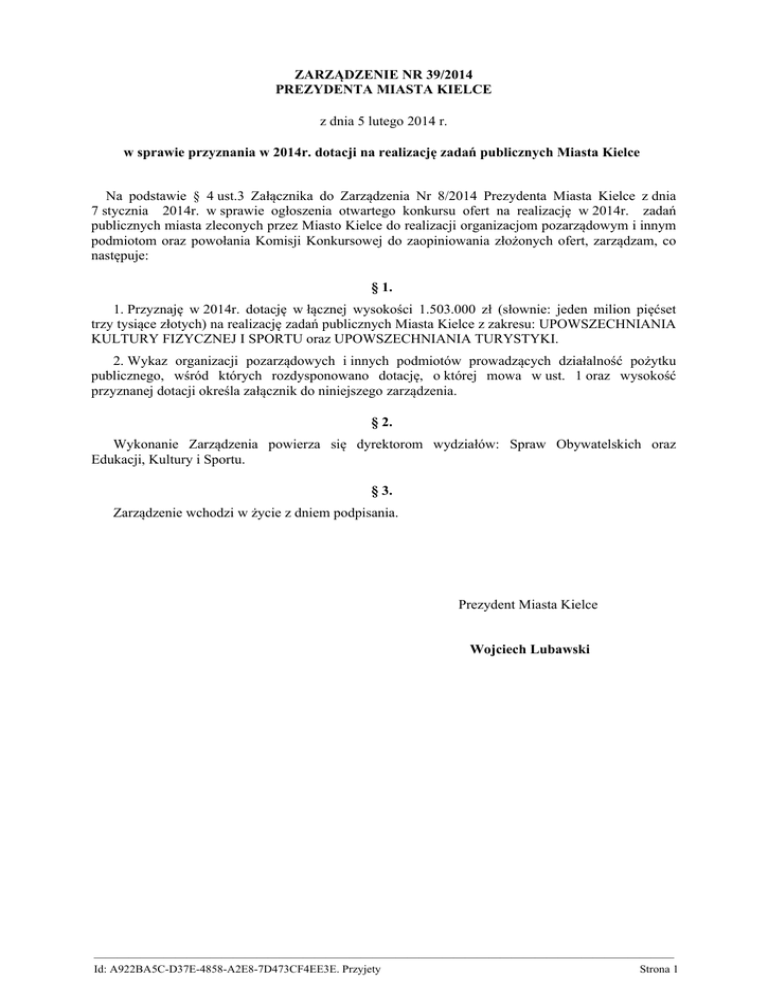 ZARZĄDZENIE NR 39/2014 PREZYDENTA MIASTA KIELCE z dnia 5 lutego 2014 r. w sprawie przyznania w 2014r. dotacji na realizację zadań publicznych Miasta Kielce Na podstawie § 4 ust.3 Załącznika do Zarządzenia Nr 8/2014 Prezydenta Miasta Kielce z dnia 7 stycznia 2014r. w sprawie ogłoszenia otwartego konkursu ofert na realizację w 2014r. zadań publicznych miasta zleconych przez Miasto Kielce do realizacji organizacjom pozarządowym i innym podmiotom oraz powołania Komisji Konkursowej do zaopiniowania złożonych ofert, zarządzam, co następuje: § 1. 1. Przyznaję w 2014r. dotację w łącznej wysokości 1.503.000 zł (słownie: jeden milion pięćset trzy tysiące złotych) na realizację zadań publicznych Miasta Kielce z zakresu: UPOWSZECHNIANIA KULTURY FIZYCZNEJ I SPORTU oraz UPOWSZECHNIANIA TURYSTYKI. 2. Wykaz organizacji pozarządowych i innych podmiotów prowadzących działalność pożytku publicznego, wśród których rozdysponowano dotację, o której mowa w ust. 1 oraz wysokość przyznanej dotacji określa załącznik do niniejszego zarządzenia. § 2. Wykonanie Zarządzenia powierza się dyrektorom wydziałów: Spraw Obywatelskich oraz Edukacji, Kultury i Sportu. § 3. Zarządzenie wchodzi w życie z dniem podpisania. Prezydent Miasta Kielce Wojciech Lubawski —————————————————————————————————————————————————— Id: A922BA5C-D37E-4858-A2E8-7D473CF4EE3E. Przyjety Strona 1 Załącznik do Zarządzenia Nr 39/2014 Prezydenta Miasta Kielce z dnia 5 lutego 2014 r. 1. UPOWSZECHNIANIE KULTURY FIZYCZNEJ I SPORTU: Dział 926 Rozdział 92605 1) Zadania zlecone do realizacji w formie powierzenia: Lp 1 Nr oferty 1/I/14 Nazwa oferenta Kielecki Klub Piłkarski Korona Kwota przyznana na realizację zadania (w zł) Nazwa zadania Szkolenie sportowe dla dzieci i młodzieży zrzeszonej w sekcji sportowej Kieleckiej Szkoły Piłki Nożnej „Korona” Ogółem 300.000 300.000 2) Zadania zlecone do realizacji w formie wspierania: Lp Nr oferty Nazwa oferenta Nazwa zadania Kwota przyznana na realizację zadania (w zł) 1 8/I/14 Towarzystwo Sportowe „PIRAMIDA” Szkolenie sportowe, w ramach współzawodnictwa sportowego młodzieży uzdolnionej, organizowanego przez: - Polskie Związki Sportowe, - Polską Federację Sportu Młodzieżowego, Szkolenie obejmuje: - wynajem specjalistycznych obiektów sportowych do prowadzenia zajęć treningowych i rozgrywania zawodów sportowych, - udział w zawodach /w tym organizacja zawodów/ organizowanych przez poszczególne Związki Sportowe, - udział w obozach sportowo – szkoleniowych i turniejach kontrolnych / miejskich, wojewódzkich, ogólnopolskich i międzynarodowych/, - zakup niezbędnego sprzętu sportowego i odzieży sportowej do prowadzenia szkolenia w następujących sportach : AKROBATYKA SPORTOWA 37.000 2 36/I/14 Kielecki Klub Bokserski „RUSHH” Szkolenie sportowe, w ramach współzawodnictwa sportowego młodzieży uzdolnionej, organizowanego przez: - Polskie Związki Sportowe, - Polską Federację Sportu Młodzieżowego, Szkolenie obejmuje: - wynajem specjalistycznych obiektów sportowych do prowadzenia zajęć treningowych i rozgrywania zawodów sportowych, - udział w zawodach /w tym organizacja zawodów/ organizowanych przez poszczególne Związki Sportowe, - udział w obozach sportowo – szkoleniowych i turniejach kontrolnych / miejskich, wojewódzkich, ogólnopolskich i międzynarodowych/, - zakup niezbędnego sprzętu sportowego i odzieży sportowej do prowadzenia szkolenia w następujących sportach : BOKS 28.000 3 9/I/14 Uczniowski Ludowy klub Sportowy „GULIWER” Szkolenie sportowe, w ramach współzawodnictwa sportowego młodzieży uzdolnionej, organizowanego przez: - Polskie Związki Sportowe, - Polską Federację Sportu Młodzieżowego, Szkolenie obejmuje: - wynajem specjalistycznych obiektów sportowych do prowadzenia zajęć 10.000 —————————————————————————————————————————————————— Id: A922BA5C-D37E-4858-A2E8-7D473CF4EE3E. Przyjety Strona 1 treningowych i rozgrywania zawodów sportowych, - udział w zawodach /w tym organizacja zawodów/ organizowanych przez poszczególne Związki Sportowe, - udział w obozach sportowo – szkoleniowych i turniejach kontrolnych / miejskich, wojewódzkich, ogólnopolskich i międzynarodowych/, - zakup niezbędnego sprzętu sportowego i odzieży sportowej do prowadzenia szkolenia w następujących sportach : ZAPASY 4 2/I/14 Uczniowski Międzyszkolny klub Sportowy „ŻAK” Szkolenie sportowe, w ramach współzawodnictwa sportowego młodzieży uzdolnionej, organizowanego przez: - Polskie Związki Sportowe, - Polską Federację Sportu Młodzieżowego, Szkolenie obejmuje: - wynajem specjalistycznych obiektów sportowych do prowadzenia zajęć treningowych i rozgrywania zawodów sportowych, - udział w zawodach /w tym organizacja zawodów/ organizowanych przez poszczególne Związki Sportowe, - udział w obozach sportowo – szkoleniowych i turniejach kontrolnych / miejskich, wojewódzkich, ogólnopolskich i międzynarodowych/, - zakup niezbędnego sprzętu sportowego i odzieży sportowej do prowadzenia szkolenia w następujących sportach : JUDO 10.000 5 52/I/14 Kielecki Klub Karate KYOKUSHIN w Kielcach Szkolenie sportowe, w ramach współzawodnictwa sportowego młodzieży uzdolnionej, organizowanego przez: - Polskie Związki Sportowe, - Polską Federację Sportu Młodzieżowego, Szkolenie obejmuje: - wynajem specjalistycznych obiektów sportowych do prowadzenia zajęć treningowych i rozgrywania zawodów sportowych, - udział w zawodach /w tym organizacja zawodów/ organizowanych przez poszczególne Związki Sportowe, - udział w obozach sportowo – szkoleniowych i turniejach kontrolnych / miejskich, wojewódzkich, ogólnopolskich i międzynarodowych/, - zakup niezbędnego sprzętu sportowego i od