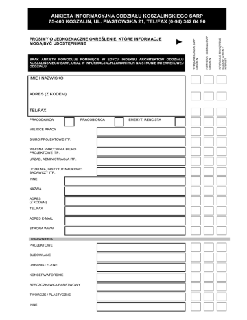 BRAK ANKIETY POWODUJE POMINIĘCIE W EDYCJI INDEKSU ARCHITEKTÓW ODDZIAŁU KOSZALIŃSKIEGO SARP, ORAZ W INFORMACJACH ZAWARTYCH NA STRONIE INTERNETOWEJ ODDZIAŁU IMIĘ I NAZWISKO ADRES (Z KODEM) TEL/FAX PRACODAWCA PRACOBIORCA MIEJSCE PRACY BIURO PROJEKTOWE ITP. WŁASNA PRACOWNIA BIURO PROJEKTOWE ITP. URZĄD, ADMINISTRACJA ITP. UCZELNIA, INSTYTUT NAUKOWO BADAWCZY ITP. INNE NAZWA ADRES (Z KODEM) TEL/FAX ADRES E-MAIL STRONA WWW UPRAWNIENIA PROJEKTOWE BUDOWLANE URBANISTYCZNE KONSERWATORSKIE RZECZOZNAWCA PAŃSTWOWY TWÓRCZE / PLASTYCZNE INNE EMERYT, RENCISTA INFORMACJE ZEWNĘTRZNE (OGÓLNY UŻYTEK) + INTERNET ► PARTNERZY ODDZIAŁU SARP KOSZALIN PROSIMY O JEDNOZNACZNE OKREŚLENIE, KTÓRE INFORMACJE MOGĄ BYĆ UDOSTĘPNIANE WYŁĄCZNIE ODDZIAŁ SARP KOSZALIN ANKIETA INFORMACYJNA ODDZIAŁU KOSZALIŃSKIEGO SARP 75-400 KOSZALIN, UL. PIASTOWSKA 21, TEL/FAX (0-94) 342 64 90 OBSZAR SZCZEGÓLNEGO ZAINTERESOWANIA W ZAKRESIE PROJEKTOWANIA ARCHITEKTURA MIESZKANIOWA JEDNORODZINNA ARCHITEKTURA MIESZKANIOWA WIELORODZINNA ARCHITEKTURA UŻYTECZNOŚCI PUBLICZNEJ ARCHITEKTURA PRZEMYSŁOWA ARCHITEKTURA SAKRALNA KONSERWACJA ZABYTKÓW ARCHITEKTURA WNĘTRZ ARCHITEKTURA KRAJOBRAZU PLANOWANIE PRZESTRZENNA I URBANISTYKA INNE CZY POSIADA PAN/PANI MATERIAŁY DO PUBLIKACJI LUB WYSTAW ILUSTRUJĄCE DZIAŁALNOŚĆ PROJEKTOWĄ CZY CHCIAŁBY PAN/PANI EKSPONOWAĆ JE W PRZYSZŁOŚCI CZY ZAMIERZA PAN/PANI UCZESTNICZYĆ W KONKURSACH CZY CHCIAŁBY PAN/PANI OTRZYMYWAĆ ZAPROSZENIA DO UCZESTNICTWA W: SEMINARIACH PROBLEMOWYCH SEMINARIACH TECHNICZNYCH I INFORMACYJNO PROMOCYJNYCH WYSTAWACH I IMPREZACH KULTURALNYCH PRZYNALEŻNOŚĆ DO INNYCH STOWARZYSZEŃ I ZWIĄZKÓW TWÓRCZYCH ZNAJOMOŚĆ JĘZYKÓW OBCYCH ODZNAKI I WYRÓŻNIENIA SARP ADRES DO KORESPONDENCJI (WRAZ Z KODEM) Wyrażam zgodę na przetwarzanie moich danych osobowych dla celów statutowych SARP w zakresach określonych powyżej. DATA PODPIS ANKIETA NINIEJSZA SŁUŻY DO AKTUALIZACJI DANYCH O CZŁONKACH KOSZALIŃSKIEGO ODDZIAŁU SARP. JEŻELI PAŃSTWA DANE ULEGNĄ ZMIANIE PROSIMY O PONOWNE WYPEŁNIENIE ANKIETY W POZYCJACH, KTÓRYCH TE ZMIANY DOTYCZĄ. DANE Z ANKIETY STANOWĄ PODSTAWĘ DO OPRACOWANIA STRONY WWW ODDZIAŁU KOSZALIŃSKIEGO ORAZ INDEKSU ARCHITEKTÓW ODDZIAŁU KOSZALIŃSKIEGO SARP.
