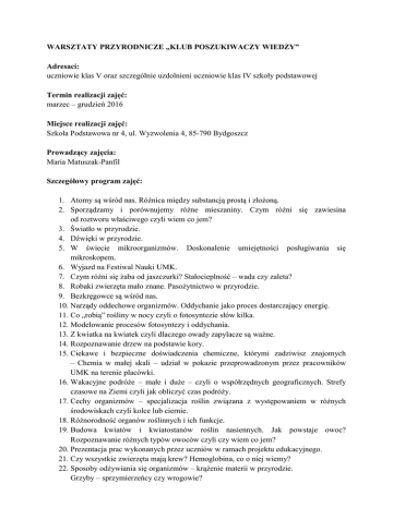 WARSZTATY PRZYRODNICZE „KLUB POSZUKIWACZY WIEDZY” Adresaci: uczniowie klas V oraz szczególnie uzdolnieni uczniowie klas IV szkoły podstawowej Termin realizacji zajęć: marzec – grudzień 2016 Miejsce realizacji zajęć: Szkoła Podstawowa nr 4, ul. Wyzwolenia 4, 85-790 Bydgoszcz Prowadzący zajęcia: Maria Matuszak-Panfil Szczegółowy program zajęć: 1. Atomy są wśród nas. Różnica między substancją prostą i złożoną. 2. Sporządzamy i porównujemy różne mieszaniny. Czym różni się zawiesina od roztworu właściwego czyli wiem co jem? 3. Światło w przyrodzie. 4. Dźwięki w przyrodzie. 5. W świecie mikroorganizmów. Doskonalenie umiejętności posługiwania się mikroskopem. 6. Wyjazd na Festiwal Nauki UMK. 7. Czym różni się żaba od jaszczurki? Stałocieplność – wada czy zaleta? 8. Robaki zwierzęta mało znane. Pasożytnictwo w przyrodzie. 9. Bezkręgowce są wśród nas. 10. Narządy oddechowe organizmów. Oddychanie jako proces dostarczający energię. 11. Co „robią” rośliny w nocy czyli o fotosyntezie słów kilka. 12. Modelowanie procesów fotosyntezy i oddychania. 13. Z kwiatka na kwiatek czyli dlaczego owady zapylacze są ważne. 14. Rozpoznawanie drzew na podstawie kory. 15. Ciekawe i bezpieczne doświadczenia chemiczne, którymi zadziwisz znajomych – Chemia w małej skali – udział w pokazie przeprowadzonym przez pracowników UMK na terenie placówki. 16. Wakacyjne podróże – małe i duże – czyli o współrzędnych geograficznych. Strefy czasowe na Ziemi czyli jak obliczyć czas podróży. 17. Cechy organizmów – specjalizacja roślin związana z występowaniem w różnych środowiskach czyli kolce lub ciernie. 18. Różnorodność organów roślinnych i ich funkcje. 19. Budowa kwiatów i kwiatostanów roślin nasiennych. Jak powstaje owoc? Rozpoznawanie różnych typów owoców czyli czy wiem co jem? 20. Prezentacja prac wykonanych przez uczniów w ramach projektu edukacyjnego. 21. Czy wszystkie zwierzęta mają krew? Hemoglobina, co o niej wiemy? 22. Sposoby odżywiania się organizmów – krążenie materii w przyrodzie. Grzyby – sprzymierzeńcy czy wrogowie? 23. Z chemią za pan brat – czyli wykonujemy doświadczenia chemiczne. Zjawisko dyfuzji i osmozy. 24. Poważny temat czyli wpływ temperatury na przebieg procesów chemicznych. Analiza wykresów i tabel. 25. Badanie czystości wody. Obserwacje mikroskopowe organizmów wodnych. 26. Z mikroskopem za pan brat czyli dokumentacja obserwacji tkanek zwierzęcych. 27. Mikrokosmos czyli co? 28. W mikroświecie komórek roślinnych i zwierzęcych czyli o organellach komórkowych prawie wszystko. 29. Fascynujący świat ryb. Świat zaklęty w skamieniałościach. 30. Od płetwy do kończyny czyli specjalizacja narządów. 31. Ewolucja wybranych układów u kręgowców. Modelowanie wybranego układu. Zasady rekrutacji: W przypadku większej ilości chętnych niż miejsc, przeprowadzony zostanie test wiedzy i sprawdzian umiejętności (obsługa mikroskopu, termometru itp.).