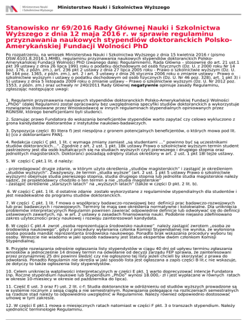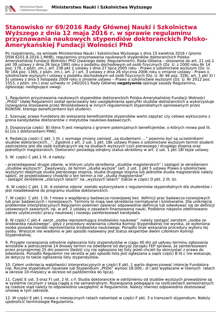 Stanowisko nr 69/2016 Rady Głównej Nauki i Szkolnictwa