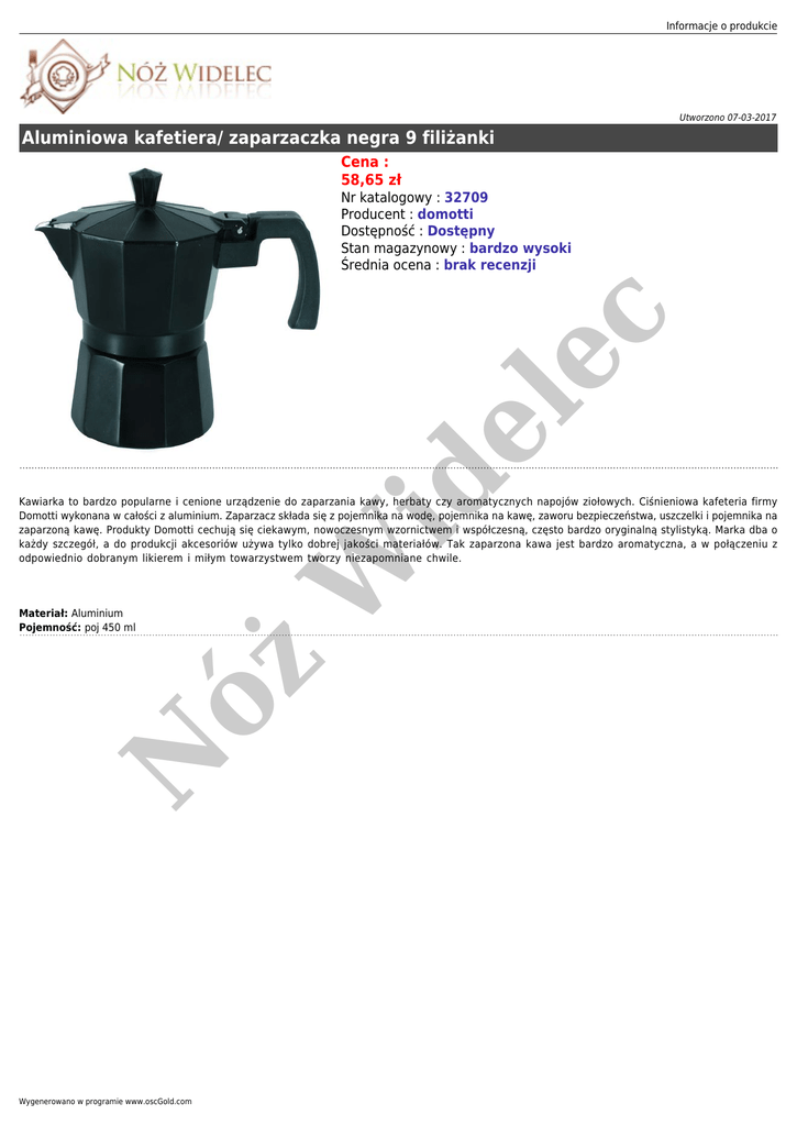 Informacje o produkcie Utworzono 07-03-2017 Aluminiowa kafetiera/ zaparzaczka negra 9 filiżanki Cena : 58,65 zł id e le c Nr katalogowy : 32709 Producent : domotti Dostępność : Dostępny Stan magazynowy : bardzo wysoki Średnia ocena : brak recenzji N óż Materiał: Aluminium Pojemność: poj 450 ml W Kawiarka to bardzo popularne i cenione urządzenie do zaparzania kawy, herbaty czy aromatycznych napojów ziołowych. Ciśnieniowa kafeteria firmy Domotti wykonana w całości z aluminium. Zaparzacz składa się z pojemnika na wodę, pojemnika na kawę, zaworu bezpieczeństwa, uszczelki i pojemnika na zaparzoną kawę. Produkty Domotti cechują się ciekawym, nowoczesnym wzornictwem i współczesną, często bardzo oryginalną stylistyką. Marka dba o każdy szczegół, a do produkcji akcesoriów używa tylko dobrej jakości materiałów. Tak zaparzona kawa jest bardzo aromatyczna, a w połączeniu z odpowiednio dobranym likierem i miłym towarzystwem tworzy niezapomniane chwile. Wygenerowano w programie www.oscGold.com
