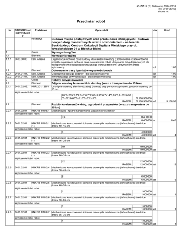 ZUZIA12 (C) Datacomp 1994-2016 (lic. 3F6F9EFE) strona nr: 1 Przedmiar robót <-NR-> <-KOD-> Nr 1 1.1 1.1.1 1.2 1.2.1 1.2.2 2 2.1 2.1.1 STWiOR/Kod indywidualn y D-00.00.00 D-01.01.01. D-01.01.01. D-01.02.02. <-PODST-> <-OPIS-> <-JEDN-> Podstawa Opis robót Jm Kosztorys Budowa miejsc postojowych oraz przebudowa istniejących i budowa nowych dróg manewrowych wraz z odwodnieniem - na terenie Beskidzkiego Centrum Onkologii Szpitala Miejskiego przy ul. Wyspiańskiego 21 w Bielsku-Białej Grupa Element kalk. własna Wymagania ogólne Wymagania ogólne Element kalk. własna kalk. własna Grupa Element KNR 201/126/1 Odtworzenie trasy i punktów wysokościowych Organizacja ruchu na czas budowy dla całości inwestycji (Opracowanie i zatwierdzenie projektu organizacji ruchu na czas prowadzenia robót; utrzymanie dróg dojazdowych dla transportu technologicznego) wraz z jego wprowadzeniem i utrzymaniem przez wykonawcę <-ILOSC-> Ilość kpl 1,00 kpl kpl 1,00 1,00 5 188,980000 5 188,980000 m2 5 188,98 Geodezyjna obsługa budowy - dla całości inwestycji Inwentaryzacja powykonawcza - dla całości inwestycji Roboty przygotowawcze Zdjęcie warstwy humusu i/lub darniny (wraz z transportem do 15 km) Usunięcie warstwy ziemi urodzajnej (humus) przy pomocy spycharek, grubość warstwy do 15 cm Wyliczenie ilości robót: 70*5+205*5,7*2,3+1*6,7*2,65+3,95*6,7+14*3,95*5,7+53*5+90 *5+37*5+60*5+110*5+6*2+5*6 RAZEM: 2.2 2.2.1 2.2.2 2.2.3 2.2.4 2.2.5 2.2.6 2.2.7 2.2.8 Element Rozbiórka elementów dróg, ogrodzeń i przepustów (wraz z transportem do 15 km) D-01.02.01 KNKRB 1/105/1 Mechaniczne i ręczne karczowanie zagajników i krzaków Wyliczenie ilości robót: 0,4 0,400000 RAZEM: 0,400000 ha D-01.02.01 KNKRB 1/102/1 Mechaniczne karczowanie i ścinanie drzew piła mechaniczna (łańcuchowa) średnice (1) drzew 10 -15 cm Wyliczenie ilości robót: 4 4,000000 RAZEM: 4,000000 szt D-01.02.01 KNKRB 1/102/2 Mechaniczne karczowanie i ścinanie drzew piła mechaniczna (łańcuchowa) średnice (1) drzew 16 -25 cm Wyliczenie ilości robót: 19 19,000000 RAZEM: 19,000000 szt D-01.02.01 KNKRB 1/102/3 Mechaniczne karczowanie i ścinanie drzew piła mechaniczna (łańcuchowa) średnice (1) drzew 26 -35 cm Wyliczenie ilości robót: 12 12,000000 RAZEM: 12,000000 szt D-01.02.01 KNKRB 1/102/4 Mechaniczne karczowanie i ścinanie drzew piła mechaniczna (łańcuchowa) średnice drzew 36 -45 cm Wyliczenie ilości robót: 6 6,000000 RAZEM: 6,000000 szt D-01.02.01 KNKRB 1/102/5 Mechaniczne karczowanie i ścinanie drzew piła mechaniczna (łańcuchowa) średnice drzew 46 -55 cm Wyliczenie ilości robót: 1 1,000000 RAZEM: 1,000000 szt D-01.02.01 KNKRB 1/102/6 Mechaniczne karczowanie i ścinanie drzew piła mechaniczna (łańcuchowa) średnice drzew 56 -65 cm Wyliczenie ilości robót: 1 1,000000 RAZEM: 1,000000 szt D-01.02.01 KNKRB 1/102/7 Mechaniczne karczowanie i ścinanie drzew piła mechaniczna (łańcuchowa) średnice drzew 66 -75 cm Wyliczenie ilości robót: 1 1,000000 RAZEM: 1,000000 szt 0,40 4 19 12 6 1 1 1 ZUZIA12 (C) Datacomp 1994-2016 (lic. 3F6F9EFE) strona nr: 2 <-NR-> <-KOD-> Nr 2.2.9 2.2.10 2.2.11 2.2.12 2.2.13 2.2.14 2.2.15 2.2.16 2.2.17 2.2.18 2.2.19 2.2.20 2.2.21 2.2.22 <-PODST-> <-OPIS-> STWiOR/Kod Podstawa Opis robót indywidualn y D-01.02.01 KNKRB 1/102/7 Mechaniczne karczowanie i ścinanie drzew piła mechaniczna (łańcuchowa) średnice drzew 76 -85 cm Wyliczenie ilości robót: 1 1,000000 RAZEM: 1,000000 D-01.02.04. KNR 231/813/4 Rozebranie krawężników wraz z ławą, betonowych 20x30 cm na podsypce cementowo-piaskowej Wyliczenie ilości robót: 53+20+65+50+230+30+40+35+110+80+45+110+60+5+7 940,000000 RAZEM: 940,000000 D-01.02.04. KNR 231/814/2 Rozebranie obrzeży trawnikowych, obrzeża 8x30˙cm na podsypce piaskowej Wyliczenie ilości robót: 24+24 48,000000 RAZEM: 48,000000 D-01.02.04. KNR 231/811/4 Rozebranie nawierzchni z płyt drogowych - trylinki, grubość płyt 15 cm Wyliczenie ilości robót: 106*5+17*16+15*6+30*5+60*5+50*5 1 592,000000 RAZEM: 1 592,000000 D-01.02.04. KNR 231/811/4 Rozebranie nawierzchni z płyt drogowych betonowych, grubość płyt 15 cm Wyliczenie ilości robót: 58,4*4,5+65*3+45*4,5+22*19+85+55+70 1 288,300000 RAZEM: 1 288,300000 D-01.02.04. KNR 231/815/6 Rozebranie nawierzchni z kostki brukowej betonowej gr. 8 cm na podsypce cementowo-piaskowej Wyliczenie ilości robót: 2,8*17+24*2 95,600000 RAZEM: 95,600000 D-01.02.04. KNR 231/815/6 Rozebranie nawierzchni z płyt chodnikowych 50x50x7 cm na podsypce cementowo-piaskowej Wyliczenie ilości robót: 24*1,2 28,800000 RAZEM: 28,800000 D-01.02.04. KNR 231/803/3 Rozebranie nawierzchni z mieszanek mineralno-bitumicznych, mechanicznie, śr. grubość nawierzchni 12 cm Wyliczenie ilości robót: 8*2 16,000000 RAZEM: 16,000000 D-01.02.04. kalk. własna Rozebranie wpustów deszczowych wraz z zasypaniem powstałych dołów materiałem niewysadzinowym Wyliczenie ilości robót: 4 4,000000 RAZEM: 4,000000 D-01.02.04. kalk. własna Rozebranie istniejących studni wraz z zasypaniem powstałych dołów materiałem niewysadzinowym Wyliczenie ilości robót: 24 24,000000 RAZEM: 24,000000 D-01.02.04. kalk. własna Rozebranie odcinka kanału deszczowego fi315 wraz z zasypaniem powstałych dołów materiałem niewysadzinowym Wyliczenie ilości robót: 5,05 5,050000 RAZEM: 5,050000 D-01.02.04. kalk. własna Rozebranie odcinka kanału deszczowego fi250 wraz z zasypaniem powstałych dołów materiałem niewysadzinowym Wyliczenie ilości robót: 24,73+26,51+18,75+20,93+9,89 100,810000 RAZEM: 100,810000 D-01.02.04. kalk. własna Rozebranie odcinka kanału deszczowego fi200 wraz z zasypaniem powstałych dołów materiałem niewysadzinowym Wyliczenie ilości robót: 15,5+10,41+10,68+6,28+7,11+1,46+1,36 52,800000 RAZEM: 52,800000 D-01.02.04. kalk. własna Rozebranie odcinka kanału deszczowego fi160 wraz z zasypaniem powstałych dołów materiałem niewysadzinowym Wyliczenie ilości robót: 22,56+12,69+4,24 39,490000 RAZEM: 39,490000 <-JEDN-> Jm szt <-ILOSC