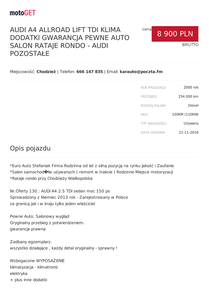 AUDI A4 ALLROAD LIFT TDI KLIMA DODATKI GWARANCJA PEWNE AUTO SALON RATAJE RONDO - AUDI POZOSTAŁE cena 8 900 PLN BRUTTO Miejscowość: Chodzież | Telefon: 666 147 835 | Email: [email protected] 2000 rok 254 000 km Diesel 150KM (110KW) Używany 21-11-2016 Opis pojazdu *Euro Auto Stefaniak Firma Rodzinna od lat z silną pozycją na rynku Jakość i Zaufanie *Salon samochod�łw używanych ( remont w trakcie ) Rodzinne Miejsce motoryzacji *Rataje rondo przy Chodzieży Wielkopolska Nr.Oferty 130.: AUDI A4 2.5 TDI sedan moc 150 ps Sprowadzony z Niemiec 2013 rok - Zarejestrowany w Polsce za granicą jak i w kraju tylko jeden właściciel Pewne Auto. Salonowy wygląd Oryginalny przebieg z potwierdzeniem. gwarancja prawna Zadbany egzemplarz. wszystko działające , każdy detal oryginalny - sprawny ! Wzbogacone WYPOSAŻENIE klimatyzacja - klimatronic elektryka + plus inne dodatki Fajny kolor , atrakcyjny wygląd Dołączone autentyczne zdjęcia + indywidualny opis stworzony do oferty Technicznie stan bardzo dobry pewne sprawdzone auto dynamiczny silnik w świetnej kondycji prowadzi się bez zastrzeżeń ręczna skrzynia bieg�łw - auto do ręki auto bez inwestycji z pełną odpowiedzialnością Polecamy Gwarancja mechaniczna plus prawna. Pewne Auto .Prowadzimy własny program gwarancyjny. Zdobyta wiedza i doświadczenie pozwalają nam na wystawienie fachowej opinii o danym samochodzie Możliwość pozostawienia swojego pojazdu w rozliczeniu- Wygodne Zamiany System Ratalny - KREDYT LEASING oferta kilku bank�łw jesteśmy AUTORYZOWANYM PARTNEREM W dzisiejszych czasach żaden opis oraz zdjęcia nie zastąpią konkretnej rozmowy Dodatkowe informacje Karol 533 133 800 Mateusz 666 147 835 Obsługa placu 530 700 020 Przyjmujemy samochody za got�łwkę tel. 533 133 800 Możliwość przygotowania i przesłania VIDEO prezentacji..Kontakt mailowy mile widziany. Samochody sprzedajemy z gwarancją wymiany, zamiany, odkupu. #Ponosimy pełną prawną odpowiedzialność za zamieszczone ogłoszenie# Kr�łtko o nas: Firma rodzinna. Pasjonaci kt�łrzy kochają swoją pracę. Pełni ciepła, uwielbiamy dzielić się z innymi swoją pozytywną energią. �€�Wierzymy w to co robimy i uwielbiamy kiedy efekty naszej pracy są widoczne. Najważniejszy dla nas jest uśmiech na twarzy klienta.�€� Ciekawostki z życia firmy ''nie samą pracą człowiek żyje'' Videoprezentacja: relacje na żywo, filmiki, teledysk itp nowinki ciekawostki. Opr�łcz pasji do motoryzacji interesujemy się r�łwnież sportem. Bierzemy udział w turniejach firmowych itd. Pomagamy sportowcom z powiatu Chodzieskiego.Wspieramy Zesp�łł piłki nożnej Polonia Chodzież Oldboje. Udzielamy się społecznie, bierzemy czynny udział w akcjach charytatywnych.Wspieramy r�łżnego rodzaju szlachetne cele. Zajmujemy się koniami-uczęszczamy w zawodach sportowych. Sport wodny - w okresie letnim bierzemy udział w rajdach motorowodnych. Promujemy inne firmy. Organizujemy r�łżnego typy imprezy w regionie. Jesteśmy aktywni. Cały czas się rozwijamy i rozszerzmy nasze usługi. Zapraszamy firma Rodzinna Stefaniak z silną pozycją na rynku. - kierownica wielofunkcyjna - ESP - ABS - alufelgi - centr. zamek - el. lusterka - el. szyby - immobiliser - komputer - poduszki - radio z CD - wsp. kierownicy