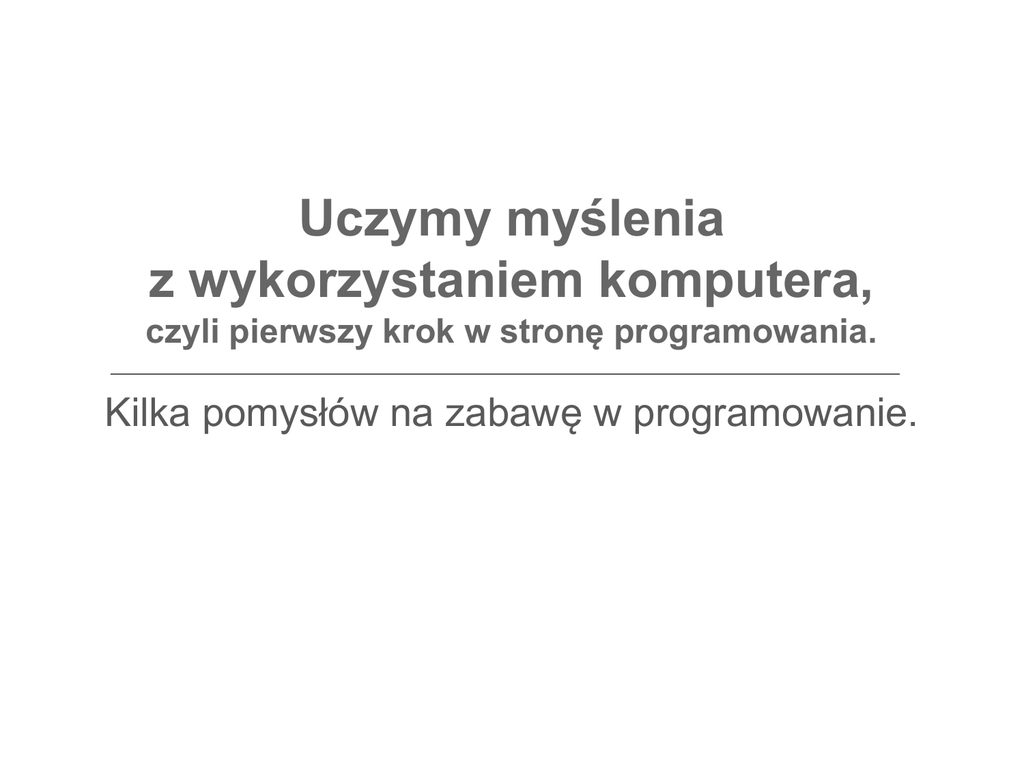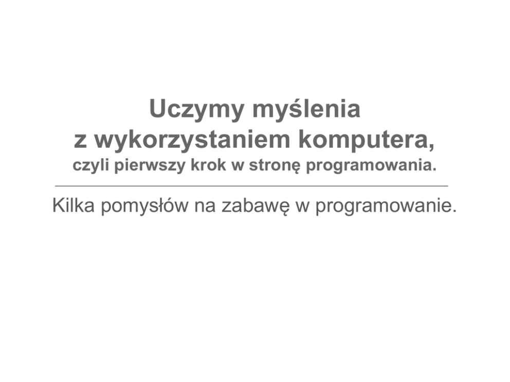 Uczymy myślenia z wykorzystaniem komputera, czyli pierwszy krok w stronę programowania. Kilka pomysłów na zabawę w programowanie. Gotujemy wodę, czyli jak daleko jest od garów do programowania? Gotujemy wodę, czyli jak daleko jest od garów do programowania? Gotujemy wodę, czyli jak daleko jest od garów do programowania? Dodawanie dwóch liczb trzycyfrowych: ● zapisz pierwszą liczbę na kartce; ● zapisz drugą liczbę pod pierwszą wyrównując je do prawej, tak aby cyfra jedności była pod cyfrą jedności pierwszej liczby, analogicznie cyfry dziesiątek i setek; ● pod drugą liczbą narysuj kreskę; ● cd…? Gotujemy wodę, czyli jak daleko jest od garów do programowania? C.d. Dodawanie dwóch liczb trzycyfrowych: ● dodaj cyfry jedności do siebie, ostatnią cyfrę wyniku zapisz pod kreską w kolumnie jedności; ewentualną jedynkę (przeniesienie), jeśli wynik jest dwucyfrowy, dopisz w kolumnie dziesiątek nad pierwszą liczbą; ● dodaj cyfry drugiej kolumny (dziesiątek) analogicznie jak jedności; ewentualne przeniesienie dopisz do kolumny setek; ● dodaj cyfry setek; ewentualne przeniesienie dopisz przed cyfrą setek wyniku. Gotujemy wodę, czyli jak daleko jest od garów do programowania? Algorytm – skończony ciąg jasno zdefiniowanych czynności, koniecznych do wykonania pewnego rodzaju zadań. Gotujemy wodę, czyli jak daleko jest od garów do programowania? Programujemy doskonałego humanoida Ukrywamy się przed wielkim bratem. Szyfr Cezara. Steganografia T-O-R-T-U-R-E Ukrywamy się przed wielkim bratem. Szyfr Cezara. Steganografia 19 ocalonych. Jesteś następny. Nie trać nadziei... Ukrywamy się przed wielkim bratem. Szyfr Cezara. Jak bliski jest koniec świata? Wieże Hanoi. 1 ruch na sekundę, ułożenie wieży zajmie 264−1 = 18 446 744 073 709 551 615 (blisko 18 i pół tryliona) sekund, czyli około 584 miliardów lat. Dla porównania: Wszechświat ma około 13,7 mld lat. Jak bliski jest koniec świata? Wieże Hanoi. Najmniejsza liczba wymaganych ruchów 2n-1 (gdzie n to liczba krążków) Np. dla 3 krążków 23-1=7, a dla 4 krążków 24-1=15 Jak bliski jest koniec świata? Wieże Hanoi. A 1. 2. 3. B C Przenieś najmniejszy krążek na kolejny (*) słupek. Wykonaj jedyny możliwy do wykonania ruch, nie zmieniając położenia krążka najmniejszego Powtarzaj punkty 1 i 2, aż do odpowiedniego ułożenia wszystkich krążków. (*) Kolejny słupek wyznaczamy w zależności od liczby krążków. Jeśli liczba krążków jest parzysta, kolejnym słupkiem jest ten po prawej stronie (gdy dojdziemy do słupka C w następnym ruchu używamy słupka A). Natomiast jeśli liczba krążków jest nieparzysta, kolejnym słupkiem jest ten po lewej stronie (gdy dojdziemy do słupka A w następnym ruchu używamy słupka C) SCRATCH, czyli... wymyśl, zaprogramuj, dziel się. Od beginnera do gier kodera. Zaczynamy! code.org Od beginnera do gier kodera. Zaczynamy! Scratch Od beginnera do gier kodera. Zaczynamy! Od beginnera do gier kodera. Zaczynamy! Polecenia: ● move (do przodu) ● left (obrót w lewo 900) ● right (obrót w prawo 900) ● fire (strzał) ● wait (czekaj) Na przykład: move(4) - 4 pola do przodu left - obrót w lewo 900 move(2)- 2 pola do przodu morrisgames.info