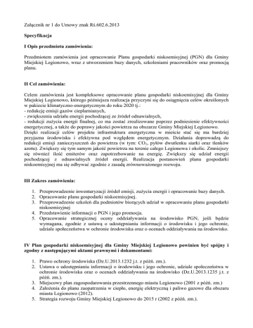 Załącznik nr 1 do Umowy znak Rś.602.6.2013 Specyfikacja I Opis przedmiotu zamówienia: Przedmiotem zamówienia jest opracowanie Planu gospodarki niskoemisyjnej (PGN) dla Gminy Miejskiej Legionowo, wraz z utworzeniem bazy danych, szkoleniami pracowników oraz promocją planu. II Cel zamówienia: Celem zamówienia jest kompleksowe opracowanie planu gospodarki niskoemisyjnej dla Gminy Miejskiej Legionowo, którego późniejsza realizacja przyczyni się do osiągnięcia celów określonych w pakiecie klimatyczno-energetycznym do roku 2020 tj.: - redukcję emisji gazów cieplarnianych, - zwiększenia udziału energii pochodzącej ze źródeł odnawialnych, - redukcji zużycia energii finalnej, co ma zostać zrealizowane poprzez podniesienie efektywności energetycznej, a także do poprawy jakości powietrza na obszarze Gminy Miejskiej Legionowo. Dzięki realizacji celów projektu infrastruktura energetyczna w mieście stać się ma bardziej przyjazna środowisku i efektywna pod względem energetycznym. Działania doprowadzą do redukcji emisji zanieczyszczeń do powietrza (w tym: CO 2, pyłów dwutlenku siarki oraz tlenków azotu). Zwiększy się tym samym jakość powietrza na terenie całego Legionowa i okolic. Zmniejszy się również ilość emiterów oraz zapotrzebowanie na energię. Zwiększy się udział energii pochodzącej z odnawialnych źródeł energii. Realizacja postanowień planu gospodarki niskoemisyjnej ma się odbywać zgodnie z zasadą zrównoważonego rozwoju. III Zakres zamówienia: 1. Przeprowadzenie inwentaryzacji źródeł emisji, zużycia energii i opracowanie bazy danych. 2. Opracowanie planu gospodarki niskoemisyjnej. 3. Przeprowadzenie szkoleń dla podmiotów biorących udział w opracowaniu planu gospodarki niskoemisyjnej 4. Przedstawienie informacji o PGN i jego promocja. 5. Opracowanie strategicznej oceny oddziaływania na środowisko PGN, jeśli będzie wymagana, zgodnie z ustawą o udostępnianiu informacji o środowisku i jego ochronie, udziale społeczeństwa w ochronie środowiska oraz o ocenach oddziaływania na środowisko. IV Plan gospodarki niskoemisyjnej dla Gminy Miejskiej Legionowo powinien być spójny i zgodny z następującymi aktami prawnymi i dokumentami: 1. Prawo ochrony środowiska (Dz.U.2013.1232 j.t. z późń. zm.). 2. Ustawa o udostępnianiu informacji o środowisku i jego ochronie, udziale społeczeństwa w ochronie środowiska oraz o ocenach oddziaływania na środowisko (Dz.U.2013.1235 j.t. z późń. zm.). 3. Miejscowy plan zagospodarowania przestrzennego miasta Legionowo (2001 z późń. zm.) 4. Założenia do planu zaopatrzenia w ciepło, energię elektryczną i paliwo gazowe dla obszaru miasta Legionowo (2012). 5. Strategia rozwoju Gminy Miejskiej Legionowo do 2015 r (2002 z późń. zm.). 6. Studium uwarunkowań i kierunków zagospodarowania przestrzennego Gminy Miejskiej Legionowo (2007). 7. Uchwała w sprawie programu ochrony powietrza dla strefy aglomeracja warszawska w której został przekroczony poziom dopuszczalny dla pyłu zawieszonego PM 2,5 (2013). 8. Plan zrównoważonego rozwoju publicznego transportu transportu zbiorowego dla miasta Legionowo (2013). 9. Załącznik nr 9 do Regulaminu Konkursu nr 2/POIiŚ/9.3/2013 "Szczegółowe zalecenia dotyczące struktury planu gospodarki niskoemisyjnej"(2013). 10. Założenia Narodowego Programu Rozwoju Gospodarki Niskoemisyjnej (2011). 11. Poradnik „Jak opracować plan działań na rzecz zrównoważonej energii (SEAP)” Wspólne Centrum Badawcze Instytutu ds Energii Komisji Europejskiej (2010). V Przeprowadzenie inwentaryzacji źródeł emisji, zużycia energii i opracowanie bazy danych 1. Za rok bazowy należy przyjąć lata 2008 lub 2010 (wybór roku bazowego po przeanalizowaniu przez Wykonawcę dostępnych danych z Założeń do planu zaopatrzenia w ciepło, energię elektryczną i paliwo gazowe dla obszaru miasta Legionowo oraz po uzgodnieniu z Zamawiającym), za rok obliczeniowy należy przyjąć rok 2014, zaś za rok docelowy należy przyjąć rok 2020. 2. Inwentaryzacja zużycia energii oraz emisji CO 2 na terenie Legionowa dla roku obliczeniowego ma być przeprowadzona w oparciu o dostępne informacje z urzędu miasta, innych instytucji oraz przedsiębiorstw. W przypadku braku wiarygodnych dostępnych informacji, drugim źródłem danych na temat zużycia energii i emisji CO 2 będą badania terenowe skierowane do wszystkich pozostałych posiadaczy budynków, przedsiębiorstw oraz instytucji. Inwentaryzacja musi być pełna, rzetelna i udokumentowana, ze szczególnym uwzględnieniem sektorów w których Zamawiający może podjąć działania w kierunku zmniejszenia emisji CO2, zapotrzebowania na energię i zanieczyszczenia powietrza. Zamawiający udostępni Wykonawcy bazę adresową budynków na terenie Legionowa oraz dane dotyczące zaopatrzenia w ciepło systemowe oraz gaz ziemny do celów grzewczych. 3. Inwentaryzacja budynków użyteczności publicznej oraz mieszkalnych wielorodzinnych musi zawierać następujące informacje: a) nazwę i adres obiektu b) powierzchnię, kubaturę i źródło ciepła c) średnioroczne zużycie energii i paliw (ciepło systemowe, prąd, gaz ziemny, węgiel, olej opałowy itd.) d) stan ocieplenia i możliwości termomodernizacji lub optymalizacji energetycznej 4. Inwentaryzacja budynków mieszkalnych jednorodzinnych oraz usługowo-przemysłowych musi zawierać następujące informacje: a) adres obiektu b) źródło ciepła c) średnioroczne zużycie energii i paliw (ciepło systemowe, prąd, gaz ziemny, węgiel, olej opałowy itd.) d) jeśli Wykonawca nie może pozyskać informacji z punktu b) i c) z dostępnych danych od dostawców mediów i energii, to ma obowiązek przeprowadzenia ankiety terenowej. Celem ankiety jest pozyskanie wiarygodnych informacji o nieruchomościach ogrzewanych w inny sposób iż ciepło systemowe lub gaz ziemny. Przed wykonaniem ankiet Wykonawca, w porozumieniu z Zamawiającym, przeprowadzi akcję informacy
