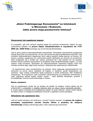 Warszawa, 24 czerwca 2013 r. „Dzień Podróżującego Konsumenta” na lotniskach w Warszawie i Krakowie. Jakie prawa mają pasażerowie lotniczy? Zniszczenie lub zagubienie bagażu W przypadku, gdy linie lotnicze zagubią bagaż lub podczas przeładunku dojdzie do jego uszkodzenia pasażer ma prawo żądać odszkodowania w wysokości do 1131 SDR (ok. 5500 PLN) powołując się na Konwencję Montrealską. Jest to górna granica odpowiedzialności przewoźnika. Obowiązek udowodnienia poniesionej szkody spoczywa na konsumencie. W tym celu konieczne jest przedstawienie kopii PIR, czyli protokołu nieprawidłowości bagażowej, który należy wypełnić będąc jeszcze na lotnisku. Do wyceny wartości zagubionej czy zniszczonej walizki niezbędne są rachunki za przedmioty, które znajdowały się w środku (np. odzież, kosmetyki itp.). Gdy pasażer ich nie posiada, wartość szkody zostanie oszacowana na podstawie wagi zarejestrowanego bagażu, a to jest zawsze mniej korzystne. Sposobem na udokumentowanie zawartości bagażu może być również zrobienie jego zdjęć przed wylotem i dokładnej listy spakowanych przedmiotów. - W regulaminach wielu przewoźników są przepisy, które wyłączają odpowiedzialność linii lotniczych za cenne rzeczy wkładane do bagażu, tj. biżuteria, sprzęt fotograficzny czy sportowy. Tego rodzaju przedmioty lepiej przewozić w torbie podręcznej, albo dodatkowo ubezpieczyć. W przeciwnym razie uzyskanie odszkodowania za przedmioty wartościowe w razie zaginięcia walizki będzie bardzo trudne – radzi Elżbieta Serdyńska, prawnik z Europejskiego Centrum Konsumenckiego w Polsce. Warto wiedzieć! Gdy po wylądowaniu okaże się, że walizka nie dotarła na miejsce, można zgłosić się do przewoźnika z wnioskiem o wypłatę dziennej diety na zakup rzeczy pierwszej potrzeby, tj. środki higieny osobistej oraz podstawowa odzież. W razie odmowy, można zrobić zakupy na własny koszt, a następnie przedstawić rachunki z żądaniem zwrotu pieniędzy. Odwołanie lub opóźnienie lotu Jeśli lot został odwołany lub opóźniony o ponad 5 godzin pasażer ma prawo do wyboru pomiędzy uzyskaniem zwrotu kosztu biletu a podróżą do miejsca docelowego według zmienionego planu, który zaproponuje przewoźnik. „Zwrot kosztów” i „odszkodowanie” nie oznacza tego samego. W sytuacji zaistnienia okoliczności nadzwyczajnych, takich jak strajk w porcie lotniczym, zamieszki czy katastrofa naturalna, klient ma prawo do 100% zwrotu kosztów niewykorzystanego biletu. Natomiast nie przysługuje mu w takich okolicznościach prawo do odszkodowania (czyli dodatkowej rekompensaty finansowej, np. za opóźnienie lotu, stracony urlop itp.). W przypadku odwołania lub opóźnienia lotu o co najmniej 3 godziny pasażerowie mogą domagać się odszkodowania w wysokości od 250 EUR do 600 EUR w zależności od długości lotu, np. za odwołanie lotu na trasie Warszawa – Madryt pasażer może otrzymać 400 EUR. Dodatkowo przewoźnik ma obowiązek zapewnić pasażerom opiekę zawsze, gdy oczekiwanie na lot się przedłuża lub połączenie zostało odwołane. Opieka oznacza nie tylko informowanie na bieżąco o stanie opóźnienia, ale także zapewnienie bezpłatnie posiłków i napojów (np. kanapek, wody). Jeśli czas oczekiwania wymagałby spędzenia nocy na lotnisku, przewoźnik ma obowiązek zapewnić pasażerom darmowe zakwaterowanie w hotelu. Pasażerowie powinni mieć też zapewnioną możliwość przeprowadzenia dwóch rozmów telefonicznych, nadania dwóch przesyłek faksowych lub wysłania e-maili. - Gdy linie lotnicze zaniedbają pasażerów na lotnisku, jest to podstawa do reklamacji. Warto do niej załączyć rachunek, np. za posiłek z baru na lotnisku z żądaniem zwrotu poniesionych kosztów, jeśli przewoźnik przez kilka godzin oczekiwania na opóźniony lot nie dostarczył choćby kanapki – radzi Elżbieta Seredyńska, prawnik z Europejskiego Centrum Konsumenckiego w Polsce. Odmowa przyjęcia na pokład Jeżeli z uzasadnionych przyczyn przewoźnik odmówi przyjęcia na pokład pasażerów, to osoby, które dobrowolnie zrezygnują z danego lotu mają prawo do odszkodowania, prawo do opieki oraz prawo do otrzymania dodatkowej korzyści na warunkach uzgodnionych pomiędzy danym pasażerem a przewoźnikiem lotniczym. W przypadku odmowy przyjęcia pasażerów na pokład wbrew ich woli, pasażerom przysługuje: prawo do odszkodowania, prawo do wyboru pomiędzy zwrotem kosztów biletu a podróżą do miejsca docelowego wg zmienionego połączenia i prawo do opieki UWAGA: Zakres obowiązywania Rozporządzenia WE 261/2004 Przepisy Rozporządzenia WE 261/2004, na podstawie którego pasażerowie mogą domagać się odszkodowania za duże opóźnienie czy odwołanie lotu, mają zastosowanie w sytuacji: • odlotu z lotniska znajdującego się na terytorium państwa członkowskiego UE/Europejskiego Obszaru Gospodarczego (UE + Lichtenstein, Norwegia i Islandia) albo Szwajcarii; • odlotu z lotniska znajdującego sie w kraju trzecim i lądujących na lotnisku znajdującym się na terytorium państwa członkowskiego UE/EOG lub Szwajcarii, jeżeli przewoźnik obsługujący dany lot jest przewoźnikiem z państwa członkowskiego UE/EOG/ albo ze Szwajcarii. • Gdy pasażer stawił się na odprawę w czasie uprzednio określonym na piśmie przez przewoźnika lotniczego, jeżeli czas ten nie został określony – nie później niż 45 minut przed ogłoszoną godziną odlotu. Jak napisać reklamację do linii lotniczych? Jeśli reklamację kierujemy do zagranicznego przewoźnika, pismo powinno być przygotowane w języku dla niego zrozumiałym. W praktyce najczęściej stosuje się język angielski. Gotowy wzór formularza znajduje się na stronie www.konsument.gov.pl, w zakładce „Złóż skargę”. • • Zagubienie, uszkodzenie, opóźnienie bagażu: Należy opisać rodzaj szkody oraz dokonać jej wyceny. Do reklamacji trzeba załączyć kwit bagażowy a tak