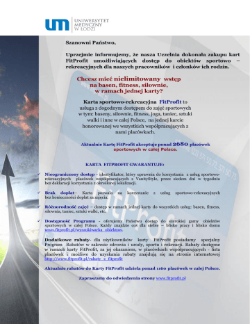Szanowni Państwo, Uprzejmie informujemy, że nasza Uczelnia dokonała zakupu kart FitProfit umożliwiających dostęp do obiektów sportowo – rekreacyjnych dla naszych pracowników i członków ich rodzin. Chcesz mieć nielimitowany wstęp na basen, fitness, siłownie, w ramach jednej karty? Karta sportowo-rekreacyjna FitProfit to usługa z dogodnym dostępem do zajęć sportowych w tym: baseny, siłownie, fitness, joga, taniec, sztuki walki i inne w całej Polsce, na jednej karcie honorowanej we wszystkich współpracujących z nami placówkach. Aktualnie Kartę FitProfit akceptuje ponad 2680 placówek sportowych w całej Polsce. KARTA FITPROFIT GWARANTUJE: Nieograniczony dostęp - identyfikator, który uprawnia do korzystania z usług sportoworekreacyjnych placówek współpracujących z VanityStyle, przez siedem dni w tygodniu bez deklaracji korzystania z określonej lokalizacji. Brak dopłat– Karta pozwala bez konieczności dopłat za zajęcia. Różnorodność zajęć – dostęp w ramach jednej karty do wszystkich usług: basen, fitness, siłownia, taniec, sztuki walki, etc. Dostępność Programu - oferujemy Państwu dostęp do szerokiej gamy obiektów sportowych w całej Polsce. Każdy znajdzie coś dla siebie – blisko pracy i blisko domu www.fitprofit.pl/wyszukiwarka_obiektow. na korzystanie z usług sportowo-rekreacyjnych Dodatkowe rabaty- dla użytkowników karty FitProfit posiadamy specjalny Program Rabatów w zakresie zdrowia i urody, sportu i rekreacji. Rabaty dostępne w ramach karty FitProfit, za jej okazaniem, w placówkach współpracujących - lista placówek i możliwe do uzyskania rabaty znajdują się na stronie internetowej http://www.fitprofit.pl/rabaty_z_fitprofit Aktualnie rabatów do Karty FitProfit udziela ponad 1160 placówek w całej Polsce. Zapraszamy do odwiedzenia strony www.fitprofit.pl Jak skorzystać z Programu Program FitProfit będzie obowiązywał od miesiąca lutego 2014 r. od momentu otrzymania karty FITPROFIT. Koszt jednej karty wynosi 86.00 zł miesięcznie. Korzystanie z programu będzie dofinansowywane z ZFŚS w wysokości 50% bądź 55% ceny karty w zależności od przychodów. W związku z powyższym, opłata dla pracownika, współmałżonka i uczącego się dziecka do 25 roku życia wynosi 38,70 albo 43.00 zł miesięcznie. Pozostała część kosztów karty jest przychodem pracownika i podlega opodatkowaniu podatkiem dochodowym od osób fizycznych. Comiesięczna opłata za korzystanie z Programu będzie potrącana z wynagrodzenia, za zgodą pracownika. Pracownicy zainteresowani wzięciem udziału w Programie powinni dokonać zgłoszenia do dnia 27 stycznia 2014 r. do Sekcji Spraw Socjalnych (pl. Hallera 1 , bud.1, pok. Nr 214, 215) lub do Działu Spraw Osobowych (al. Kościuszki 4, pok. Nr 41 ).ZGŁOSZENIE Zapraszamy do zapoznania się z prezentacją Programu FitProfit. PREZENTACJA Szczegółowe zasady korzystania z programu FitProfit: osoby, u których nie ma możliwości potrącenia opłaty z wynagrodzenia ( emeryci, renciści, osoby będące na urlopach wychowawczych, osoby, które mają wynagrodzenie obciążone innymi należnościami nie mogą korzystać z programu ). Rezygnację z udziału w programie należy zgłaszać niezwłocznie na piśmie (DRUK REZYGNACJI) nie później niż do 10 dnia miesiąca poprzedzającego ten, od którego chce się zakończyć korzystanie z Programu, a na koniec miesiąca należy zwrócić kartę. Pracownicy, z którymi ustaje stosunek pracy z Uczelnią, a korzystają z Programu proszone są o zgłoszenie tego faktu niezwłocznie oraz zwrot karty. Karta jest kartą imienną i nie może być udostępniana innym osobom. Osoby korzystające z Programu zobowiązane są do zapoznania się z regulaminem korzystania z Programu FitProfit REGULAMIN Sekcja Spraw Socjalnych Biura Kadr UM w Łodzi