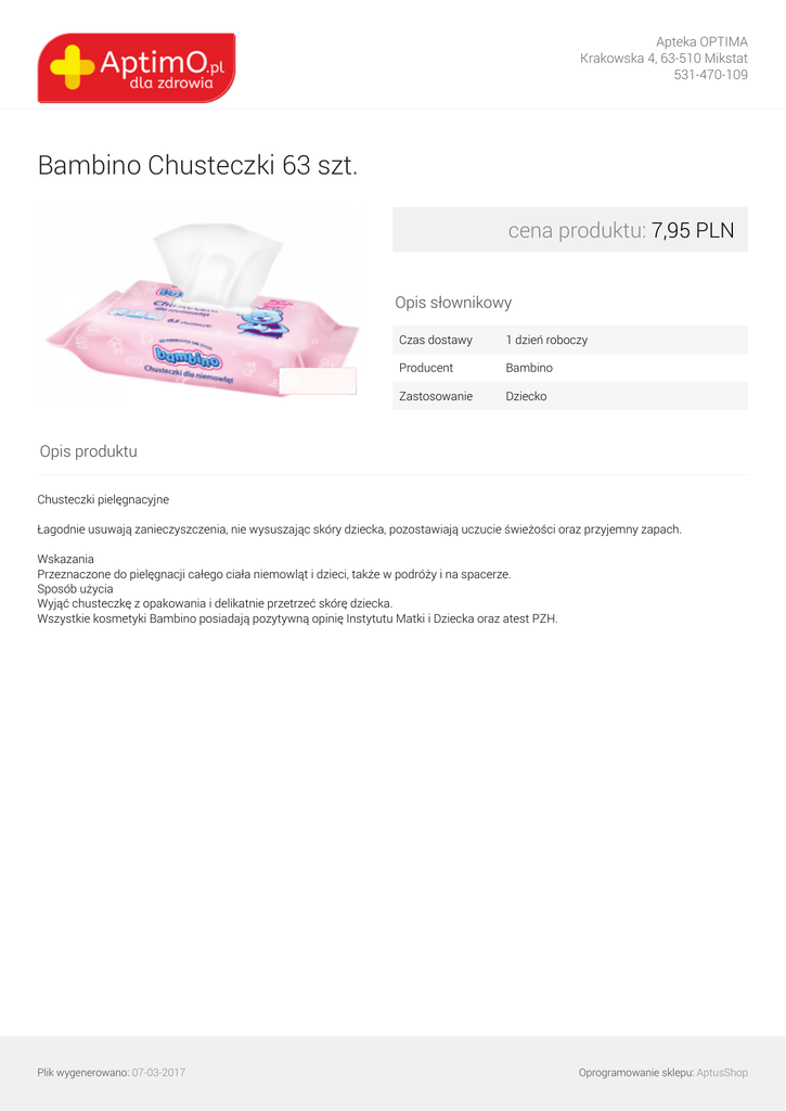 Apteka OPTIMA Krakowska 4, 63-510 Mikstat 531-470-109 Bambino Chusteczki 63 szt. cena produktu: 7,95 PLN Opis słownikowy Czas dostawy 1 dzień roboczy Producent Bambino Zastosowanie Dziecko Opis produktu Chusteczki pielęgnacyjne Łagodnie usuwają zanieczyszczenia, nie wysuszając skóry dziecka, pozostawiają uczucie świeżości oraz przyjemny zapach. Wskazania Przeznaczone do pielęgnacji całego ciała niemowląt i dzieci, także w podróży i na spacerze. Sposób użycia Wyjąć chusteczkę z opakowania i delikatnie przetrzeć skórę dziecka. Wszystkie kosmetyki Bambino posiadają pozytywną opinię Instytutu Matki i Dziecka oraz atest PZH. Plik wygenerowano: 07-03-2017 Powered by TCPDF (www.tcpdf.org) Oprogramowanie sklepu: AptusShop