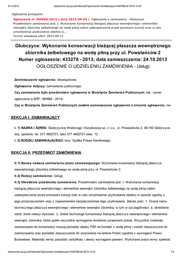 24.10.2013 bzp0.portal.uzp.gov.pl/index.php?ogloszenie=show&pozycja=433278&rok=2013-10-24 Ogłoszenie powiązane: Ogłoszenie nr 360968-2013 z dnia 2013-09-05 r. Ogłoszenie o zamówieniu - Głubczyce Przedmiotem zamówienia jest: I. Wykonanie konserwacji bieżącej płaszcza wewnętrznego i elementów wewnątrz zbiornika żelbetowego na wodę pitną celem zabezpieczenia przed procesem korozji oraz w celu umożliwienia użytkowania obiektu w... Termin składania ofert: 2013-09-13 Głubczyce: Wykonanie konserwacji bieżącej płaszcza wewnętrznego zbiornika żelbetowego na wodę pitną przy ul. Powstańców 2 Numer ogłoszenia: 433278 - 2013; data zamieszczenia: 24.10.2013 OGŁOSZENIE O UDZIELENIU ZAMÓWIENIA - Usługi Zamieszczanie ogłoszenia: obowiązkowe. Ogłoszenie dotyczy: zamówienia publicznego. Czy zamówienie było przedmiotem ogłoszenia w Biuletynie Zamówień Publicznych: tak, numer ogłoszenia w BZP: 360968 - 2013r. Czy w Biuletynie Zamówień Publicznych zostało zamieszczone ogłoszenie o zmianie ogłoszenia: nie. SEKCJA I: ZAMAWIAJĄCY I. 1) NAZWA I ADRES: Głubczyckie Wodociągi i Kanalizacja sp. z o.o., ul. Powstańców 2, 48-100 Głubczyce, woj. opolskie, tel. 077 4852721, faks 077 4852721 wew. 12. I. 2) RODZAJ ZAMAWIAJĄCEGO: Inny: Spółka Prawa Handlowego. SEKCJA II: PRZEDMIOT ZAMÓWIENIA II.1) Nazwa nadana zamówieniu przez zamawiającego: Wykonanie konserwacji bieżącej płaszcza wewnętrznego zbiornika żelbetowego na wodę pitną przy ul. Powstańców 2. II.2) Rodzaj zamówienia: Usługi. II.3) Określenie przedmiotu zamówienia: Przedmiotem zamówienia jest: I. Wykonanie konserwacji bieżącej płaszcza wewnętrznego i elementów wewnątrz zbiornika żelbetowego na wodę pitną celem zabezpieczenia przed procesem korozji oraz w celu umożliwienia użytkowania obiektu w sposób zgodny z jego przeznaczeniem oraz z zapewnieniem bezpieczeństwa tego użytkowania. Zakres prac: 1. Ocena stanu technicznego płaszcza wewnętrznego i elementów wewnątrz zbiornika, w tym w szczególności: a. określenie robót, które należy wykonać. 2. Dobór technologii konserwacji bieżącej płaszcza wewnętrznego i elementów wewnątrz zbiornika, która spełni wszystkie wymagania określone przepisami prawa. Wszystkie materiały zastosowane do konserwacji muszą posiadać atesty PZH na kontakt z wodą pitną i zostać dopuszczone do zastosowania oraz posiadać dopuszczenie do stosowania na terenie Polski zgodnie z wymogami Prawo Budowlane. Materiały winny posiadać certyfikaty i atesty wymagane prawem. Wykonane prace winny spełniać bzp0.portal.uzp.gov.pl/index.php?ogloszenie=show&pozycja=433278&rok=2013-10-24 1/4 24.10.2013 bzp0.portal.uzp.gov.pl/index.php?ogloszenie=show&pozycja=433278&rok=2013-10-24 wymagania podstawowe i funkcjonalne określone w obowiązujących przepisach: a) Ustawa z dnia 7 lipca 1994r. Prawo budowlane (Dz. U. Nr 156 z 2006 r. póź. 1118 z późn. zm.). b) PN-EN 1508:202, Zaopatrzenie w wodę. Wymagania dotyczące systemów i ich części składowych przeznaczonych do gromadzenia wody. c) PN-EN 1540-9, Wyroby i systemy do ochrony i napraw konstrukcji betonowych. Definicje, wymagania, sterowanie jakością i ocena zgodności. Część 9: Ogólne zasady dotyczące stosowania wyrobów i systemów. d) PN-EN 1540-10, Wyroby i systemy do ochrony i napraw konstrukcji betonowych. Definicje, wymagania, sterowanie jakością i ocena zgodności. Część 10: Stosowanie wyrobów i systemów na placu budowy oraz sterowanie jakością prac. e) PN-88/B-01807 Antykorozyjne zabezpieczenia w budownictwie. Konstrukcje betonowe i żelbetowe. Zasady diagnostyki konstrukcji. f) PN-B-03264:2002 Konstrukcje betonowe, żelbetowe i sprężone. Obliczenia statyczne i projektowanie. g) PN-82/B-01801 Antykorozyjne zabezpieczenia w budownictwie. Konstrukcje h) betonowe i żelbetowe. Podstawowe zasady projektowania. i) PN-86/B-01811 Antykorozyjne zabezpieczenia w budownictwie. Konstrukcje j) betonowe i żelbetowe. Ochrona materiałowokonstrukcyjna. Wymagania. k) PN-63/B-06251 Roboty betonowe i żelbetowe. Wymagania techniczne. l) PN85/B-10702 Wodociągi i kanalizacja. Zbiorniki. Wymagania i badania przy odbiorze. m) Obwieszczenie Ministra Infrastruktury z dn. 12.04.2002r w sprawie warunków technicznych, jakim powinny odpowiadać budynki i ich usytuowanie Dz. U. nr 75 z 15.06.2002r. n) Instrukcja nr 240 ITB. Zabezpieczenie przed korozją konstrukcji betonowych i żelbetowych. Warszawa 1982r. o) Inne przepisy prawa obowiązujące w tym zakresie. 3. Dobór technologii winien umożliwić korzystanie po zakończeniu robót ze zbiornika wody czystej bez wykonywania dodatkowych działań i prac przez Zamawiającego. 4. Przeprowadzenie badań bakteriologicznych wody przez certyfikowane laboratorium po zakończeniu robót budowlanych związanych z konserwacją. 5. Dokonanie prezentacji wybranej technologii konserwacji w siedzibie Zamawiającego. 6. Wykonanie robót budowalnych związanych z konserwacją bieżącą płaszcza wewnętrznego i elementów wewnątrz zbiornika. 7. Sporządzenie zestawienia kosztów na wykonanie prac objętych przedmiotem zamówienia. Opracowania kosztowe muszą spełniać wymagania określone w: a) Rozporządzeniu Ministra Infrastruktury z dnia 2 września 2004r. w sprawie szczegółowego zakresu i form dokumentacji projektowej, specyfikacji technicznych wykonania i odbioru robót budowlanych oraz programu funkcjonalno- użytkowego (Dz. U. z 2004 r. Nr 202 poz. 2072). b) Rozporządzeniu Ministra Infrastruktury z dnia 18 maja 2004 w sprawie określenia metod i podstaw sporządzenia kosztorysu inwestorskiego, obliczania planowanych kosztów prac projektowych oraz planowanych kosztów robot budowlanych określonych w programie funkcjonalno - użytkowym (Dz. U. z 2004 r. Nr130 poz. 1389). Przygotowane opracowanie w swej treści powinno zawierać w szczególności: 1. określenie technologii konserwacji, materiałów, maszyn i urządzeń którymi będzie wykonana k
