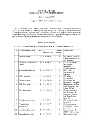 UCHWAŁA NR 90/07 ZARZĄDU POWIATU W MIĘDZYRZECZU z dnia 14 sierpnia 2007 r. w sprawie składników majątku ruchomego Na podstawie art. 32 ust. 2 pkt 3 ustawy z dnia 5 czerwca 1998 r. o samorządzie powiatowym (Dz. U. z 2001 r. Nr 142, poz. 1592 z późn. zm.) oraz § 5 ust. 1 uchwały Nr 89 Zarządu Powiatu w Międzyrzeczu z dnia 2 grudnia 2004 r. w sprawie określenia zasad gospodarowania składnikami majątku ruchomego powierzonego jednostkom budżetowym i gospodarstwom pomocniczym działając na wniosek Dyrektora Domu Pomocy Społecznej w Rokitnie nr 58 uchwala się, co następuje: § 1. Zalicza się następujące składniki majątku trwałego do kategorii majątku zużytego: L.p. Nazwa środka trwałego Ilość Nr inwentarzowy 1. Lampa biurowa 3 8 80 808 37 Wartość rynkowa zł 0 2. Ogrzewacz pomieszczeń – Farelka 1 8 80 800 77 0 3. Wózek inwalidzki – dary 1 8 80 802 18 0 4. Łóżko meblowe 12 8 80 808 2 0 5. Gablota na klucze 2 8 80 808 36 0 6. Ssak elektryczny 1 8 80 802 13 0 7. Sterylizator mały 6 8 80 802 12 0 8. Narzędzia dentystyczne 25 8 80 802 6 0 9. Mieszalnik do amalgamentu 1 8 80 802 7 0 10. Szafa lekarska oszklona 1 8 80 808 15 0 11. Lampa bakteriobójcza 1 8 80 802 5 0 Uzasadnienie Uszkodzone trwale nie nadają się do dalszego użytkowania Sprzęt przestarzały, wycofany ze względów bezpieczeństwa Brak części zamiennych do naprawy Wycofane z użytkowania Zniszczone, nie estetyczne z wyglądu Urządzenie wycofane z użytkowania – stary model (20 lat) Sprzęt wycofany z użytkowania – nie stosuje się obecnie sterylizacji przez gotowanie Narzędzia 30-letnie wycofane Zniszczony przez mieszkańca – nie do naprawy Zniszczona trwale – 30 lat w użytkowaniu Uszkodzona trwale 12. Krzesło tarasowe PCV 2 8 80 808 20 0 13. Żaluzje okienne 2 8 80 802 5 0 14. Szafy/szafki różne 10 8 80 808 15 0 15. Organy – zabawka 2 8 80 805 0/1 0 16. Gra komputerowa 2 8 80 800 1 0 17. Radiomagnetofon 2 8 80 800 8 0 18. Aparat fotograficzny 5 8 80 800 6 0 19. Stół 27 8 80 808 8 0 20. Wózek gospodarczy 3 8 80 808 7 0 2m2 5 2 2 12 2 5 4 8 80 808 10 8 80 808 16 8 80 808 19 8 80 808 21 8 80 808 23 8 80 808 25 8 80 808 31 8 80 808 38 0 0 0 0 0 0 0 0 29. Kwiaty sztuczne 44 8 80 808 43 0 30. Antena pokojowa 1 8 80 808 4 0 31. Termos 32. Żelazko elektryczne 3 1 8 80 802 19/1 8 80 800 72 0 0 33. Suszarka do naczyń – siatka 34. Zegar wiszący 1 8 80 800 78 0 3 8 80 808 61 0 35. Ławki gimnastyczne 36. Piłka lekarska 2 1 8 80 808 65 8 80 808 68 0 0 37. Rożen ogrodowy 38. Colorofon - zabawka 1 1 8 80 808 76 8 80 805 0 7 0 0 39. Gitara klasyczna 40. Marakasa (grzechotka) 1 10 8 80 805 0 8 8 80 800 103 0 0 21. 22. 23. 24. 25. 26. 27. 28. Wykładzina podłogowa Pawlacz Ława Fotel Tapczan Garderoba Lustro Torba podróżna stary model brak części zamiennych Połamane przez mieszkańców Uszkodzone nie nadają się do dalszego użytku Trwale zniszczone – nie nadają się do naprawy Trwale uszkodzone przez mieszkańca Trwale uszkodzone w trakcie użytkowania Zniszczone przez mieszkańców Stare typy aparatów – brak części do ich naprawy W użytkowaniu ponad 20 lat – trwale zniszczone, nieestetyczne. W użyciu przez 30 lat nie nadają się do naprawy Trwale zniszczona Trwale zniszczone Trwale zniszczone Trwale zniszczone Trwale zniszczone Trwale zniszczone Trwale zniszczone Otrzymane z darów jako używane. Trwale zniszczone. Wycofane z użytkowania Uszkodzona przez mieszkańca – nie nadaje się do naprawy Popękane wkłady Zniszczona obudowa przez mieszkańca Wycofana z użytkowania Uszkodzone mechanizmy Trwale uszkodzone Rozdarta – nie nadaje się do naprawy Uszkodzony trwale Zniszczone przez mieszkańca Trwale uszkodzona Popękane – nie nadają 41. Ksylofon ( cymbałki) 42. Piłeczki do suchego basenu 43. Telewizor 1 8 80 800 104 244 8 80 808 89 0 0 1 8 80 800 3 0 44. Pilarka spalinowa Sthill 1 8 80 800 54 0 45. Drukarka – urządzenie wielofunkcyjne 1 8 80 803 6 0 46. Suszarka do rąk 1 8 80 800 78 0 47. Tablica do planu zajęć 48. Kosiarka spalinowa żyłkowa 1 1 8 80 808 35 8 80 800 92 0 0 49. Opryskiwacz ogrodowy 2 8 80 800 59 0 50. Butla gazowa 51. Taczka 1 2 8 80 800 59 8 80 808 8 0 0 52. Wiertarka elektryczna 2 8 80 800 27 0 53. Zjeżdżalnia 2 8 80 808 70 0 54. Huśtawka 55. Wspinaczka 56. Kosze słupowe 2 2 7 8 80 808 73 8 80 808 72 8 80 808 59 0 0 0 57. Radioodbiornik 58. Pralka wirnikowa 2 1 8 80 800 5 8 80 800 21 0 0 59. Kuchnia gazowa 1 8 80 800 58 0 się do użytku Połamane – nie do naprawy Popękane - trwale uszkodzone Rozbity przez mieszkańca nie nadaje się do naprawy. Trwale uszkodzona w okresie 16 lat użytkowania Uszkodzona kaseta drukująca i elektronika Wycofane ze względów bezpieczeństwa Zniszczona Uszkodzone główne podzespoły. Brak części zamiennych Wycofane ze względu bezpieczeństwa – ponad 25 lat w użytkowaniu j.w. Zniszczone w bardzo dużym stopniu Długi okres użytkowania ( 15 i 12 lat) Brak części zamiennych. Urządzenie wycofane z użytkowania – nie zgodne z obowiązującymi normami bezpieczeństwa. j.w. j.w. Nieestetyczne i niepraktyczne kosze na śmieci Sprzęt starego typu. Trwale uszkodzona – pęknięta plastikowa obudowa Nieszczelności w instalacji kuchni – wycofana z użytkowania § 2. Wyraża się zgodę na likwidację składników, o których mowa w § 1. § 3. Wykonanie uchwały powierza się Dyrektorowi Domu Pomocy Społecznej w Rokitnie nr 58. § 4. Uchwała wchodzi w życie z dniem podjęcia. ZARZĄD: 1. Grzegorz Gabryelski 2. Remigiusz Lorenz 3. Grażyna Filipek 4. Wacława Kuczyńska 5. Dariusz Orzeszko