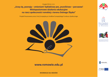 Projekt PO KL 1.3.1: „Uczę się, poznaję – zmieniam! Syklakiraw pes, prynćkiraw – paruwaw! Wielopoziomowe działania edukacyjne na rzecz społeczności romskiej z terenu Dolnego Śląska” Projekt finansowany przez Unię Europejską ze środków Europejskiego Funduszu Społecznego Stowarzyszenie Asystentów Edukacji Romskiej w P olsce www.romowie.edu.pl INFORMACJE DLA MEDIÓW „Uczę się, poznaję – zmieniam! Syklakiraw pes, prynćkiraw – paruwaw! – Wielopoziomowe działania edukacyjne na rzecz społeczności romskiej z terenu Dolnego Śląska” - pod tym długim tytułem kryje się realizowany w ramach Programu Operacyjnego Kapitał Ludzki (Poddziałanie 1.3.1) projekt, którego głównym celem jest wzrost poziomu edukacji i integracji społecznej członków społeczności romskiej na Dolnym Śląsku. Pomysłodawcą projektu jest Dom Spotkań im. Angelusa Silesiusa (zaś. nr 90/2003 wpisu do rejestru szkół i placówek niepublicznych UM Wrocławia) - www.silesius.org.pl, realizujący go w partnerstwie ze Stowarzyszeniem Asystentów Edukacji Romskiej w Polsce. Projekt realizowany jest na terenie Wrocławia, Wałbrzycha, Kamiennej Góry i Kłodzka w latach 2011-2013. Główną grupą docelową projektu są dzieci romskie uczące się w szkołach podstawowych i gimnazjach, dorośli Romowie, ale także dzieci i dorośli z otoczenia społecznego Romów. Nasz projekt realizujemy poprzez 7 zadań obejmujących wszystkie ww. grupy docelowe, począwszy od Podnoszenia wyników w nauce uczniów romskich w gimnazjum, Rozwoju wolontariatu na rzecz edukacji młodzieży romskiej, organizowania zajęć w ramach Edukacji Pozaformalnej oraz Edukacji Zawodowej, organizacji Warsztatów w szkołach oraz Warsztatów dla dorosłych, a skończywszy na 7 zadaniu, jakim są Warsztaty dla asystentów romskich i członków stowarzyszeń romskich. Co wyróżnia nasz projekt? Planując i podejmując się realizacji przedmiotowego projektu, bazowaliśmy na doświadczeniach wypracowanych w trakcie realizacji Programu na rzecz społeczności romskiej w Polsce. Problemy społeczności romskiej wskazane w Programie MSWiA jeśli chodzi o sferę edukacji, uczestnictwo w życiu publicznym, ale przede wszystkim poziom wiedzy na temat samej społeczności romskiej wśród nie-romskiej większości społeczeństwa stały się podstawą projektu opracowanego przez Dom Spotkań im. Angelusa Silesiusa i Stowarzyszenie Asystentów Edukacji Romskiej w Polsce. Wieloletnia współpraca i wymiana doświadczeń z Asystentami Edukacji Romskiej oraz z nauczycielami wspomagającymi edukację dzieci romskich pozwoliły przygotować projekt odpowiadający potrzebom zarówno samej społeczności romskiej (zwłaszcza dzieci), jak i nie-romskich członków społeczności szkolnej. W ciągu 3 lat realizacji projektu (2011-2013) obejmiemy działaniami grupę ponad 380 uczniów i uczennic oraz ponad 120-osobową grupę dorosłych pochodzenia romskiego, grupę 3 600 uczniów i uczennic uczących się wspólnie z romskimi dziećmi i 810 osób dorosłych z otoczenia społeczności romskiej. Nasze działania w środowisku romskim powinny wesprzeć i uzupełnić istniejące już inicjatywy służące wyrównaniu szans edukacyjnych uczniów romskich, realizowane ze środków Programu na rzecz społeczności romskiej, a warsztaty dla dorosłych oraz nie-romskich uczniów szkół podstawowych i gimnazjalnych przyczynią się do budowania większej otwartości i akceptacji dla członków społeczności romskiej. Główną grupą docelową projektu są dzieci romskie uczące się w szkołach podstawowych i gimnazjach, dorośli Romowie, ale także dzieci i dorośli z otoczenia społecznego Romów. Nasz projekt realizujemy poprzez 7 zadań obejmujących wszystkie ww. grupy docelowe, począwszy od: - podnoszenia wyników w nauce uczniów romskich w gimnazjum, - rozwoju wolontariatu na rzecz edukacji młodzieży romskiej - organizowania zajęć w ramach Edukacji Pozaformalnej oraz Edukacji Zawodowej, - organizacji Warsztatów w szkołach oraz Warsztatów dla dorosłych, a skończywszy na 7 zadaniu, jakim są: - warsztaty dla asystentów romskich i członków stowarzyszeń romskich Pierwsze dwa zadania: Podnoszenie wyników w nauce uczniów romskich w gimnazjum, Rozwój wolontariatu na rzecz edukacji młodzieży romskiej zakładają m.in. organizację zajęć wyrównawczych z języka polskiego, matematyki i przedmiotów przyrodniczych oraz pomoc w odrabianiu lekcji, za które odpowiadać będą nauczyciele oraz wolontariusze zaangażowani do projektu. Kolejne dwa zadania: Edukacja Pozaformalna i Edukacja Zawodowa mają przede wszystkim na celu zapobieżenie dysfunkcjom społecznym wśród młodych ludzi, poprzez m.in. zwiększenie dostępu, a co za tym idzie uczestnictwa w życiu kulturalnym, przybliżenie interesujących zawodów, poznanie własnych talentów oraz predyspozycji zawodowych. W ramach zadań: Warsztaty w szkołach i Warsztaty dla dorosłych przygotowaliśmy program zajęć z elementami warsztatów antydyskryminacyjnych, międzykulturowych oraz wiedzy o kulturze romskiej. Adresaci tych zajęć to z jednej strony młodzież szkolna, z drugiej: osoby dorosłe związane z edukacją (nauczyciele i dyrektorzy szkół publicznych, studenci pedagogiki i kierunków pokrewnych, przygotowujących do pracy w systemie oświaty, jak też np. pracownicy sektora NGO, realizujący zadania na rzecz społeczności romskiej). Poprzez ostatnie zadanie: Warsztaty dla asystentów romskich i członków stowarzyszeń romskich chcemy zwiększać profesjonalizację tych grup i wspierać ich aktywność na rzecz własnej społeczności. Warsztaty te poświęcone będą taki zagadnieniom jak metodyka prowadzenia warsztatów o kulturze romskiej, kwestiom genderowym oraz zarządzania projektami. Więcej informacji na temat projektu znajduje się na stronie internetowej projektu: www.romowie.edu.pl Kontakt dla mediów: Joanna Marzec, Kierowniczka projektu, t