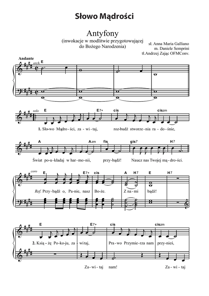 Słowo Mądrości Antyfony (inwokacje w modlitwie przygotowuj"cej do Bo&ego Narodzenia) s!. Anna Maria Galliano m. Daniele Semprini t!.Andrzej Zaj"c OFMConv. # # # # orch. E& % $ ! Andante " #### $ ( ( # # # # solo% % ! ' ( &% ( ( ( ( E 7+ ! )') ' ') ) ' ' & ' ' ' A # # # #coro E' ! ' " #### ! ! #### #### ''' ''' '' '' ''' '' ' ' ' ' ' & Bo-&e. '' '' && ' ' & E 7+ 2. Ksi" - &' Po -ko-ju, za - wi taj, + gis 7 przy -b"d$! ) ') ' ') ') ' ' & ' ' E ' ' ' ' ' ' ' &% ** ** fis E 7+ cis ) ) ) ' ' ' ' ') ' ' & ' ' ' ' ' ' ' & Ref. Przy - b"d$ o, Pa -nie, nasz ciszm roz-bud$ stworze - nia ra - do - #nie, A zm %wiat po-u - k!adaj w har - mo -nii, ( ( cis 1. S!o- wo M"dro - #ci, za - wi - taj, #### , ' ' ' ( ) ' ' ') ' ') ') ' ' & ) ') ' ') ') ' ' & ' ' E ' Za - wi - taj H7 Naucz nas Twojej m" - dro -#ci. A && H7 E && (( Z na - mi && & H7 b"d$! & && (( + + ! ciszm ) ) ' ' ' ' ') ') ' ' & cis Pra - wo Przymie - rza nam przy-nie#, &% nam! , , ' ' ' Za - wi - taj 2 ! ! ! Antyfony #### #### #### " #### ! #### ) ') ' ') ) ' ' & ' ' ' A A 7+ Daj sprawiedliwo#( i zbaw nas. , &% nam! ' ' E '' ' 3 E (( b"d$! " # # # # (( ' ' & && + && & a - (( Z na ( H & & Z na - mi '' '' && ' ' & + + A Bo-&e. & && a6 - ' &% H7 Prawda Twa niechaj w nas p!ynie. + ) ) ) E 7+) cis ' ' ' ' '' '' '' && ' ' ' ' '' '' '' '' '' ' ' ' ' ' gis 7 Przyb"d$! + Ref. Przy- b"d$ o, Pa-nie, nasz ' ' ' ' ' ' * * * * fis - - (( mi (( 1, 2 E (( + H7 b"d$! (( " + %% + %% . E 7+ (( b"d$! . ( ( 3. Ró&d&ko Jessego, zawitaj, Sta) si' pokojem dla ludów, Synów od z!ego uwolnij, Przyb"d$! Twierdz' mi!o#ci w nas zbuduj. 6. Królu Wszech#wiata, zawitaj, Daj pojednanie narodom, Króluj, gdzie mi!o#( si' gubi, Przyb"d$! Sta) si' wierno#ci nagrod". 4. Kluczu Dawida, zawitaj, *a)cuch rozerwij znudzenia, Otwórz nam bramy królestwa, Przyb"d$! Zaszczep w nas nowe spojrzenie. 7. Emmanuelu, zawitaj, B"d$ Bogiem z nami bez ko)ca, Prowad$ nas drog" w#ród #wiata, Przyb"d$! Rozpal nadziej' jak s!o)ce. 5. Gwiazdo Wschodz"ca, zawitaj, Ziemi' rozja#nij swym blaskiem, By nikt nie chodzi! w ciemno#ci, Przyb"d$! Serca nape!nij sw" !ask". 8. Nasza Mi!o#ci, zawitaj, Niebo niech w sercach zago#ci. Naucz, jak kocha( bez ko)ca. Przyb"d$! Roznie( w nas ogie) mi!o#ci. Zamieszczono w serwisie www.giszowiec.org Źródło: „Przybądź Panie” -Anna Maria Galliano - Daniele Semprini Pieśni liturgiczne na Adwent, Edycja Paulińska