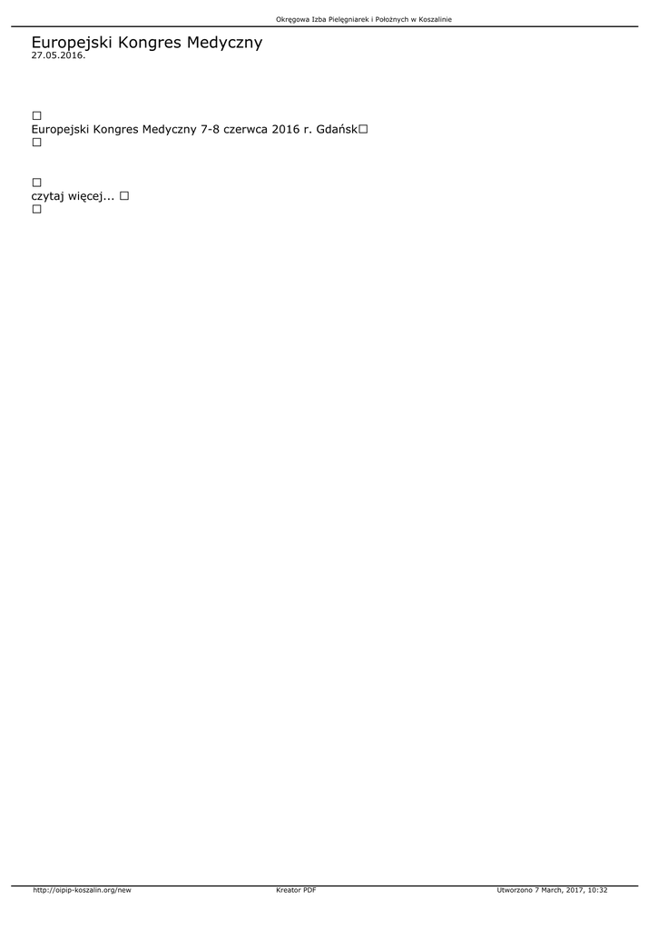 Okręgowa Izba Pielęgniarek i Położnych w Koszalinie Europejski Kongres Medyczny 27.05.2016. Europejski Kongres Medyczny 7-8 czerwca 2016 r. Gdańsk czytaj więcej... http://oipip-koszalin.org/new Kreator PDF Utworzono 7 March, 2017, 10:32