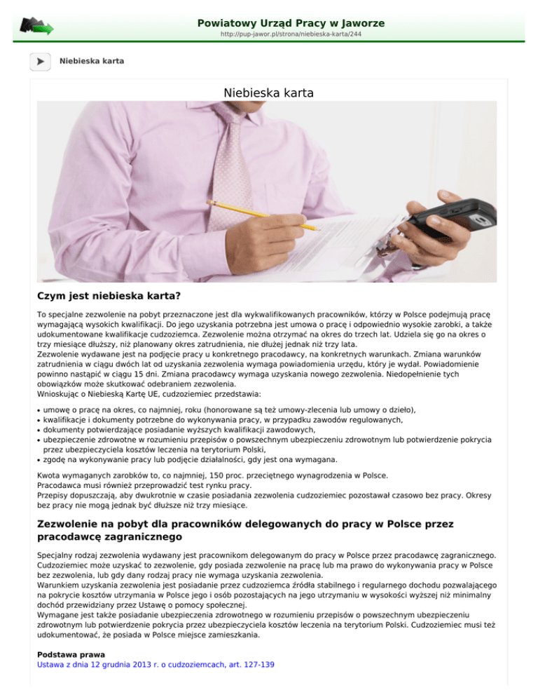 Powiatowy Urząd Pracy w Jaworze http://pup-jawor.pl/strona/niebieska-karta/244 Niebieska karta Niebieska karta Czym jest niebieska karta? To specjalne zezwolenie na pobyt przeznaczone jest dla wykwalifikowanych pracowników, którzy w Polsce podejmują pracę wymagającą wysokich kwalifikacji. Do jego uzyskania potrzebna jest umowa o pracę i odpowiednio wysokie zarobki, a także udokumentowane kwalifikacje cudzoziemca. Zezwolenie można otrzymać na okres do trzech lat. Udziela się go na okres o trzy miesiące dłuższy, niż planowany okres zatrudnienia, nie dłużej jednak niż trzy lata. Zezwolenie wydawane jest na podjęcie pracy u konkretnego pracodawcy, na konkretnych warunkach. Zmiana warunków zatrudnienia w ciągu dwóch lat od uzyskania zezwolenia wymaga powiadomienia urzędu, który je wydał. Powiadomienie powinno nastąpić w ciągu 15 dni. Zmiana pracodawcy wymaga uzyskania nowego zezwolenia. Niedopełnienie tych obowiązków może skutkować odebraniem zezwolenia. Wnioskując o Niebieską Kartę UE, cudzoziemiec przedstawia: ● ● ● ● ● umowę o pracę na okres, co najmniej, roku (honorowane są też umowy-zlecenia lub umowy o dzieło), kwalifikacje i dokumenty potrzebne do wykonywania pracy, w przypadku zawodów regulowanych, dokumenty potwierdzające posiadanie wyższych kwalifikacji zawodowych, ubezpieczenie zdrowotne w rozumieniu przepisów o powszechnym ubezpieczeniu zdrowotnym lub potwierdzenie pokrycia przez ubezpieczyciela kosztów leczenia na terytorium Polski, zgodę na wykonywanie pracy lub podjęcie działalności, gdy jest ona wymagana. Kwota wymaganych zarobków to, co najmniej, 150 proc. przeciętnego wynagrodzenia w Polsce. Pracodawca musi również przeprowadzić test rynku pracy. Przepisy dopuszczają, aby dwukrotnie w czasie posiadania zezwolenia cudzoziemiec pozostawał czasowo bez pracy. Okresy bez pracy nie mogą jednak być dłuższe niż trzy miesiące. Zezwolenie na pobyt dla pracowników delegowanych do pracy w Polsce przez pracodawcę zagranicznego Specjalny rodzaj zezwolenia wydawany jest pracownikom delegowanym do pracy w Polsce przez pracodawcę zagranicznego. Cudzoziemiec może uzyskać to zezwolenie, gdy posiada zezwolenie na pracę lub ma prawo do wykonywania pracy w Polsce bez zezwolenia, lub gdy dany rodzaj pracy nie wymaga uzyskania zezwolenia. Warunkiem uzyskania zezwolenia jest posiadanie przez cudzoziemca źródła stabilnego i regularnego dochodu pozwalającego na pokrycie kosztów utrzymania w Polsce jego i osób pozostających na jego utrzymaniu w wysokości wyższej niż minimalny dochód przewidziany przez Ustawę o pomocy społecznej. Wymagane jest także posiadanie ubezpieczenia zdrowotnego w rozumieniu przepisów o powszechnym ubezpieczeniu zdrowotnym lub potwierdzenie pokrycia przez ubezpieczyciela kosztów leczenia na terytorium Polski. Cudzoziemiec musi też udokumentować, że posiada w Polsce miejsce zamieszkania. Podstawa prawa Ustawa z dnia 12 grudnia 2013 r. o cudzoziemcach, art. 127-139