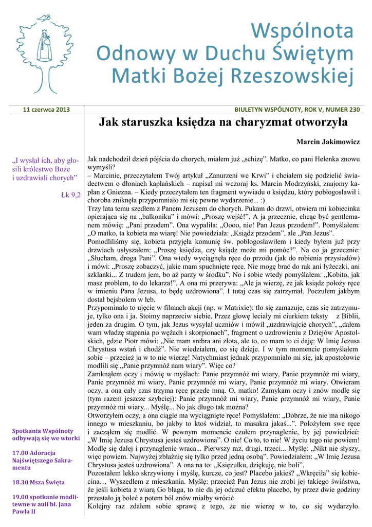 11 czerwca 2013 BIULETYN WSPÓLNOTY, ROK V, NUMER 230 Jak staruszka księdza na charyzmat otworzyła Marcin Jakimowicz Jak nadchodził dzień pójścia do chorych, miałem już „schizę”. Matko, co pani Helenka znowu wymyśli? – Marcinie, przeczytałem Twój artykuł „Zanurzeni we Krwi” i chciałem się podzielić świadectwem o dłoniach kapłańskich – napisał mi wczoraj ks. Marcin Modrzyński, znajomy kapłan z Gniezna. – Kiedy przeczytałem ten fragment wywiadu o księdzu, który pobłogosławił i Łk 9,2 choroba zniknęła przypomniało mi się pewne wydarzenie... :) Trzy lata temu szedłem z Panem Jezusem do chorych. Pukam do drzwi, otwiera mi kobiecinka opierająca się na „balkoniku” i mówi: „Proszę wejść!”. A ja grzecznie, chcąc być gentlemanem mówię: „Pani przodem”. Ona wypaliła: „Oooo, nie! Pan Jezus przodem!”. Pomyślałem: „O matko, ta kobieta ma wiarę! Nie powiedziała: „Ksiądz przodem”, ale „Pan Jezus”. Pomodliliśmy się, kobieta przyjęła komunię św. pobłogosławiłem i kiedy byłem już przy drzwiach usłyszałem: „Proszę księdza, czy ksiądz może mi pomóc?”. Na co ja grzecznie: „Słucham, droga Pani”. Ona wtedy wyciągnęła ręce do przodu (jak do robienia przysiadów) i mówi: „Proszę zobaczyć, jakie mam spuchnięte ręce. Nie mogę brać do rąk ani łyżeczki, ani szklanki... Z trudem jem, bo aż parzy w środku”. No i sobie wtedy pomyślałem: „Kobito, jak masz problem, to do lekarza!”. A ona mi przerywa: „Ale ja wierzę, że jak ksiądz położy ręce w imieniu Pana Jezusa, to będę uzdrowiona”. I tutaj czas się zatrzymał. Poczułem jakbym dostał bejsbolem w łeb. Przypominało to ujęcie w filmach akcji (np. w Matrixie): tło się zamazuje, czas się zatrzymuje, tylko ona i ja. Stoimy naprzeciw siebie. Przez głowę leciały mi ciurkiem teksty z Biblii, jeden za drugim. O tym, jak Jezus wysyłał uczniów i mówił „uzdrawiajcie chorych”, „dałem wam władzę stąpania po wężach i skorpionach”, fragment o uzdrowieniu z Dziejów Apostolskich, gdzie Piotr mówi: „Nie mam srebra ani złota, ale to, co mam to ci daję: W Imię Jezusa Chrystusa wstań i chodź”. Nie wiedziałem, co się dzieje. I w tym momencie pomyślałem sobie – przecież ja w to nie wierzę! Natychmiast jednak przypomniało mi się, jak apostołowie modlili się „Panie przymnóż nam wiary”. Więc co? Zamknąłem oczy i mówię w myślach: Panie przymnóż mi wiary, Panie przymnóż mi wiary, Panie przymnóż mi wiary, Panie przymnóż mi wiary, Panie przymnóż mi wiary. Otwieram oczy, a ona cały czas trzyma ręce przede mną. O, matko! Zamykam oczy i znów modlę się (tym razem jeszcze szybciej): Panie przymnóż mi wiary, Panie przymnóż mi wiary, Panie przymnóż mi wiary... Myślę... No jak długo tak można? Otworzyłem oczy, a ona ciągle ma wyciągnięte ręce! Pomyślałem: „Dobrze, że nie ma nikogo innego w mieszkaniu, bo jakby to ktoś widział, to masakra jakaś...”. Położyłem swe ręce Spotkania Wspólnoty i zacząłem się modlić. W pewnym momencie czułem przynaglenie, by jej powiedzieć: odbywają się we wtorki „W Imię Jezusa Chrystusa jesteś uzdrowiona”. O nie! Co to, to nie! W życiu tego nie powiem! Modlę się dalej i przynaglenie wraca... Pierwszy raz, drugi, trzeci... Myślę: „Nikt nie słyszy, 17.00 Adoracja więc powiem. Najwyżej zbłaźnię się tylko przed jedną osobą”. Powiedziałem: „W Imię Jezusa Najświętszego SakraChrystusa jesteś uzdrowiona”. A ona na to: „Księżulku, dziękuję, nie boli”. mentu Pozostałem lekko skrzywiony i myślę, kurcze, co jest? Placebo jakieś? „Wkręciła” się kobiecina… Wyszedłem z mieszkania. Myślę: przecież Pan Jezus nie zrobi jej takiego świństwa, 18.30 Msza Święta że jeśli kobieta z wiarą Go błaga, to nie da jej odczuć efektu placebo, by przez dwie godziny 19.00 spotkanie modli- przestało ją boleć a potem ból znów miałby wrócić. tewne w auli bł. Jana Kolejny raz zdałem sobie sprawę z tego, że nie wierzę w to, co się wydarzyło. „I wysłał ich, aby głosili królestwo Boże i uzdrawiali chorych” Pawła II Odpowiedzialni za Wspólnotę o. Wiktor Tokarski OFM pasterz tel. 17.853.34.95 w. 125 Marta F. lider Wiesława M. v-ce lider Jacek F. v-ce lider Animatorzy Diakonii Barbara K. diakonia adoracyjna Marta F. diakonia prorocka Jacek F. diakonia modlitwy wstawienniczej i uwolnienia Agnieszka R. diakonia nauczania Jolanta S. diakonia uwielbienia Barbara S. diakonia miłosierdzia Anna O. diakonia wprowadzająca dla kobiet Paweł K. diakonia wprowadzająca dla mężczyzn Wiesława M. diakonia organizacyjna Daniel Ch. diakonia porządkowa Marta F. diakonia medialna Dane fundacji: Fundacja Charismata im. św. Pawła Apostoła ul. Sokoła 8 35-010 Rzeszów KRS: 0000431262 NIP: 813-36-74-368 REGON: 180881469 Konto bankowe: 91 9096 0004 2012 0064 7957 0002 Ale przypomniało mi się, że św. Tereska mówiła „Wierzę, bo chcę wierzyć”. No też chcę, ale jakoś tak mi dziwnie... Słyszałem kiedyś, że trzeba zrobić w takich sytuacjach krok wiary... Pomyślałem: „Co może być takim krokiem wiary? Wiem! Opowiem o tej sytuacji na niedzielnym kazaniu!” Powiedziałem. Ludzie w kościele pootwierali usta ze zdumienia. Co ten ksiądz gada? Rozglądali się dookoła, patrzyli jeden na drugiego, szturchali... Kosmos. Spociłem się jak mops. No, Panie Jezu: masz pajaca! A niech się śmieją! Dziwnym trafem tego kazania słuchała sąsiadka tej uzdrowionej kobietki, która domyślając się, o kogo chodzi, po kazaniu nie omieszkała sprawdzić, co się działo. Przyszła do mnie po dwóch dniach do zakrystii przynosząc mi pozdrowienia od Pani Helenki, która potwierdziła uzdrowienie, mówiła, że nadal nic ją nie boli i zaprasza mnie na kawę :) Wybrałem się do niej na kawkę. Ledwo wszedłem a ona wypaliła: „Ojczulku (tak teraz będę do księdza m