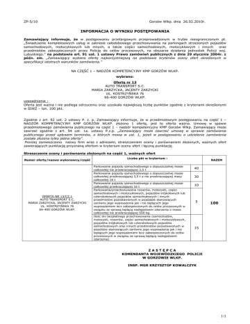 ZP-5/10 Gorzów Wlkp. dnia 26.02.2010r. INFORMACJA O WYNIKU POSTĘPOWANIA Zamawiający informuje, Ŝe w postępowaniu przetargowym przeprowadzonym w trybie nieograniczonym pt. „Świadczenie kompleksowych usług w zakresie całodobowego przechowywania na parkingach strzeŜonych pojazdów samochodowych, motocyklowych lub innych, a takŜe części samochodowych, motocyklowych i innych oraz przedmiotów zabezpieczonych przez Policję do celów procesowych, na obszarze działania jednostek Policji woj. Lubuskiego.” na podstawie art. 91 ust. 1 ustawy Prawo zamówień publicznych z dnia 29 stycznia 2004r. z późn. zm. „Zamawiający wybiera ofertę najkorzystniejszą na podstawie kryteriów oceny ofert określonych w specyfikacji istotnych warunków zamówienia.” NA CZĘŚĆ 1 – NADZÓR KOMPETENCYJNY KMP GORZÓW WLKP. wybrano: Ofertę nr 13 AUTO TRANSPORT S.C. MARIA ZARZYCKA, JACENTY ZARZYCKI UL. KOSTRZYŃSKA 76 66-400 GORZÓW WLKP. uzasadnienie : Oferta jest waŜna i nie podlega odrzuceniu oraz uzyskała największą liczbę punktów zgodnie z kryteriami określonymi w SIWZ – tzn. 100 pkt. Zgodnie z art. 92 ust. 2 ustawy P. z. p. Zamawiający informuje, Ŝe w przedmiotowym postępowaniu na część 1 – NADZÓR KOMPETENCYJNY KMP GORZÓW WLKP. złoŜono 1 ofertę, jest to oferta waŜna. Umowę w spawie przedmiotowego zamówienia publicznego na część 1 – nadzór kompetencyjny KMP Gorzów Wlkp. Zamawiający moŜe zawrzeć zgodnie z art. 94 ust. 1a. ustawy P.z.p. „Zamawiający moŜe zawrzeć umowę w sprawie zamówienia publicznego przed upływem terminów, o których mowa w ust. 1, jeŜeli w postępowaniu o udzielenie zamówienia została złoŜona tylko jedna oferta”. PoniŜej zamieszczono nazwy firm wraz z adresami, streszczeniem oceny i porównaniem złoŜonych, waŜnych ofert zawierających punktację przyznaną ofertom w kryterium oceny ofert i łączną punktację. Streszczenie oceny i porównania złoŜonych na część 1, waŜnych ofert Numer oferty/nazwa wykonawcy/część OFERTA NR 13/CZ.1 AUTO TRANSPORT S.C. MARIA ZARZYCKA, JACENTY ZARZYCKI UL. KOSTRZYŃSKA 76 66-400 GORZÓW WLKP. Liczba pkt w kryterium : Parkowanie pojazdu samochodowego o dopuszczalnej masie całkowitej nie przekraczającej 3,5 t Parkowanie pojazdu samochodowego o dopuszczalnej masie całkowitej przekraczającej 3,5 t a nie przekraczającej masy całkowitej 16 t Parkowanie pojazdu samochodowego o dopuszczalnej masie całkowitej przekraczającej 16 t Parkowanie/przechowywanie rowerów, motocykli, części samochodowych i motocyklowych, pojazdów trójkołowych lub czterokołowych pojazdów samochodowych i innych przedmiotów pozostawionych w pojeździe stanowiących zarówno jego wyposaŜenia jak i nie będących jego wyposaŜeniem lecz zabezpieczonych do celów procesowych w związku ze sprawą będącą następstwem zdarzenia o masie całkowitej nie przekraczającej 550 kg. Ilość dni bezpłatnego przechowywania (samochodów, motocykli, rowerów, części samochodowych i motocyklowych, pojazdów trójkołowych lub czterokołowych pojazdów samochodowych oraz innych przedmiotów pozostawionych w pojeździe stanowiących zarówno jego wyposaŜenia jak i nie będących jego wyposaŜeniem lecz zabezpieczonych do celów procesowych w związku ze sprawą będącą następstwem zdarzenia) RAZEM 40 30 10 5 100 15 ZASTĘPCA KOMENDANTA WOJEWÓDZKIEGO POLICJI W GORZOWIE WLKP. INSP. MGR KRZYSZTOF KOWALCZYK 1/1