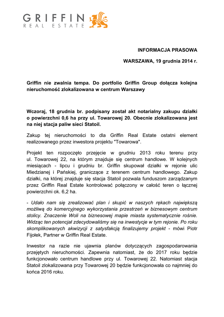 INFORMACJA PRASOWA WARSZAWA, 19 grudnia 2014 r. Griffin nie zwalnia tempa. Do portfolio Griffin Group dołącza kolejna nieruchomość zlokalizowana w centrum Warszawy Wczoraj, 18 grudnia br. podpisany został akt notarialny zakupu działki o powierzchni 0,6 ha przy ul. Towarowej 20. Obecnie zlokalizowana jest na niej stacja paliw sieci Statoil. Zakup tej nieruchomości to dla Griffin Real Estate ostatni element realizowanego przez inwestora projektu "Towarowa". Projekt ten rozpoczęło przejęcie w grudniu 2013 roku terenu przy ul. Towarowej 22, na którym znajduje się centrum handlowe. W kolejnych miesiącach - lipcu i grudniu br. Griffin skupował działki w rejonie ulic Miedzianej i Pańskiej, graniczące z terenem centrum handlowego. Zakup działki, na której znajduje się stacja Statoil pozwala funduszom zarządzanym przez Griffin Real Estate kontrolować połączony w całość teren o łącznej powierzchni ok. 6,2 ha. - Udało nam się zrealizować plan i skupić w naszych rękach największą możliwą do komercyjnego wykorzystania przestrzeń w biznesowym centrum stolicy. Znaczenie Woli na biznesowej mapie miasta systematycznie rośnie. Widząc ten potencjał zdecydowaliśmy się na inwestycje w tym rejonie. Po roku skomplikowanych akwizycji z satysfakcją finalizujemy projekt - mówi Piotr Fijołek, Partner w Griffin Real Estate. Inwestor na razie nie ujawnia planów dotyczących zagospodarowania przejętych nieruchomości. Zapewnia natomiast, że do 2017 roku będzie funkcjonowało centrum handlowe przy ul. Towarowej 22. Natomiast stacja Statoil zlokalizowana przy Towarowej 20 będzie funkcjonowała co najmniej do końca 2016 roku. O GRIFFIN GROUP Griffin Real Estate został założony w 2006 roku jako platforma do zarządzania funduszami inwestującymi w sektor nieruchomości. Od początku istnienia inwestuje w nie także swój własny kapitał. W marcu 2013 roku Griffin pozyskał inwestora strategicznego – Oaktree Capital Management, z którym współpracuje od 2010 roku. Oaktree jest funduszem hedgingowym wywodzącym się z USA. Posiada biura na całym świecie, zatrudnia ponad 650 osób oraz zarządza środkami w wysokości prawie 90 miliardów dolarów. Griffin to wiodący inwestor na polskim rynku nieruchomości, który w imieniu zarządzanych przez siebie Funduszy, aktywnie lokuje środki w różnorodne projekty. Celem strategicznym jest zbudowanie w ciągu kilku lat unikatowego portfela nieruchomości. W portfolio grupy Griffin znajduje się obecnie m.in. Hala Koszyki w Warszawie, Dom Handlowy Renoma we Wrocławiu, Supersam w Katowicach oraz inne obiekty biurowe i handlowe, a także działki inwestycyjne. Griffin, jako społecznie odpowiedzialna firma wspiera liczne inicjatywy, w tym Fundację Edukacyjną Jana Karskiego. W obiektach należących do Funduszy zarządzanych przez Griffin realizowane są również projekty artystyczne, inicjowane przez Griffin Art Space, instytucję powołaną, aby wspierać sztukę i promować jej obecność w przestrzeni publicznej.