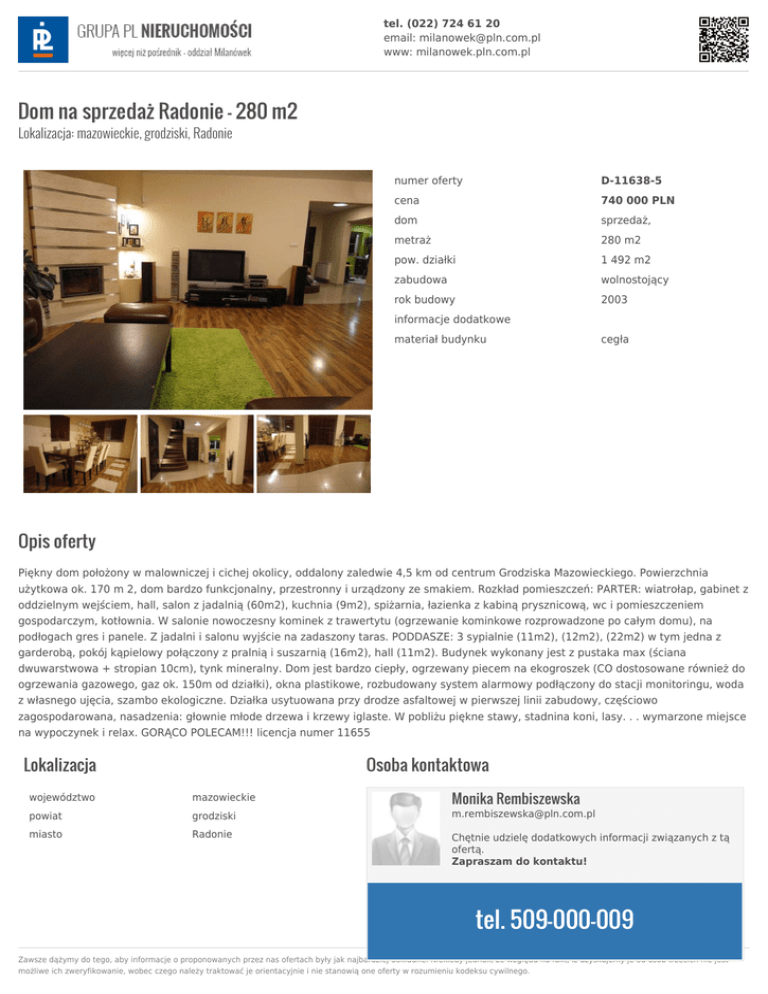 tel. (022) 724 61 20 email: [email protected] www: milanowek.pln.com.pl Dom na sprzedaż Radonie - 280 m2 Lokalizacja: mazowieckie, grodziski, Radonie numer oferty D-11638-5 cena 740 000 PLN dom sprzedaż, metraż 280 m2 pow. działki 1 492 m2 zabudowa wolnostojący rok budowy 2003 informacje dodatkowe materiał budynku cegła Opis oferty Piękny dom położony w malowniczej i cichej okolicy, oddalony zaledwie 4,5 km od centrum Grodziska Mazowieckiego. Powierzchnia użytkowa ok. 170 m 2, dom bardzo funkcjonalny, przestronny i urządzony ze smakiem. Rozkład pomieszczeń: PARTER: wiatrołap, gabinet z oddzielnym wejściem, hall, salon z jadalnią (60m2), kuchnia (9m2), spiżarnia, łazienka z kabiną prysznicową, wc i pomieszczeniem gospodarczym, kotłownia. W salonie nowoczesny kominek z trawertytu (ogrzewanie kominkowe rozprowadzone po całym domu), na podłogach gres i panele. Z jadalni i salonu wyjście na zadaszony taras. PODDASZE: 3 sypialnie (11m2), (12m2), (22m2) w tym jedna z garderobą, pokój kąpielowy połączony z pralnią i suszarnią (16m2), hall (11m2). Budynek wykonany jest z pustaka max (ściana dwuwarstwowa + stropian 10cm), tynk mineralny. Dom jest bardzo ciepły, ogrzewany piecem na ekogroszek (CO dostosowane również do ogrzewania gazowego, gaz ok. 150m od działki), okna plastikowe, rozbudowany system alarmowy podłączony do stacji monitoringu, woda z własnego ujęcia, szambo ekologiczne. Działka usytuowana przy drodze asfaltowej w pierwszej linii zabudowy, częściowo zagospodarowana, nasadzenia: głownie młode drzewa i krzewy iglaste. W pobliżu piękne stawy, stadnina koni, lasy. . . wymarzone miejsce na wypoczynek i relax. GORĄCO POLECAM!!! licencja numer 11655 Lokalizacja Osoba kontaktowa Monika Rembiszewska województwo mazowieckie powiat grodziski [email protected] miasto Radonie Chętnie udzielę dodatkowych informacji związanych z tą ofertą. Zapraszam do kontaktu! tel. 509-000-009 Zawsze dążymy do tego, aby informacje o proponowanych przez nas ofertach były jak najbardziej dokładne. Niekiedy jednak, ze względu na fakt, iż uzyskujemy je od osób trzecich nie jest możliwe ich zweryfikowanie, wobec czego należy traktować je orientacyjnie i nie stanowią one oferty w rozumieniu kodeksu cywilnego.